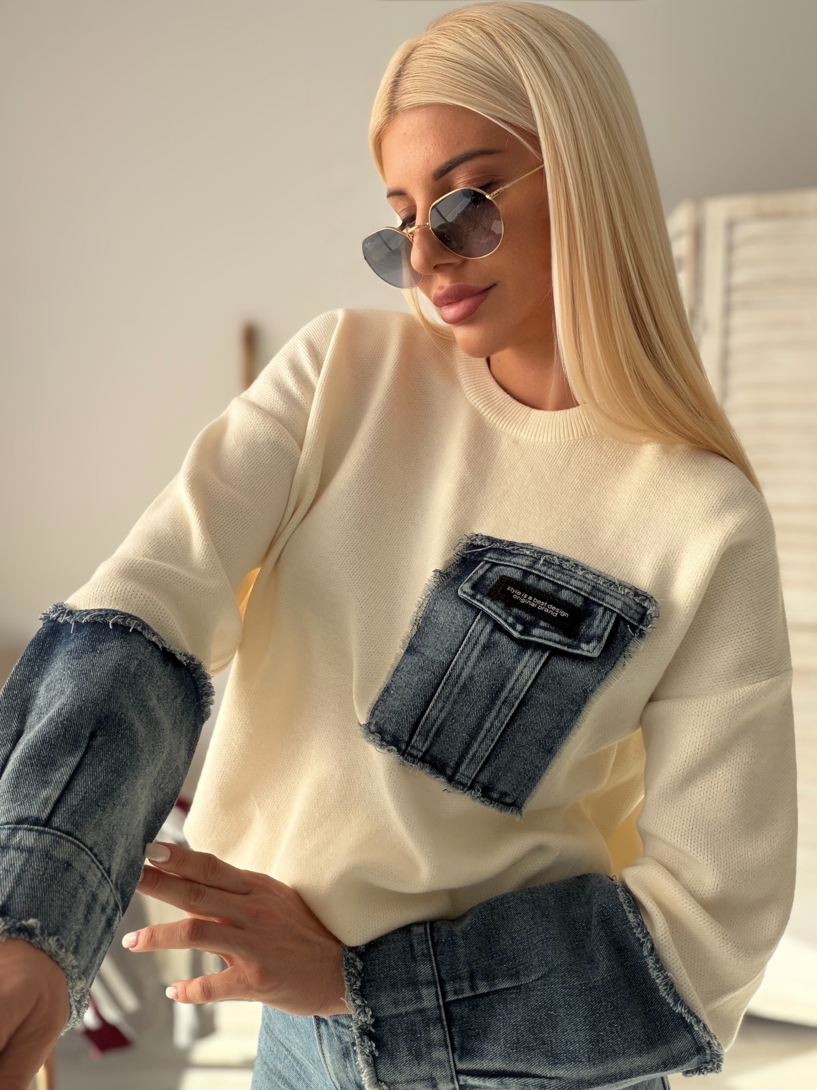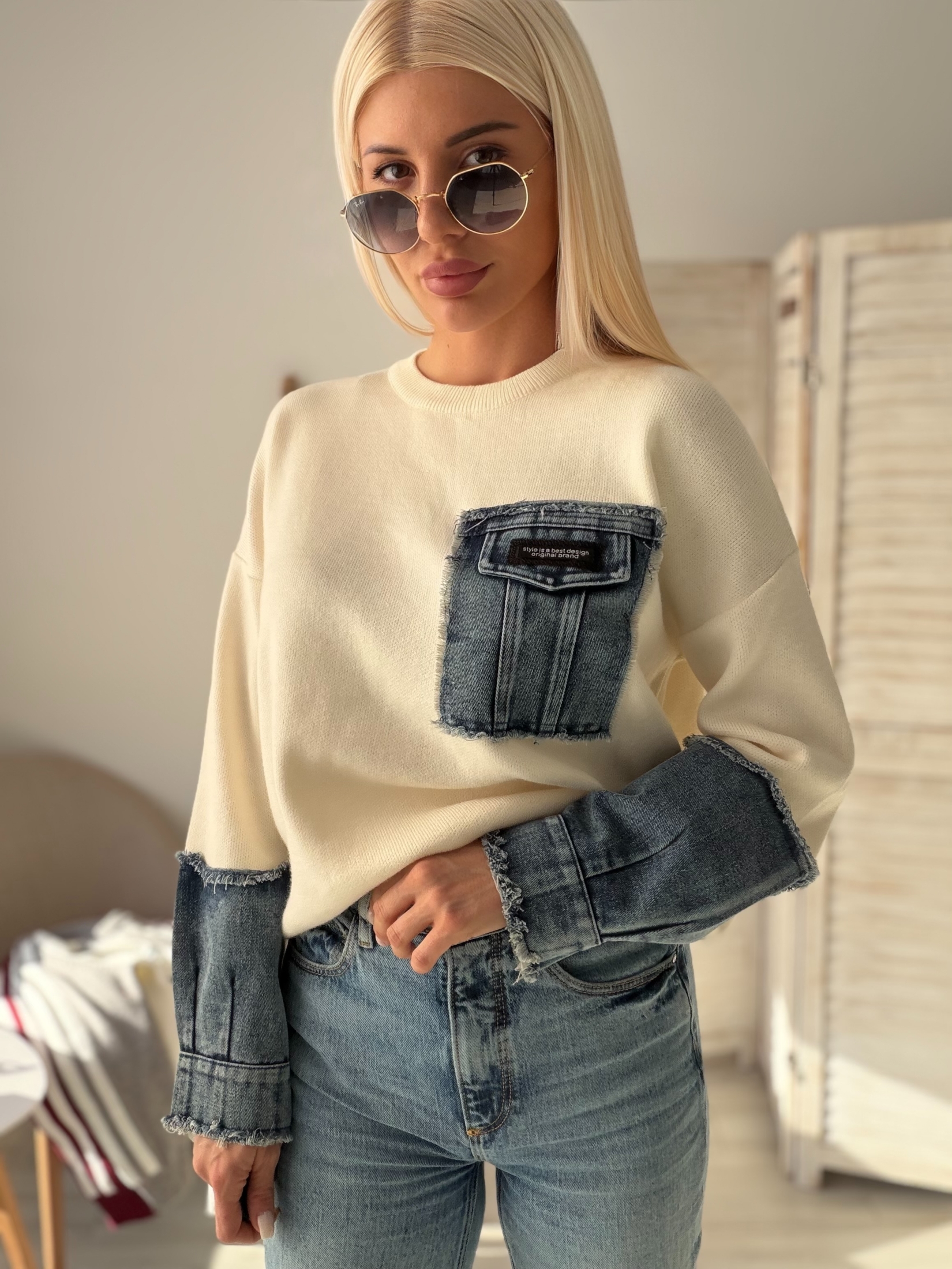 Този пуловер екрю е перфектната комбинация от комфорт и стил. Със своите деним елементи, той придава уникален и модерен вид на вашата визия. Идеален за ежедневна употреба, осигурява топлина и удобство през студените дни.