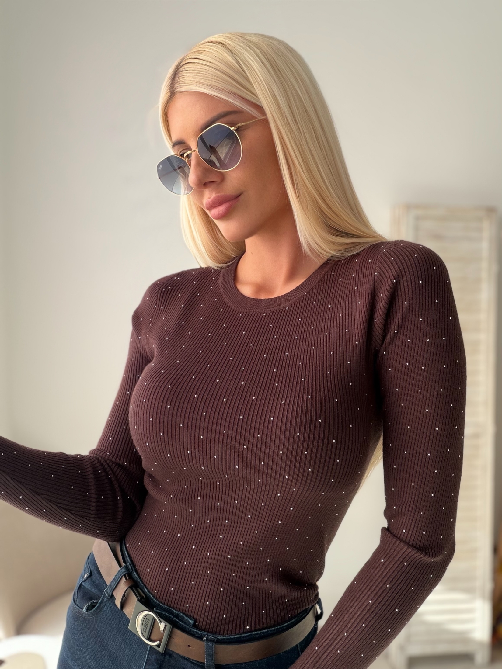 Представяме ви нашия елегантен кафяв пуловер по тялото с камъни, перфектното допълнение към вашия гардероб. Този пуловер съчетава комфорт и стил, като едновременно с това привлича вниманието с изисканите си детайли.