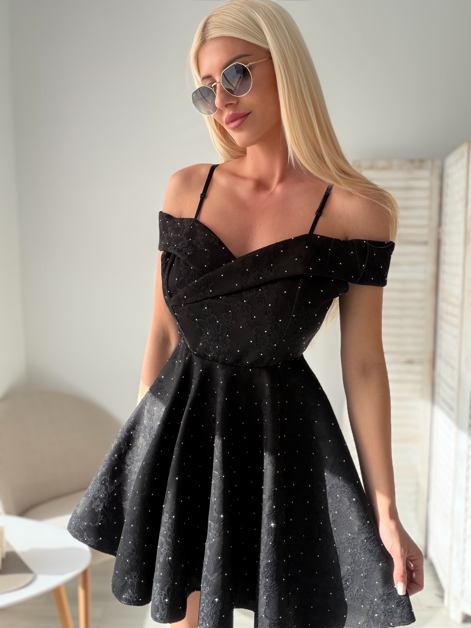 Изискана и стилна, тази разкроена черна рокля с камъни е перфектният избор за всяка дама, която иска да изглежда елегантно и да се чувства комфортно. Подходяща както за специални поводи, така и за по-официални събития, тази рокля ще ви осигури неповторим вид и самочувствие.