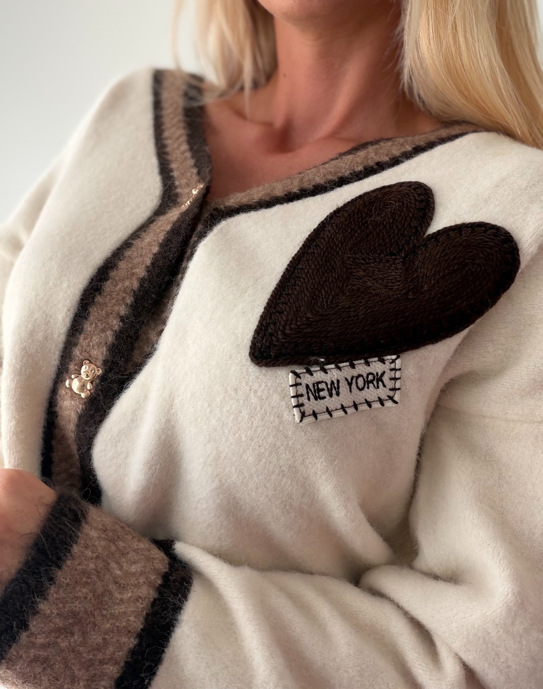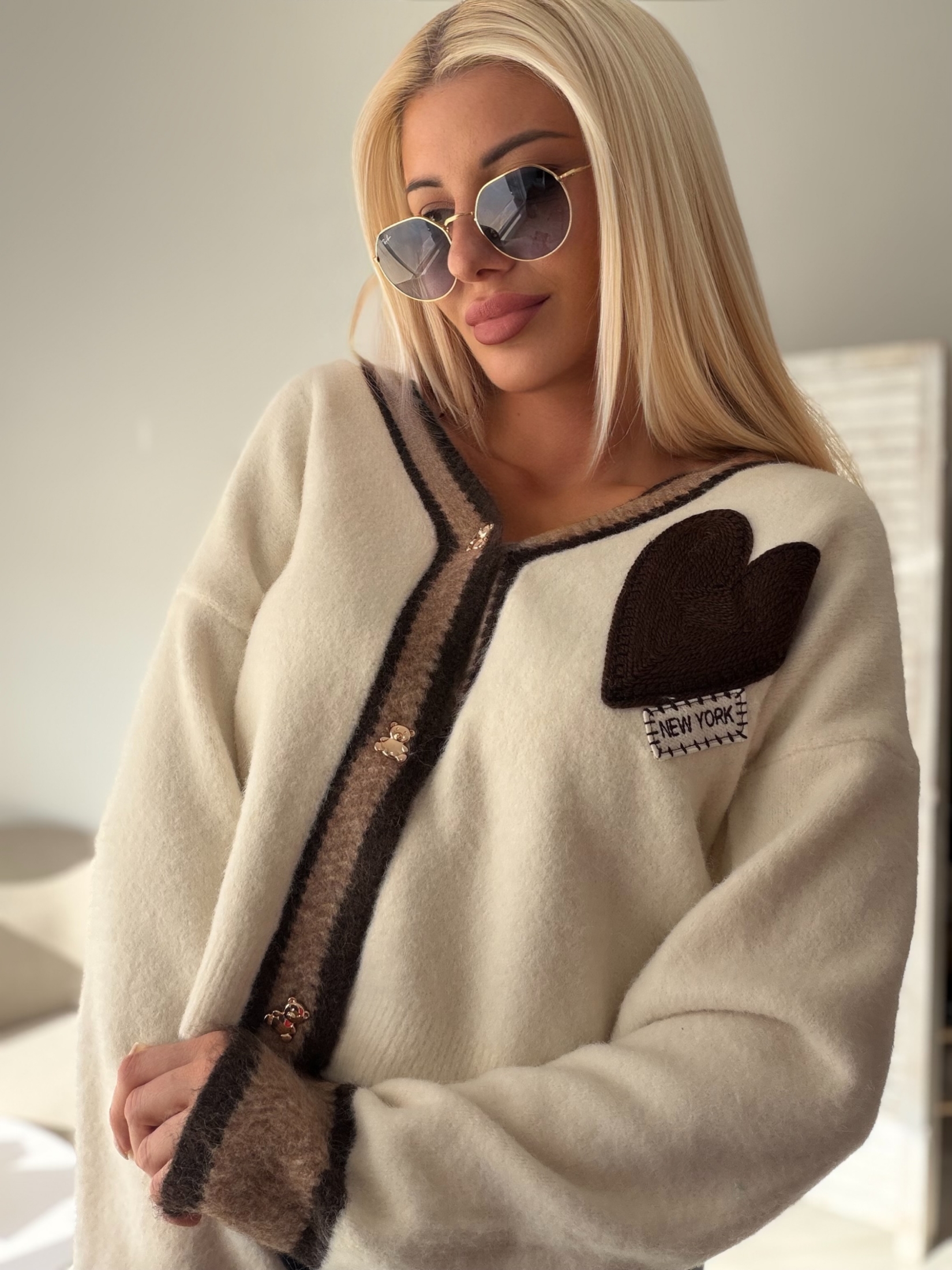 Изработена от висококачествена, мека и топла материя, тази жилетка ще ви обгърне с уют през хладните дни. Дизайнът включва очарователно сърце, внимателно изплетено в предната част, което придава уникален и закачлив вид. Кройката е удобна и позволява свобода на движение, като същевременно подчертава вашата женственост.
