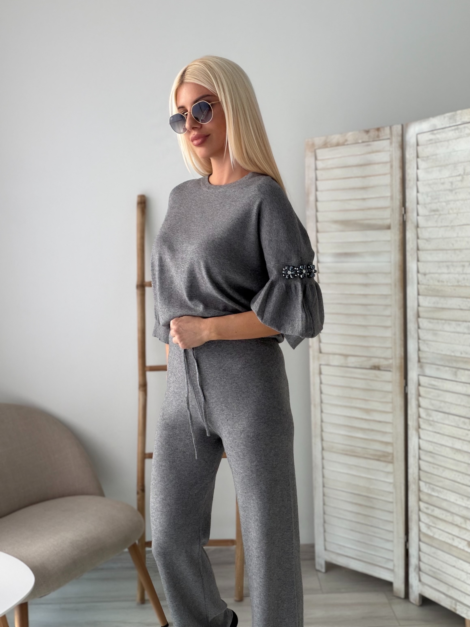 Открийте съвършената комбинация от стил и комфорт с нашия изискан сив комплект, деликатно украсен с камъни на ръкава. Този комплект е идеалният избор за дамите, които ценят елегантната визия и желаят да добавят нотка лукс към ежедневния си или специален повод облекло.