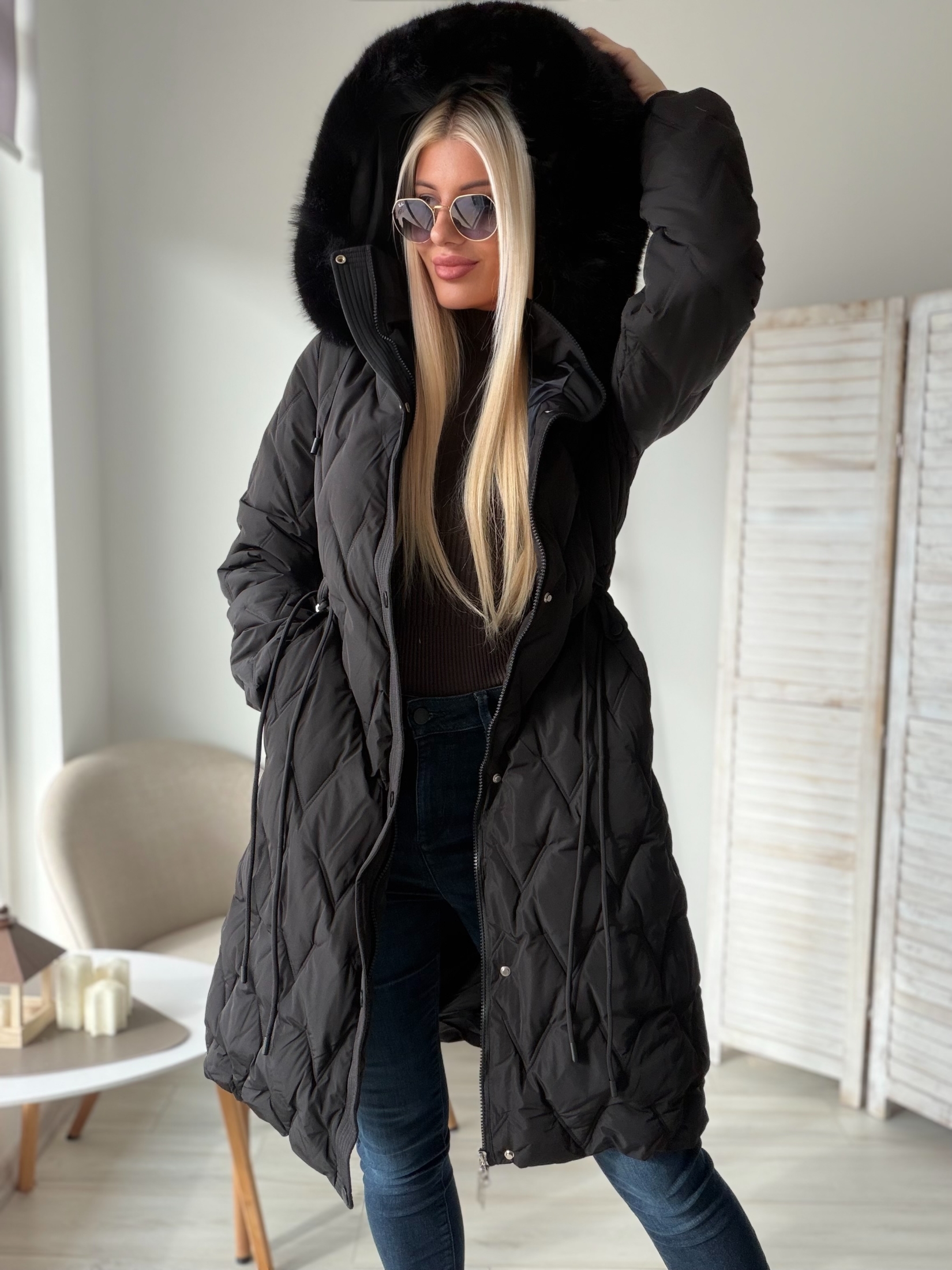 Открийте елегантност и топлина с нашето черно дълго яке с пристягане!