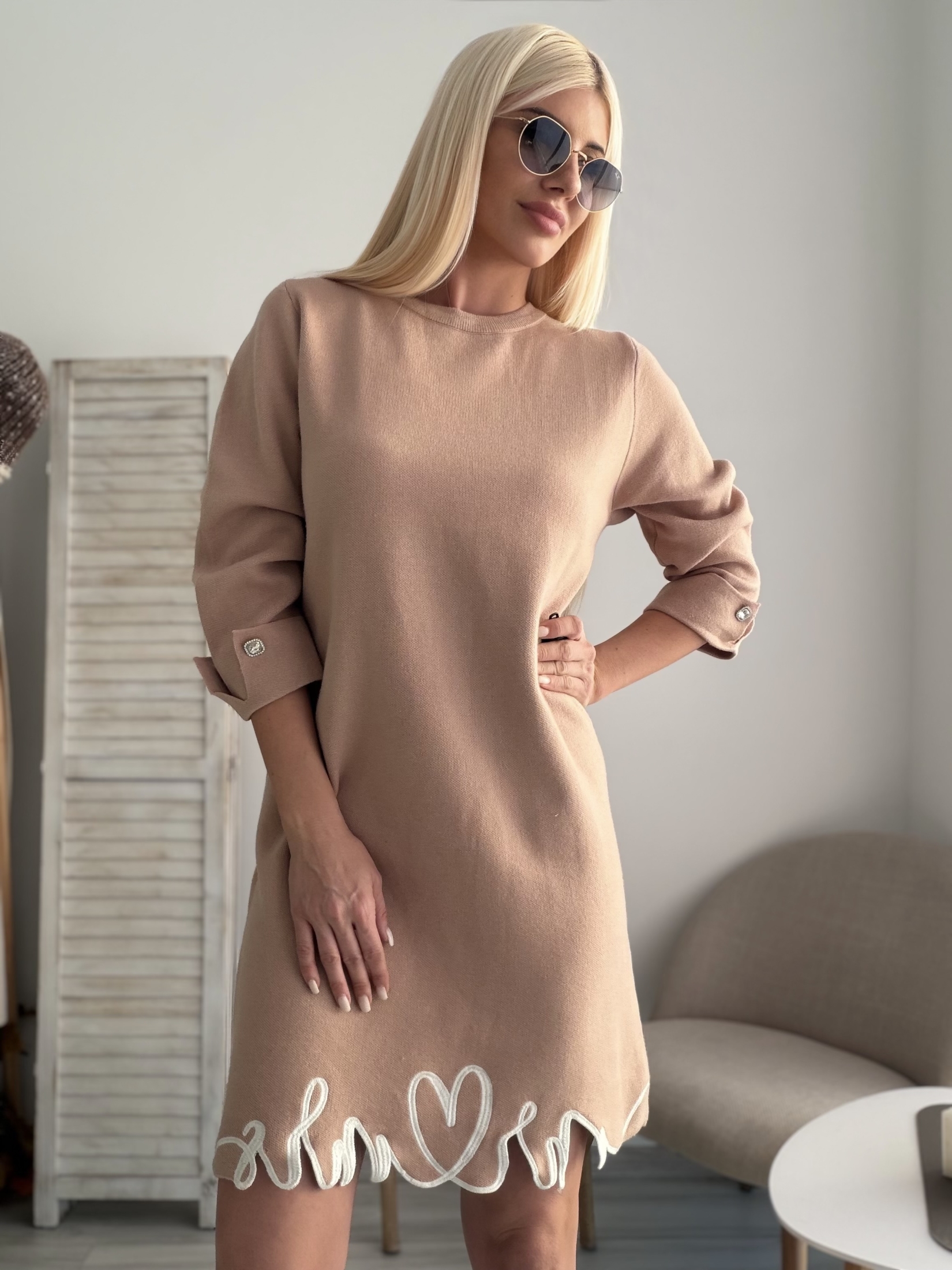 Роклята е изработена от висококачествена, мека и приятна на допир плетена материя, която осигурява топлина и комфорт през целия ден. Бежовият цвят придава изисканост и лесно се комбинира с различни аксесоари и обувки. Надписите добавят закачлив и модерен вид, който отличава тази рокля от обикновените модели.