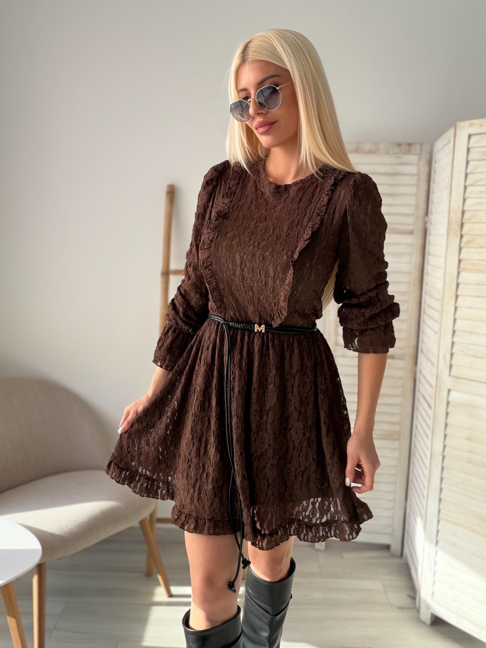 Потопете се в елегантност с нашата кафява рокля с дантела! Тази изящна рокля е перфектният избор за всяка дама, която цени стила и комфорта.