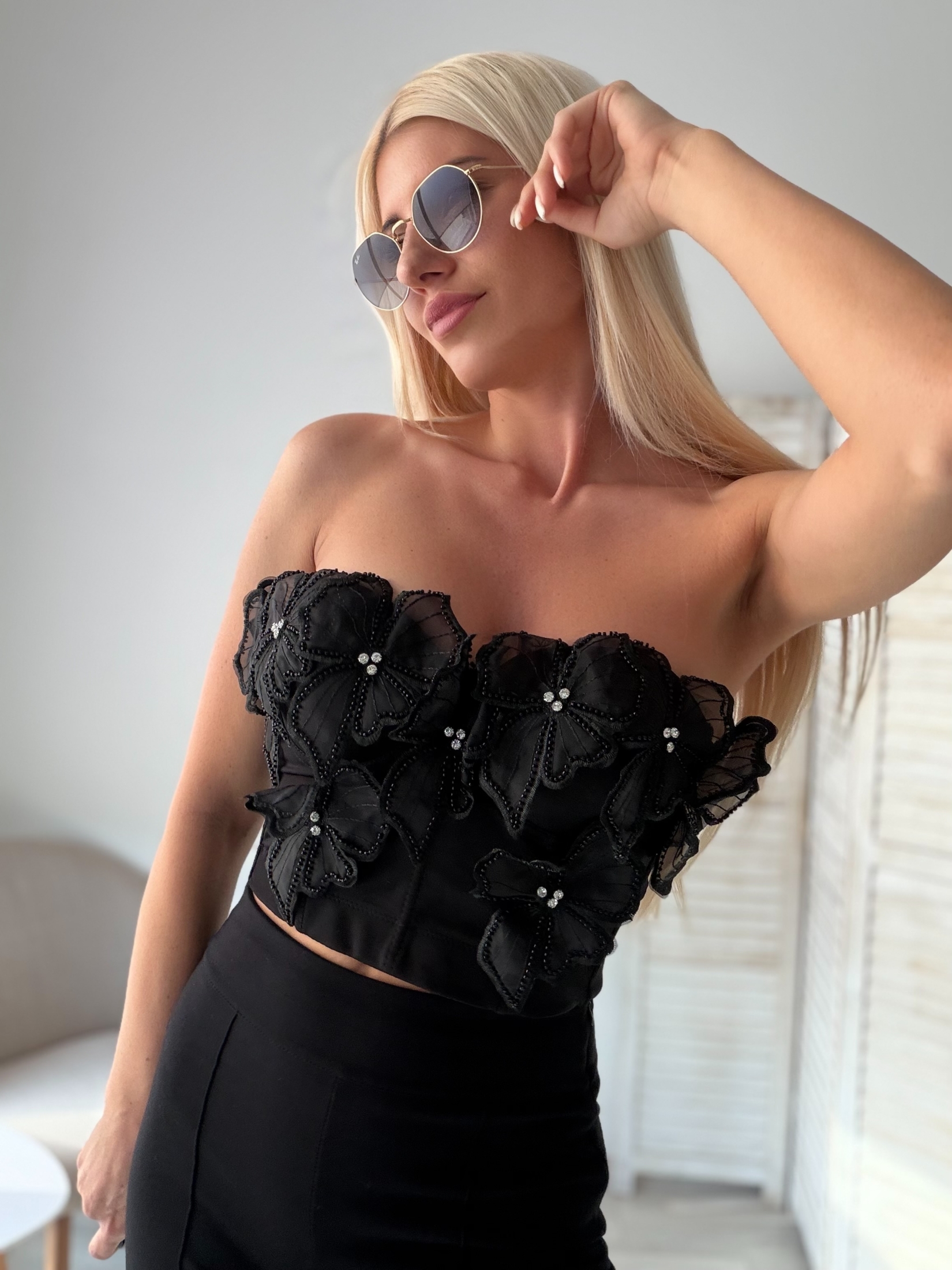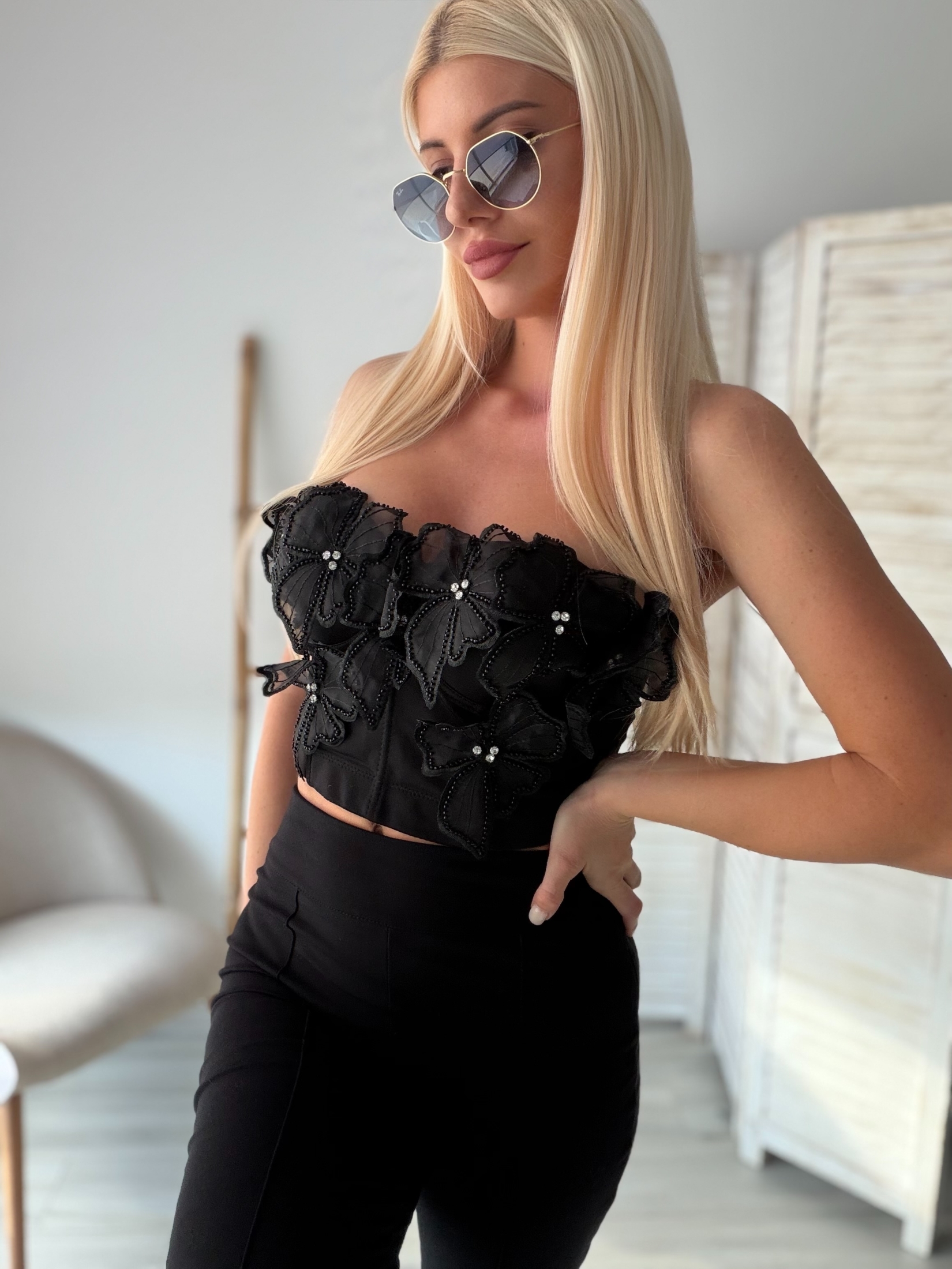 Изискано бюстие с нежни черни цветя, идеално за специални поводи или за да добавите елегантност към ежедневния си стил. Подчертава силуета и осигурява комфорт.