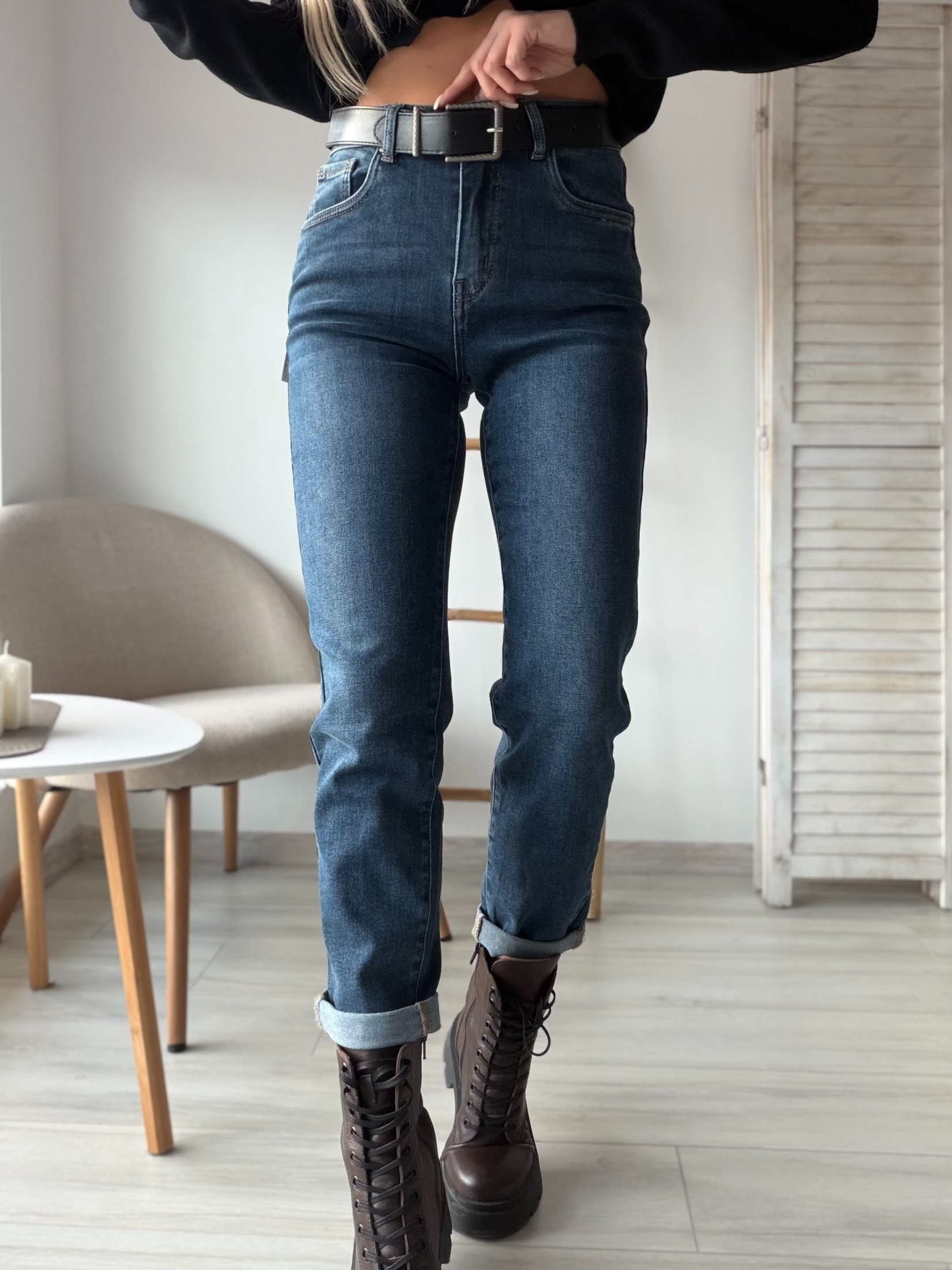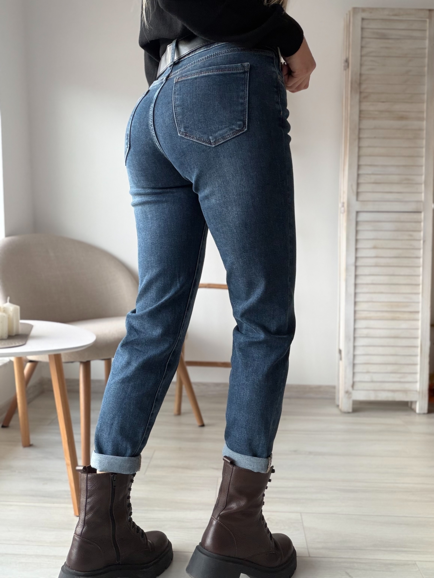 Добавете тези сини дънки мамфит с черен колан към своята колекция и се насладете на комфорт, стил и универсалност във всеки ваш тоалет!