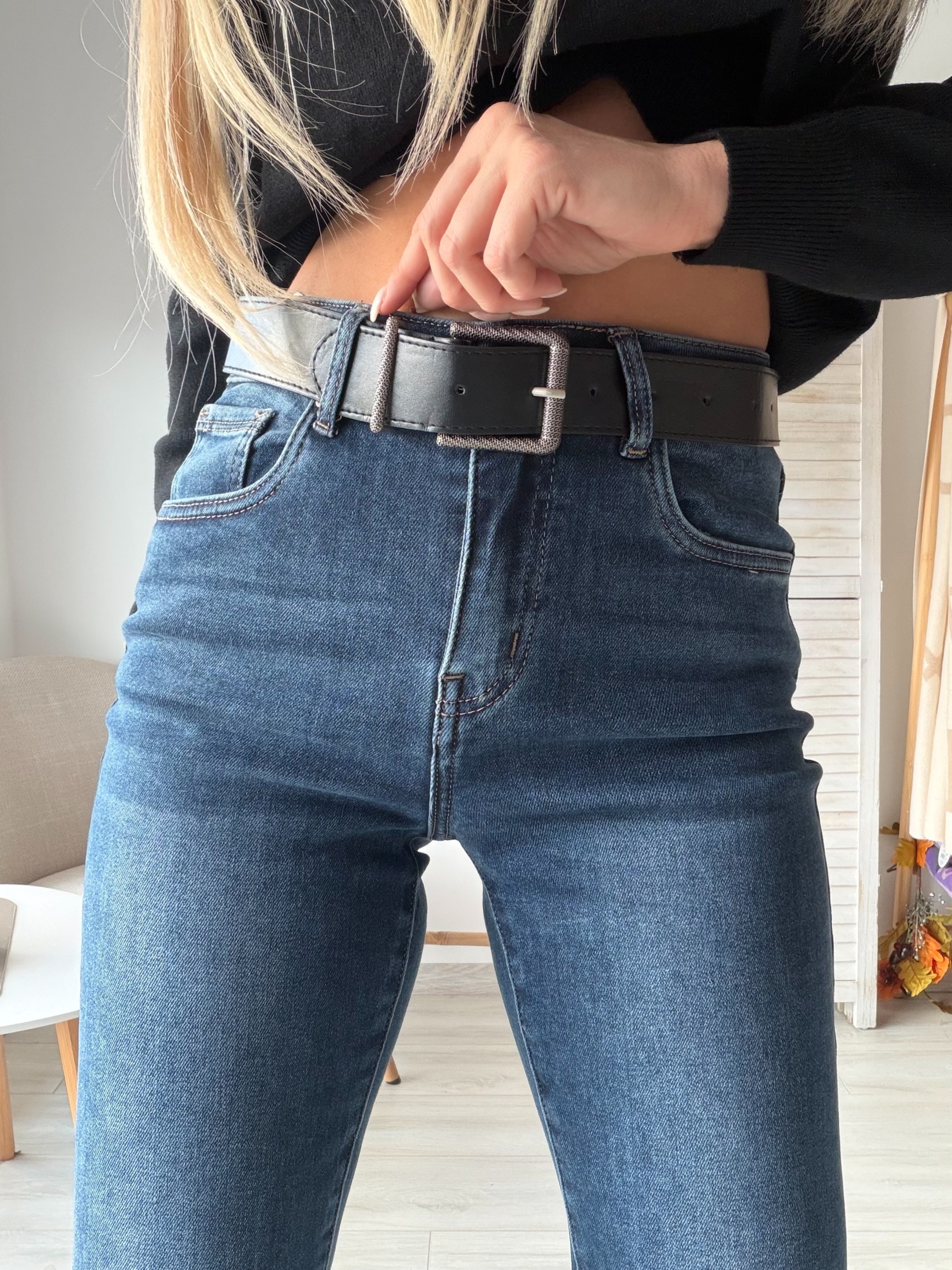 Акцент върху детайлите: Черният колан добавя елегантен акцент към класическия син деним. Той не само подчертава талията, но и придава завършен вид на вашата визия.