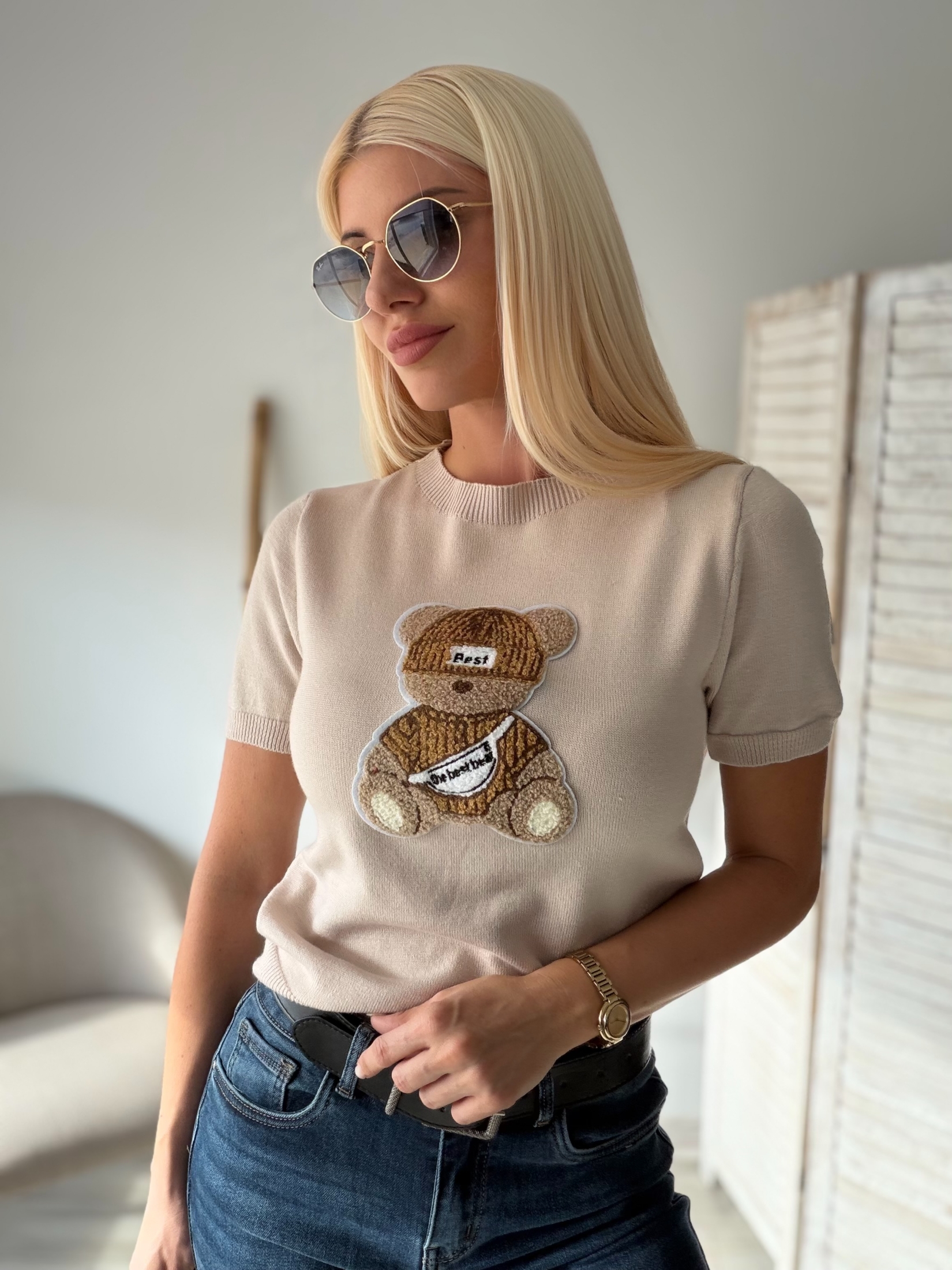 Подарете на вашето дете комфорт и стил с нашата тениска от плетиво с мече в бежово!