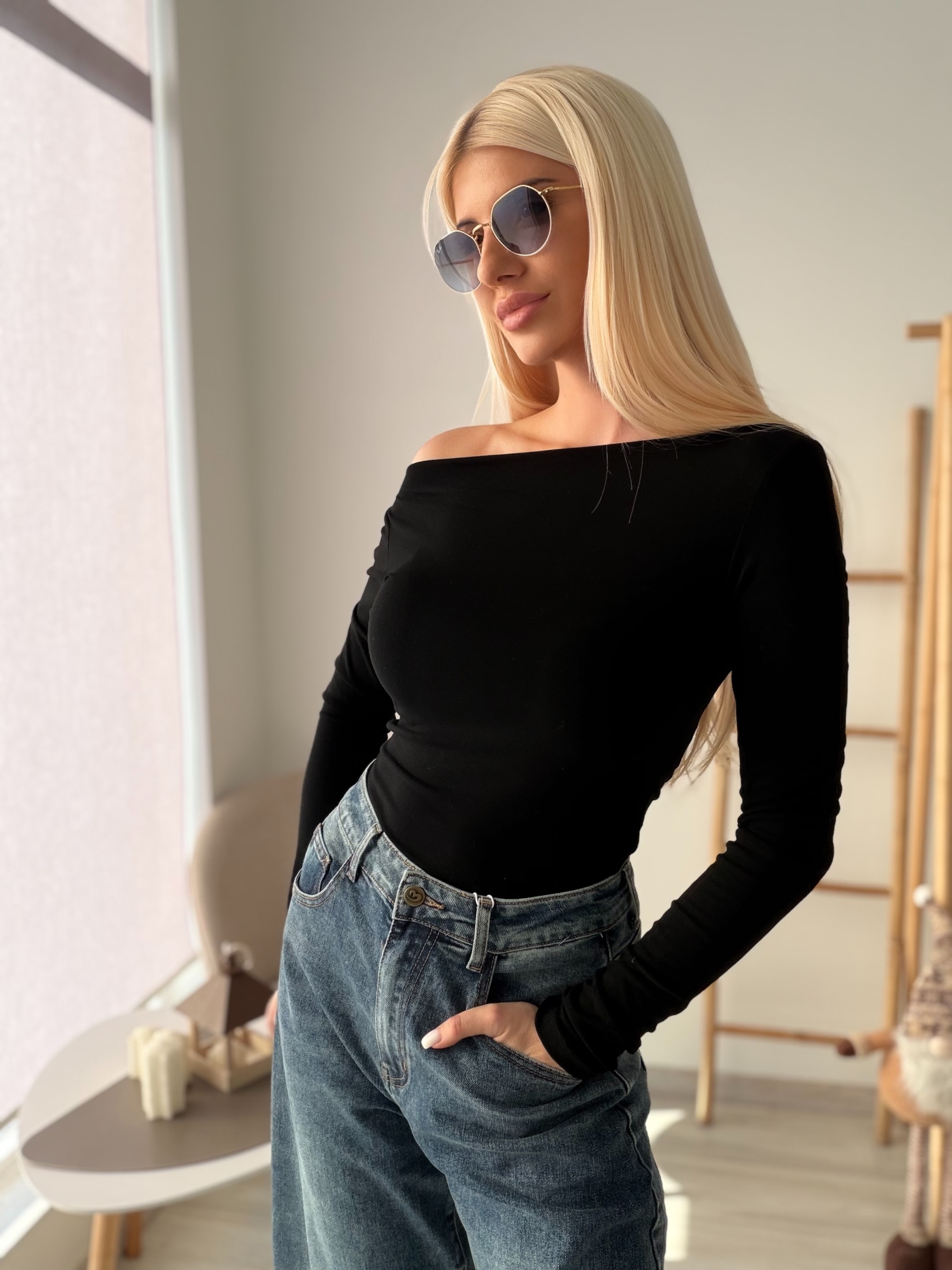 Изискана черна блуза с елегантно деколте тип "лодка". Перфектна за всеки повод, тази блуза съчетава комфорт и стил. Подходяща както за офиса, така и за вечерни събития.