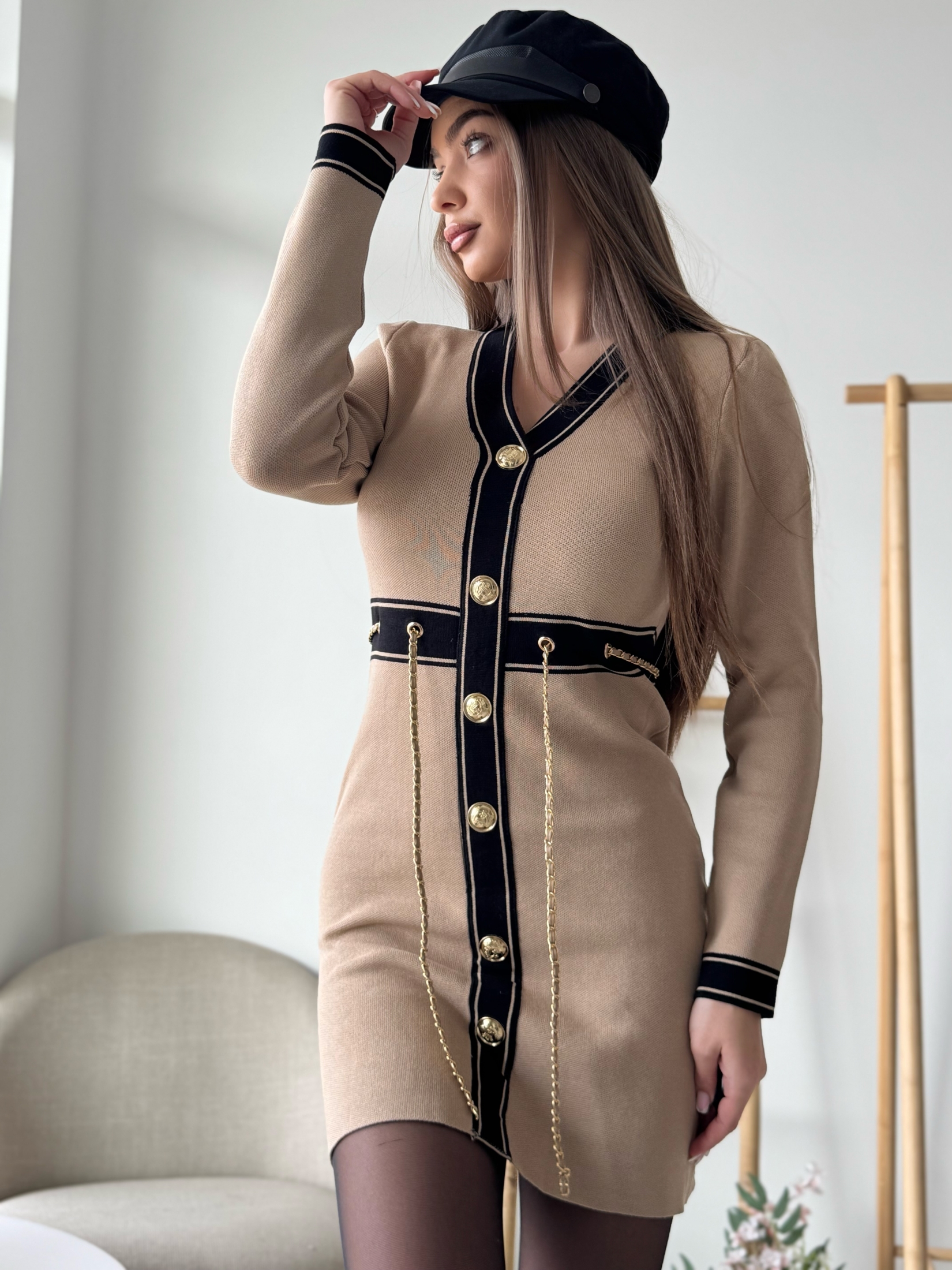 легантна рокля с вталена кройка, акцентираща на талията. Моделът е с контрастни детайли, декоративни златисти копчета и фина верижка за стилен завършек. Подходяща за ежедневни и елегантни визии.