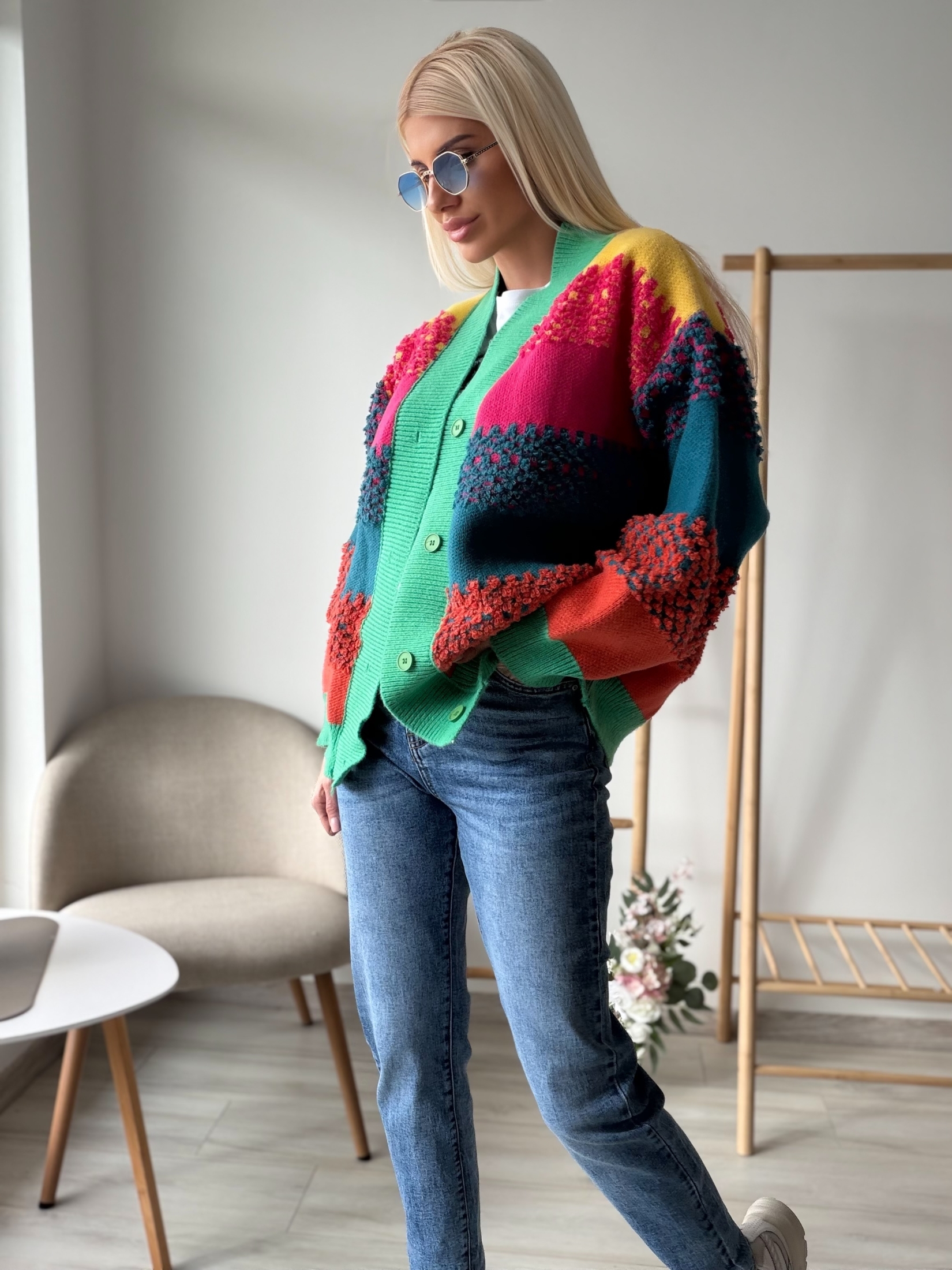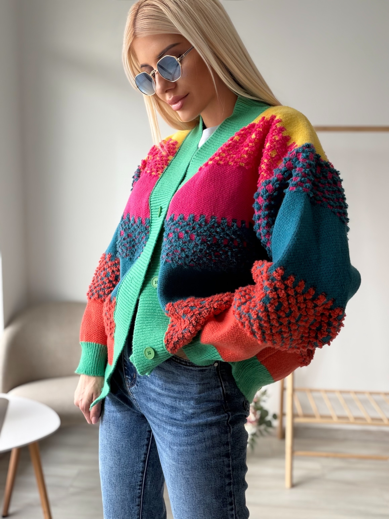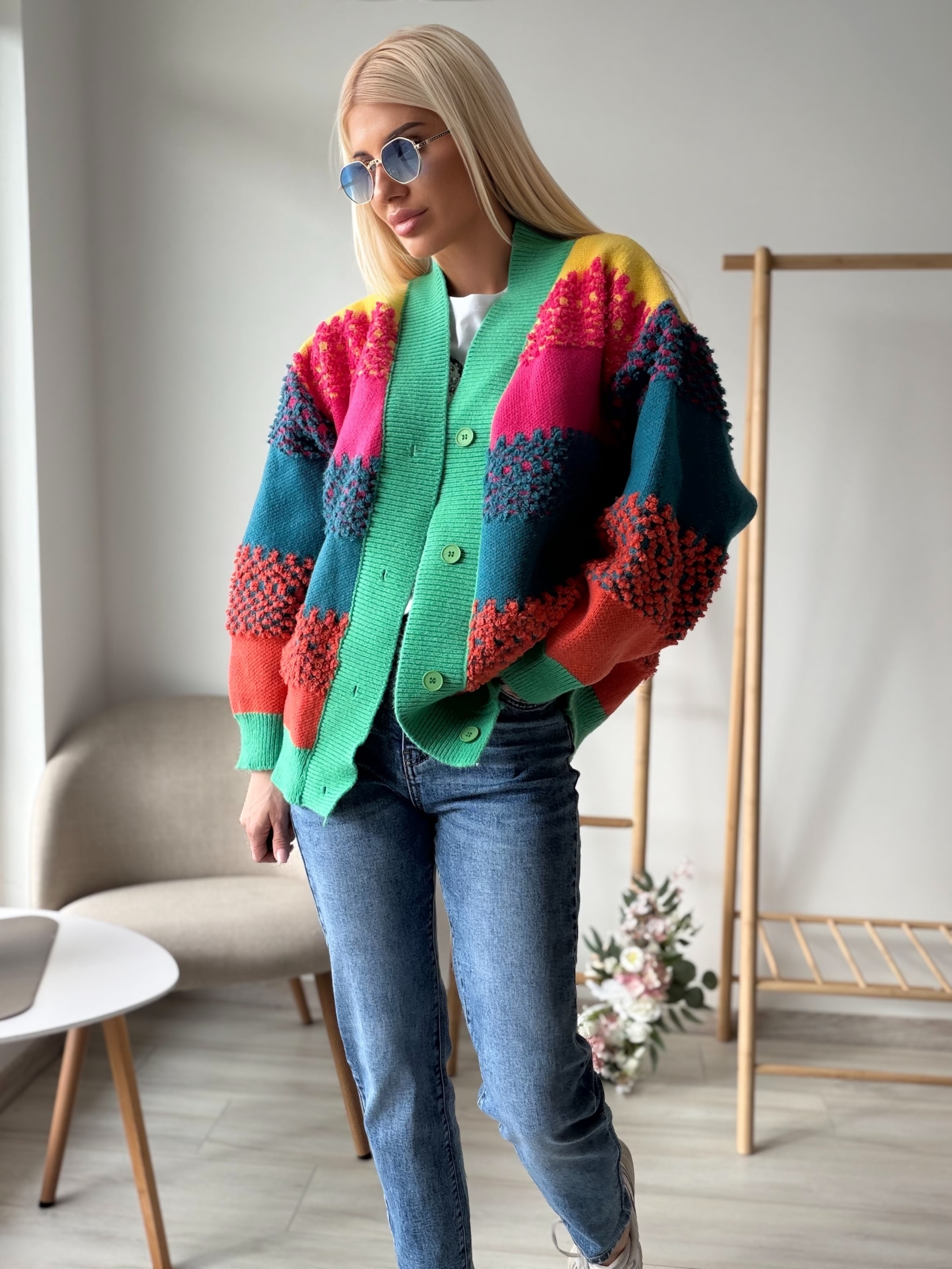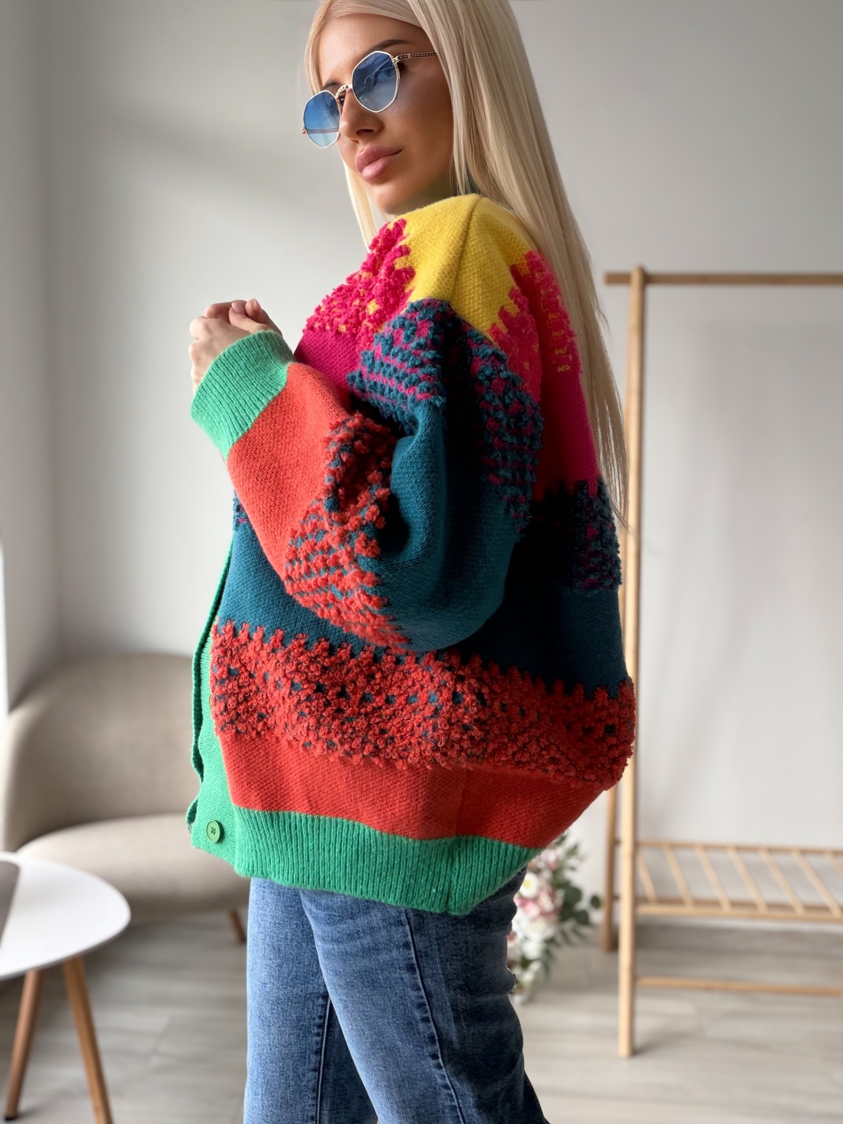 Цветна плетена жилетка с релефна текстура, която моментално привлича погледа. Моделът е изработен от меко и приятно на допир плетиво, с ефектни цветни панели и богата релефна плетка на ръкавите. Свободната кройка осигурява комфорт и леко oversized излъчване, а класическото закопчаване с копчета я прави практична и лесна за комбиниране.