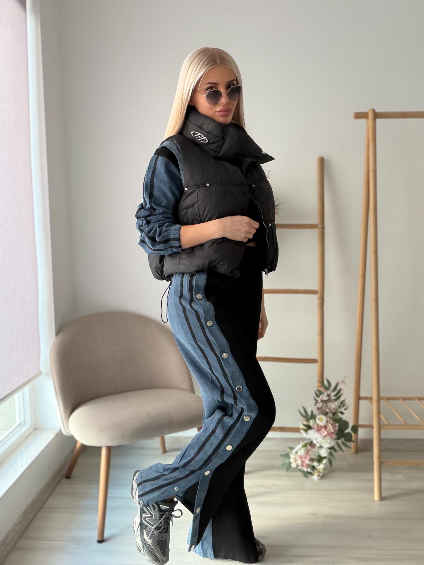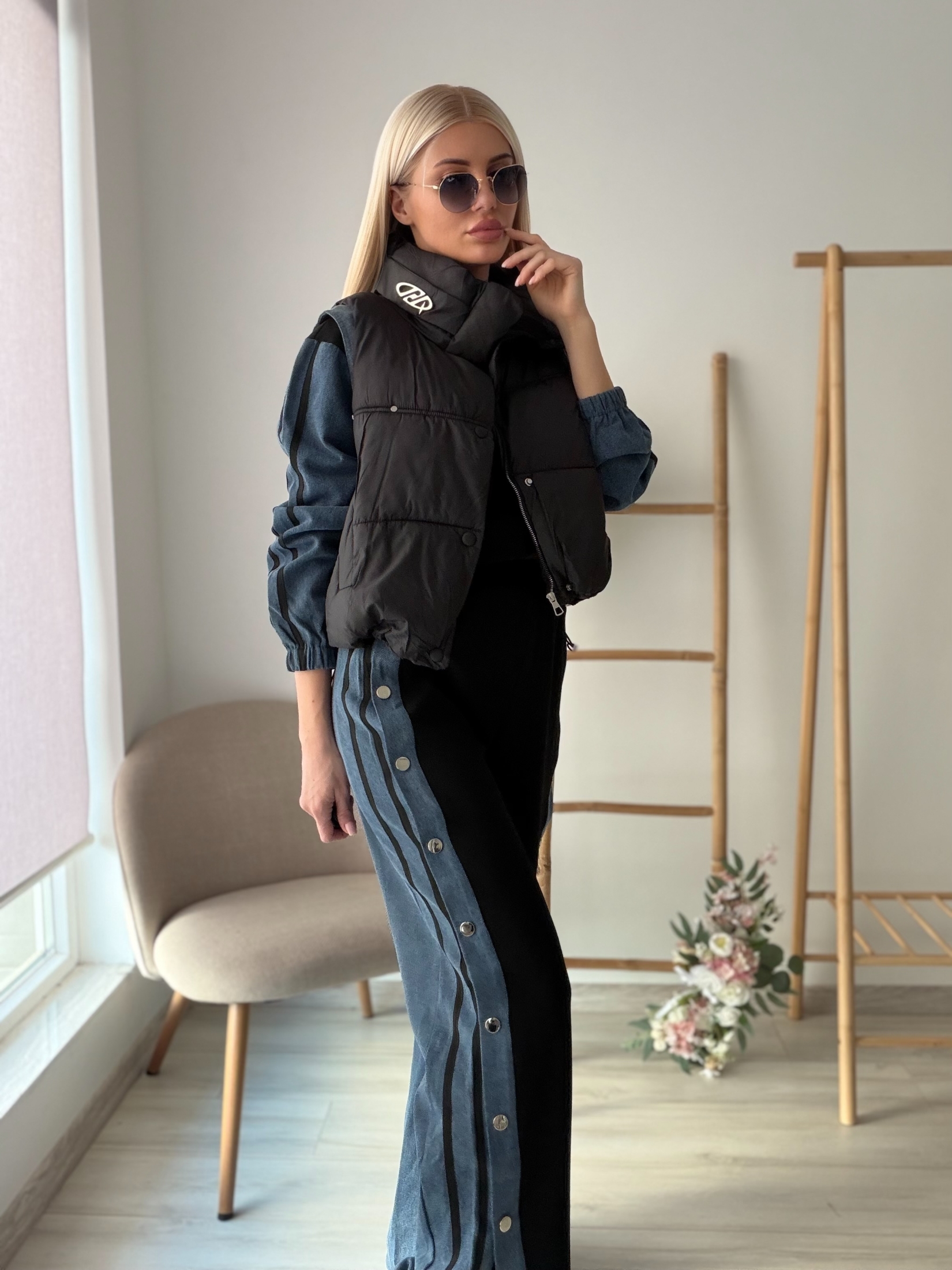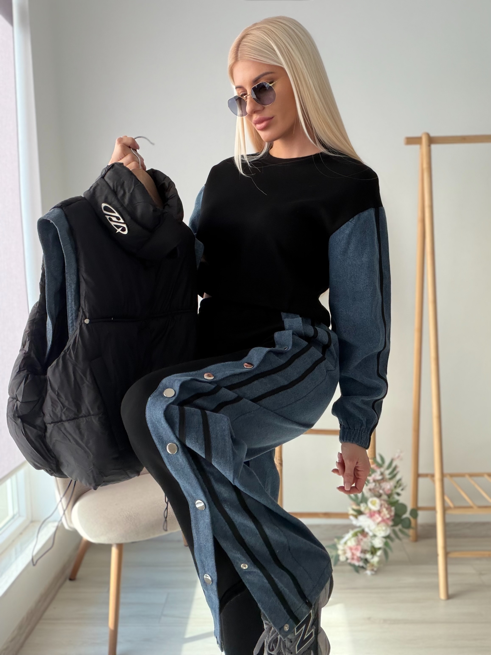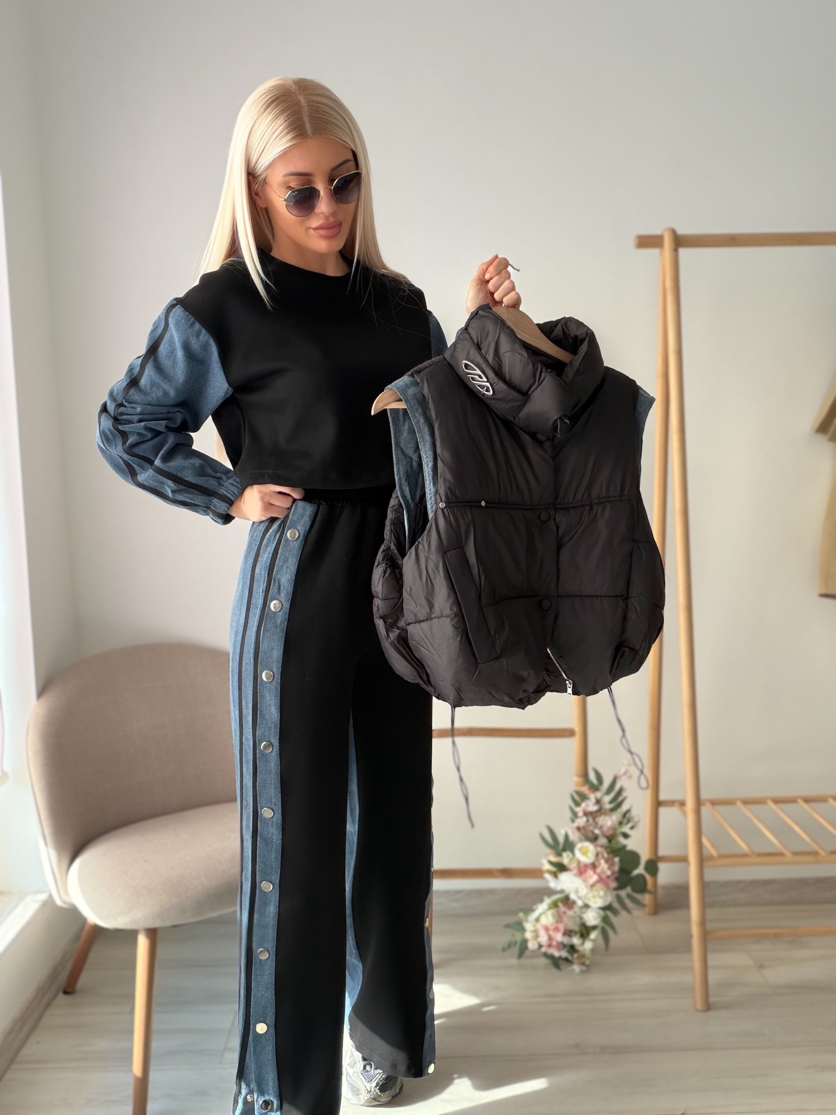 Модерен комплект от три части, съчетаващ удобство и градска елегантност. Състои се от блуза с дълъг ръкав и деним акценти, панталон с деним панели и декоративни копчета отстрани, както и леко ватирана елек-жилетка за завършен и практичен стайлинг.