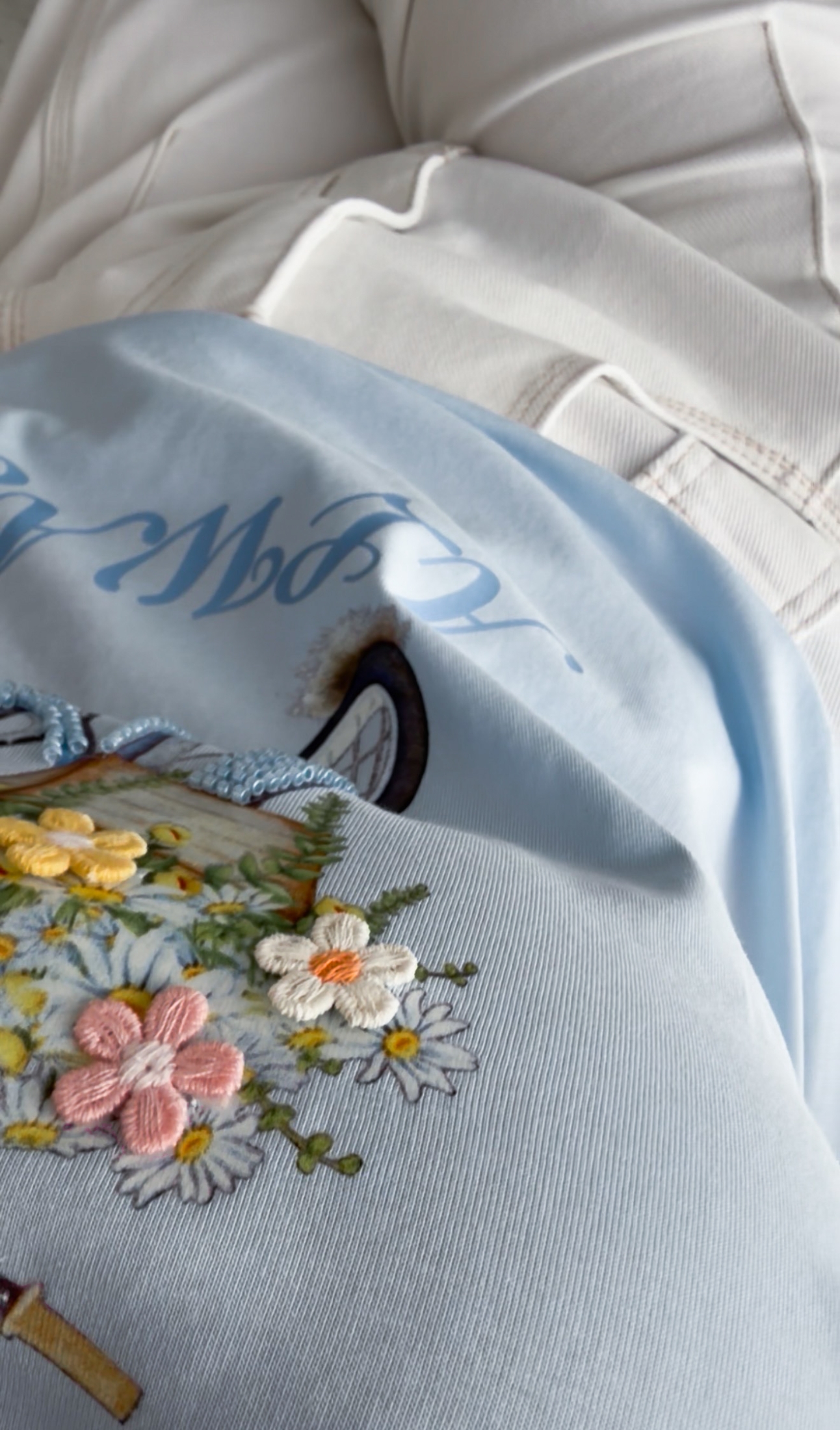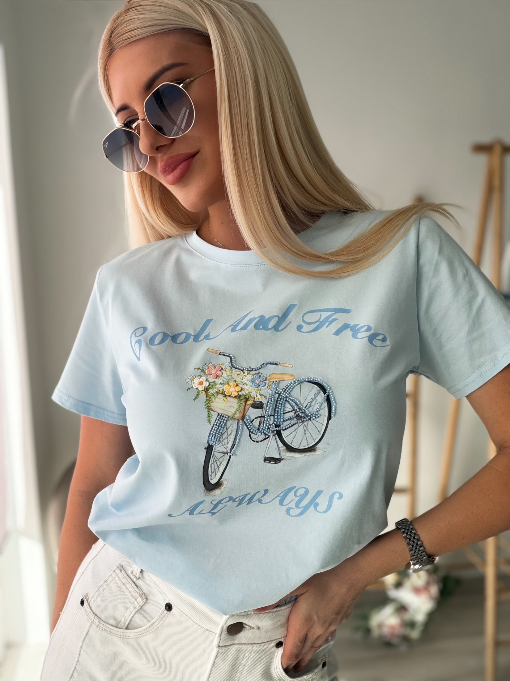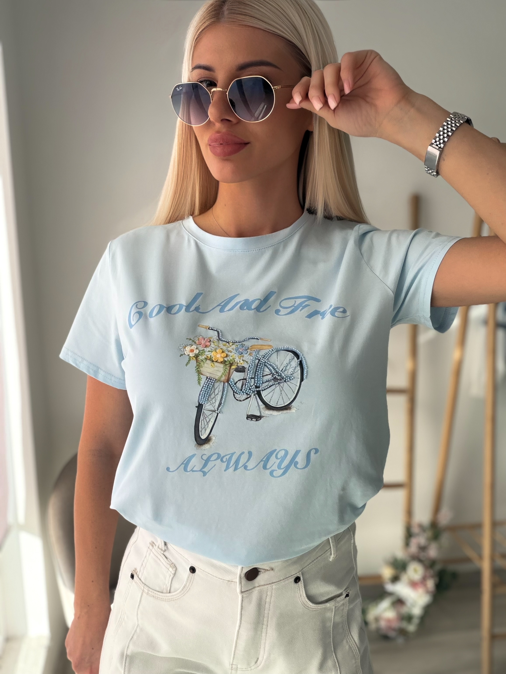 Дамска тениска от висок клас памучна материя, създадена за комфорт и стил в ежедневието. Моделът е изработен от мек и дишащ памук с плътна структура, който запазва формата си и усещането за лукс при допир. Декорирана е с изящни бродерии и фини мъниста, оформящи артистичен акцент с внимание към всеки детайл. Свежият бебешко син нюанс придава нежност и лекота на визията, а класическата кройка я прави лесна за комбиниране с дънки, панталони или поли. Акценти: • Висококачествена памучна материя • Нежен бебешко син цвят • Декоративни бродерии и мъниста • Комфортна и универсална кройка • Подходяща за ежедневни и по-стилни визии