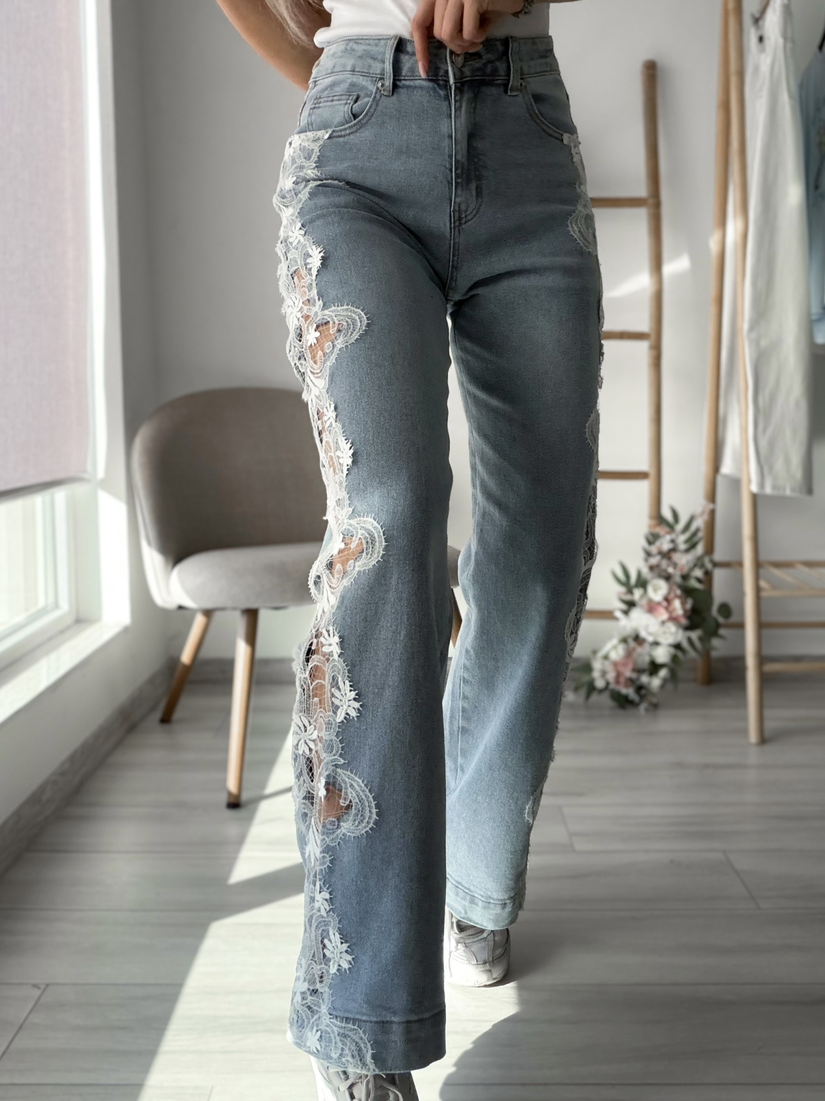 Модерни дънки, които съчетават комфорт и впечатляващ дизайн. Моделът е изработен от еластичен деним, който приляга по тялото и подчертава силуета, без да ограничава движението. Акцентът е фината дантела с флорален мотив, разположена по крачола, която придава нежна женственост и актуален моден характер.