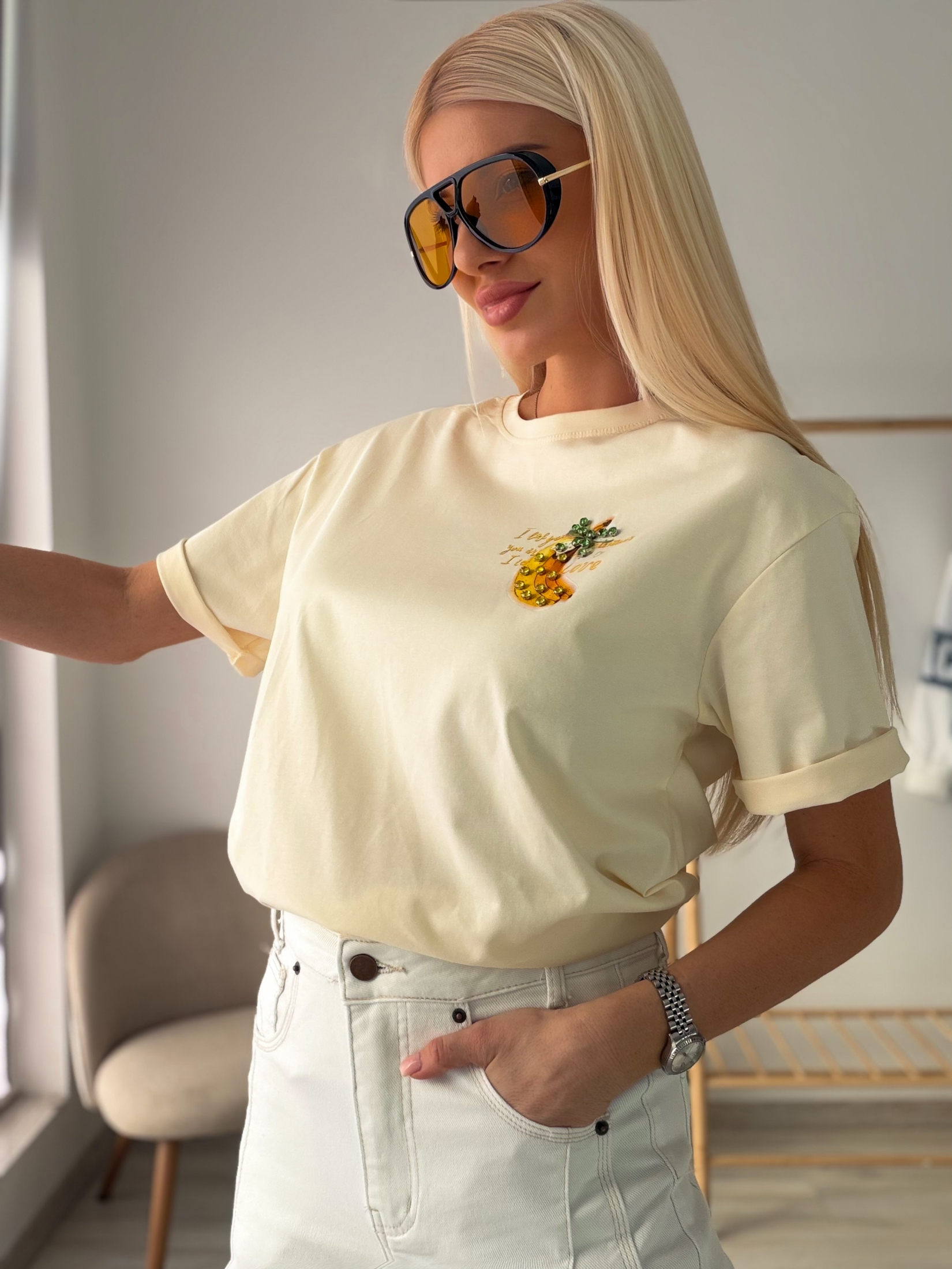 Стилна тениска в млечно жълт цвят – най-актуалният нюанс за пролет 2026, който придава свежест и модерно излъчване. Изработена от висок клас памучен, плътен плат, който е мек на допир, дишащ и запазва формата си при носене и пране.