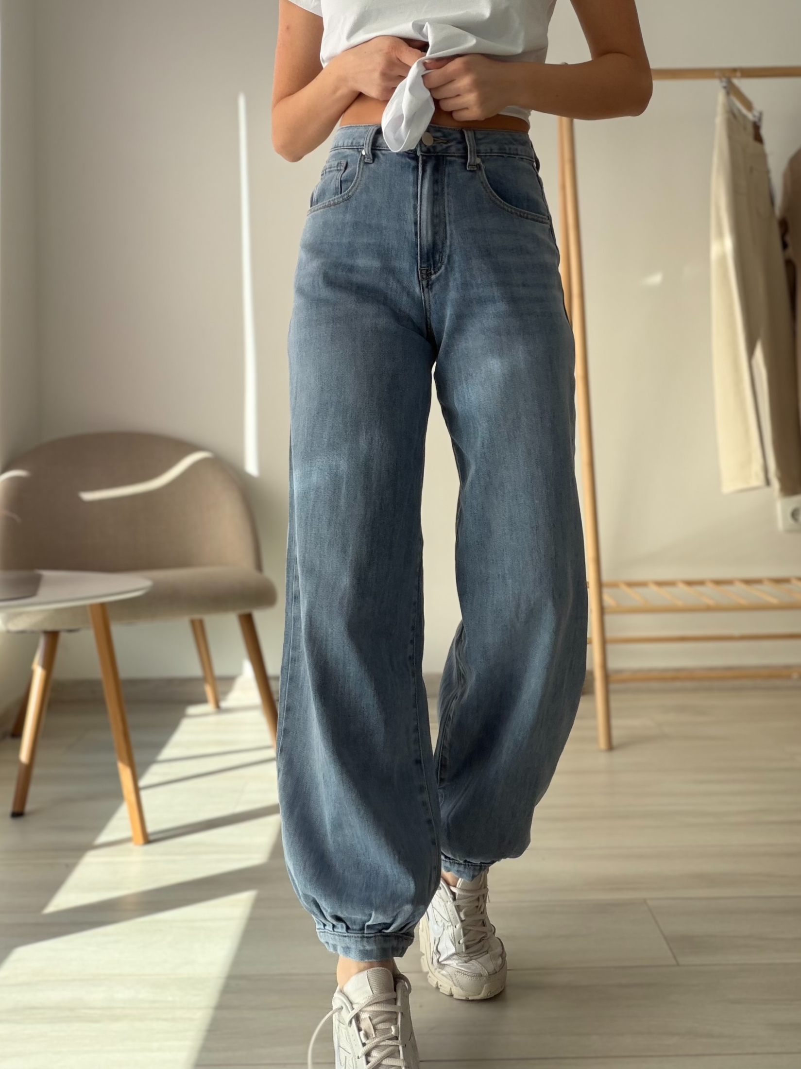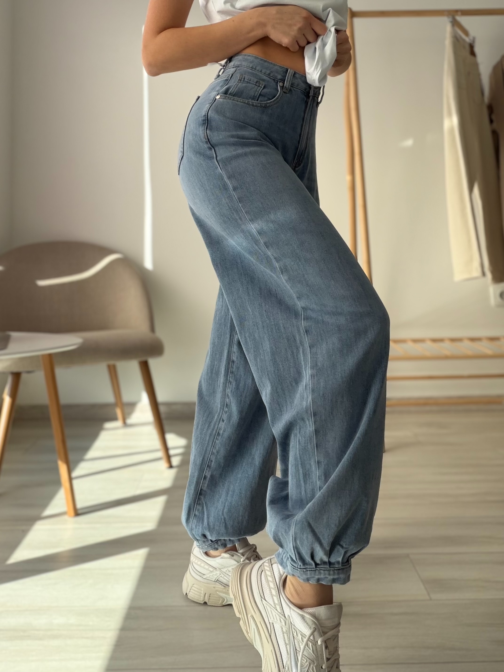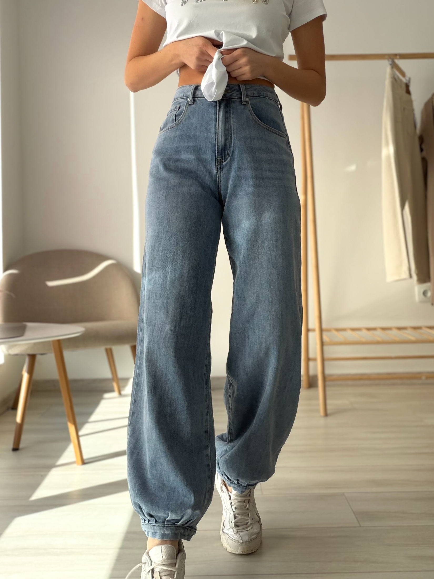 Модерни дамски дънки, изработени от мек и приятен на допир деним, който осигурява комфорт през целия ден. Моделът е с висока талия и свободна кройка по крака, която визуално издължава силуета. Долната част е леко прибрана, което придава актуален и спортно-елегантен завършек. Дънките са подходящи както за ежедневни визии, така и за по-стилни комбинации с кецове или обувки на платформа.