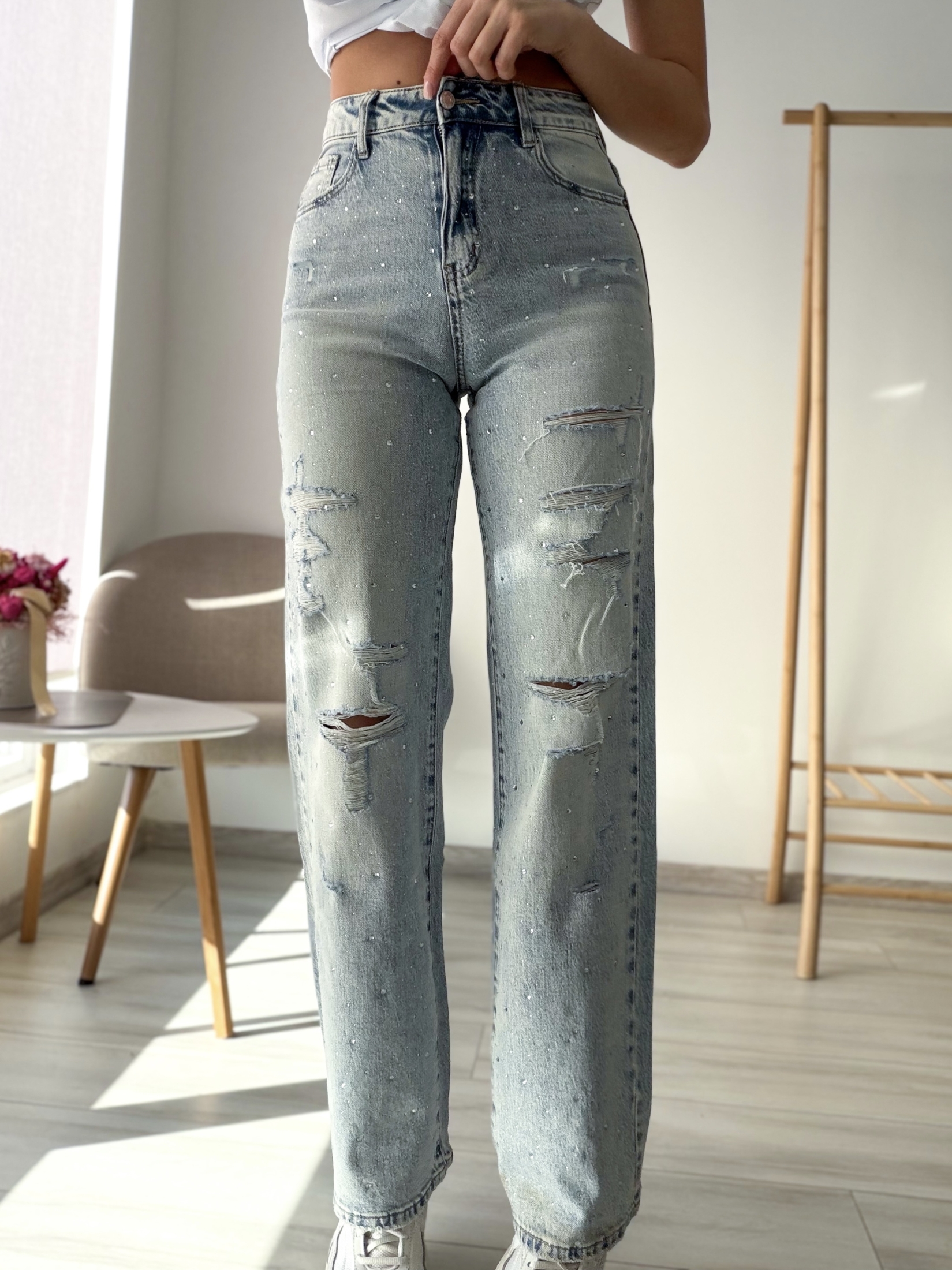 Стилни дънки с висока талия и модерна права кройка, които издължават силуета и оформят красиво ханша. Моделът е изработен от мек и плътен деним с лек еластан за комфорт през целия ден. Светлият изсветлен ефект и деликатните бляскави точици придават свеж и отличим вид, а скъсаните елементи добавят модерно street усещане.