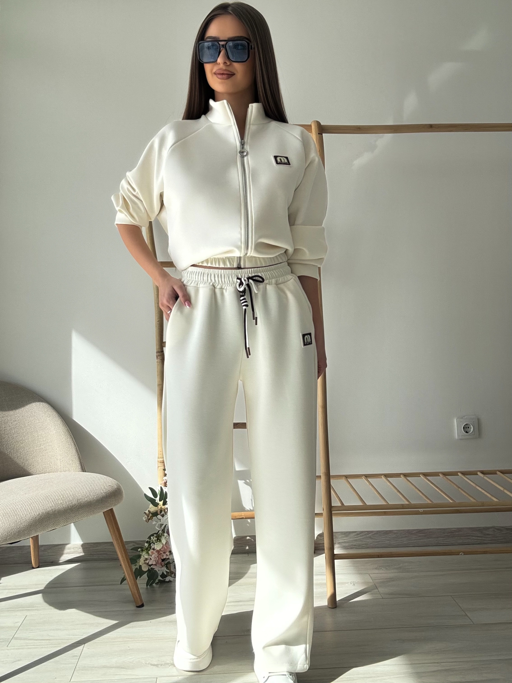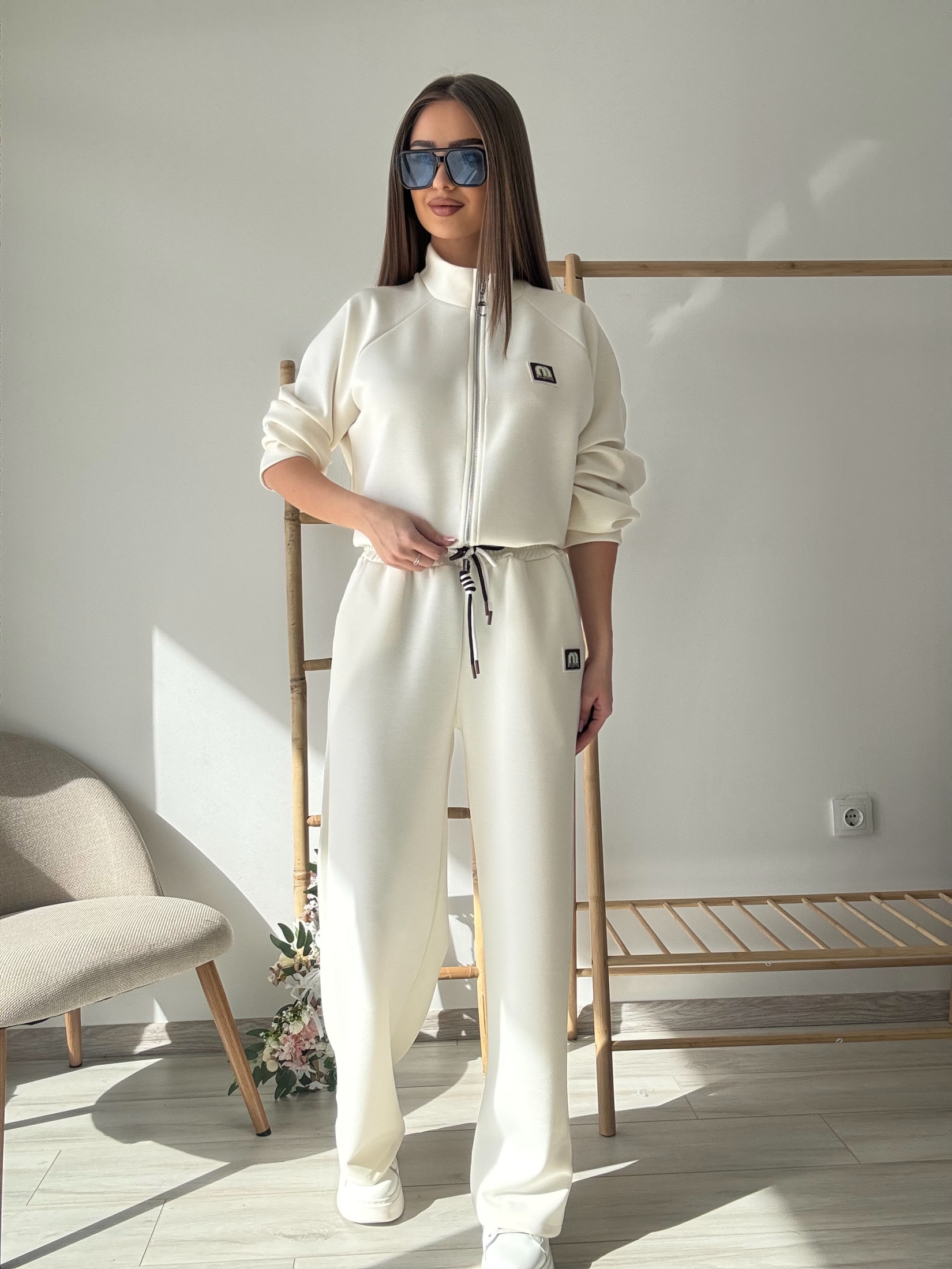 Стилен дамски комплект от две части, съчетаващ комфорт и изчистена модерна визия. Моделът включва късо яке с цип и висока яка и свободен панталон с права кройка и еластична талия с ластик. Финoто лого придава завършен и минималистичен акцент.