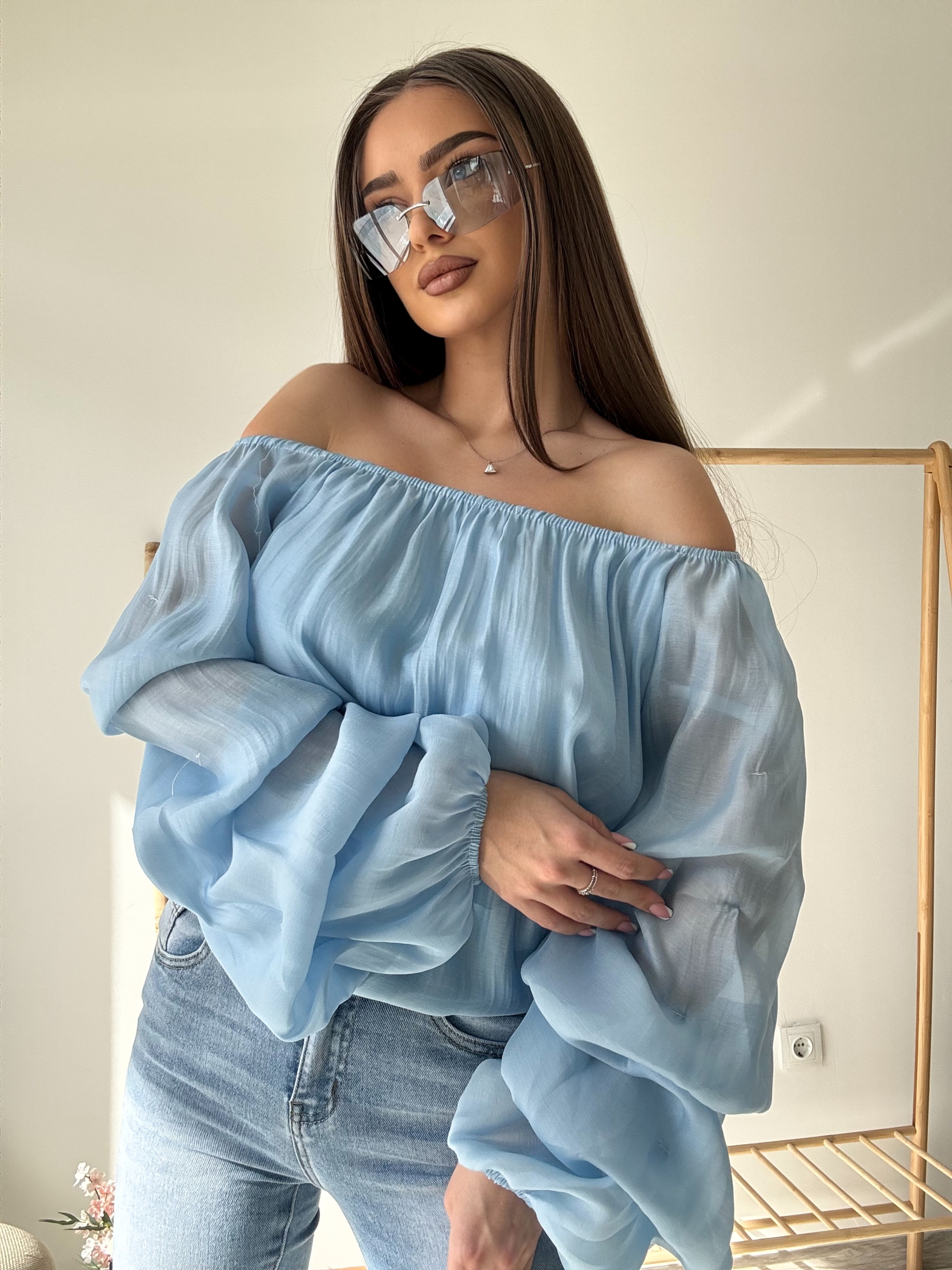 Моделът е с ластично деколте тип „паднало рамо“, което красиво разкрива раменете и придава изтънчена елегантност. Ръкавите са обемни и свободно падащи, завършени с ластик за допълнителен комфорт и нежна форма.