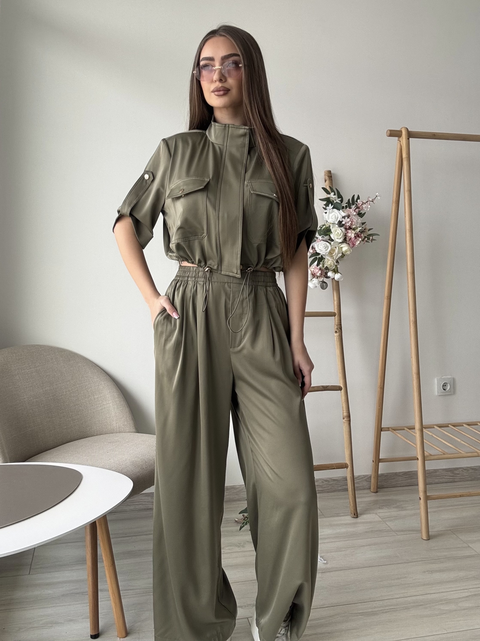Горната част е с изчистена линия, висока яка и функционални джобове с капаци, които придават леко сафари излъчване. Ръкавите са със свободна кройка и фиксиращ детайл за по-небрежен шик. В талията има връзки за регулиране, които подчертават силуета.