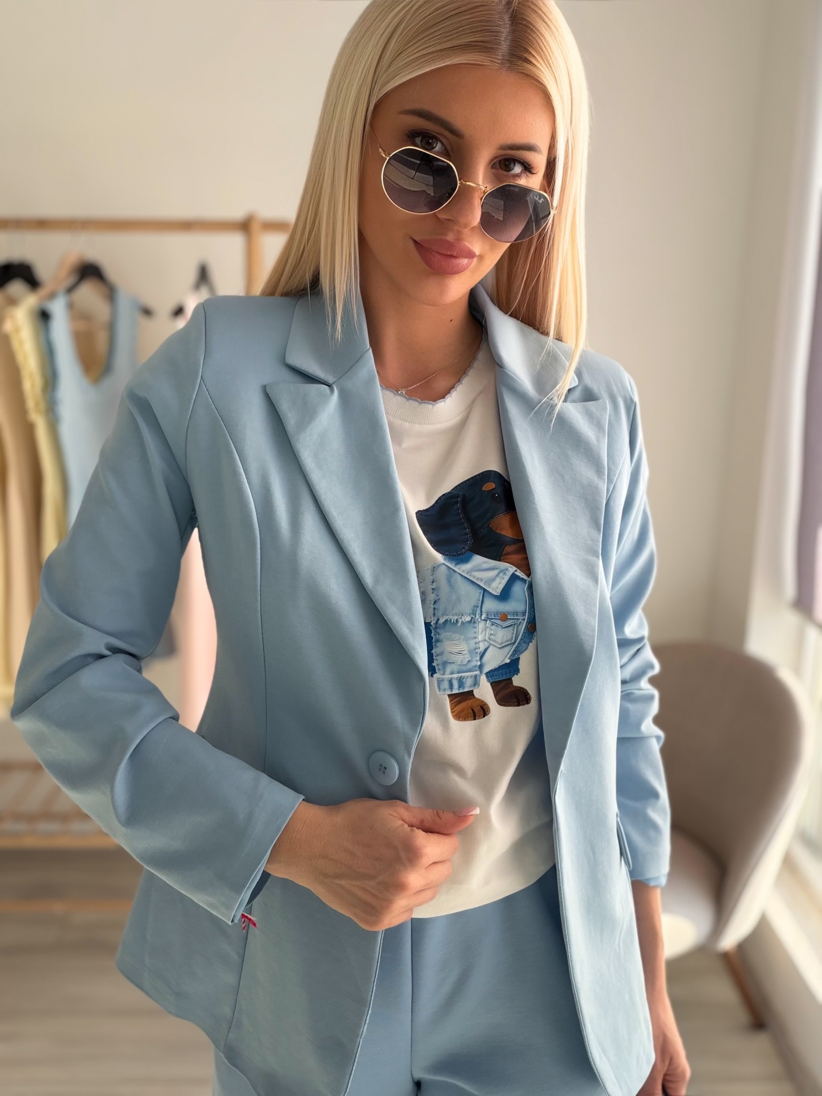 Елегантно дамско сако с изчистен и модерен дизайн, подходящо както за ежедневни, така и за по-елегантни визии. Моделът е с класическа яка, права кройка и удобно закопчаване отпред. Изработено е от памучна материя, която осигурява комфорт и лекота при носене през целия ден. Сакото се комбинира лесно както с дънки и тениска за по-небрежен стил, така и с панталон или пола за по-елегантна визия. Перфектен избор за пролетно-летния сезон и за завършена стилна визия.