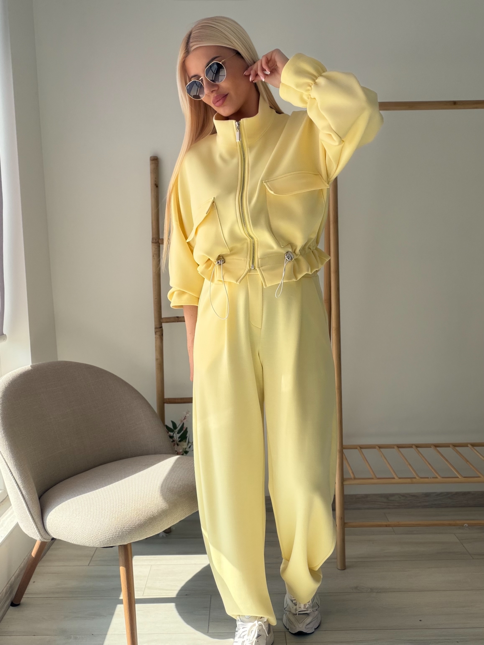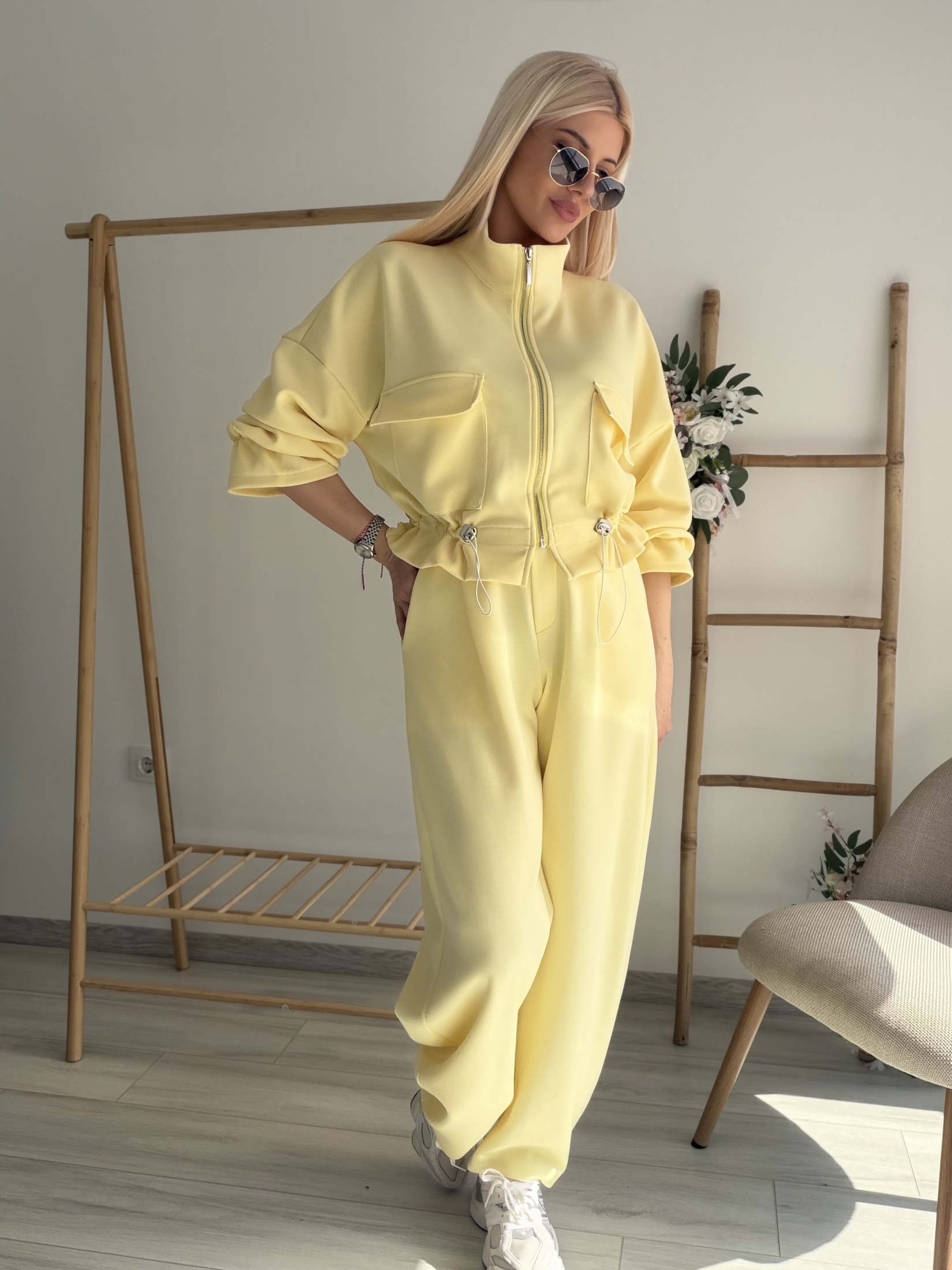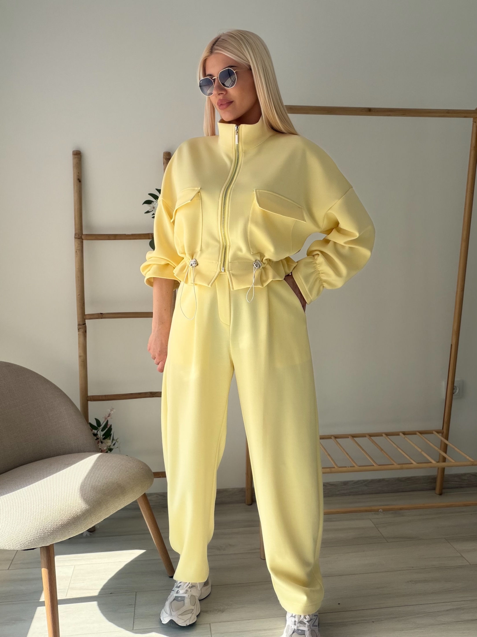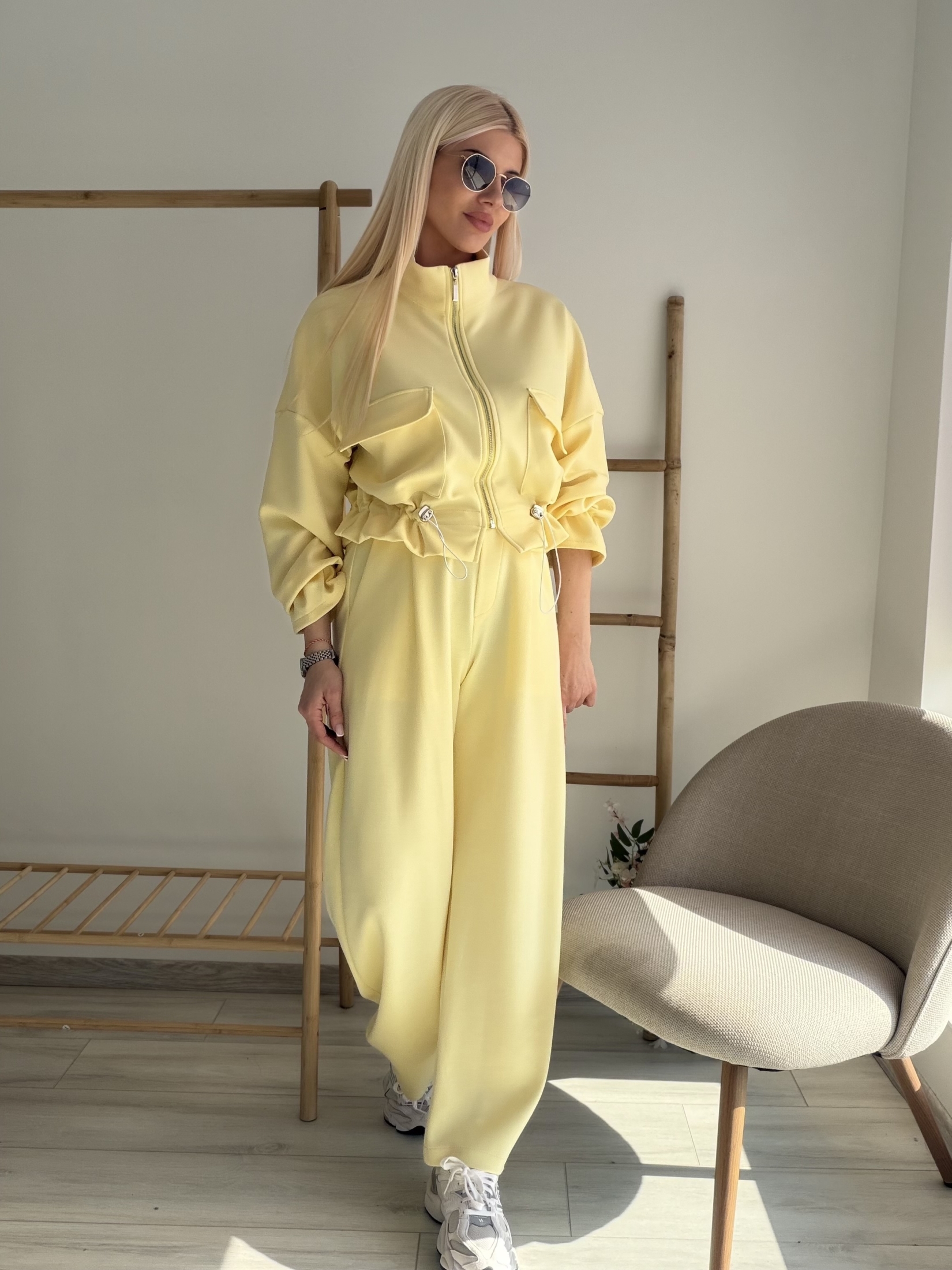 Стилен и модерен комплект, съчетаващ комфорт и елегантна визия. Моделът включва горнище с цип и висока яка, декорирано с функционални джобове и регулируема талия с връзки, които красиво подчертават силуета. Панталонът е с висока талия и свободна кройка, осигуряваща удобство и свобода на движение.