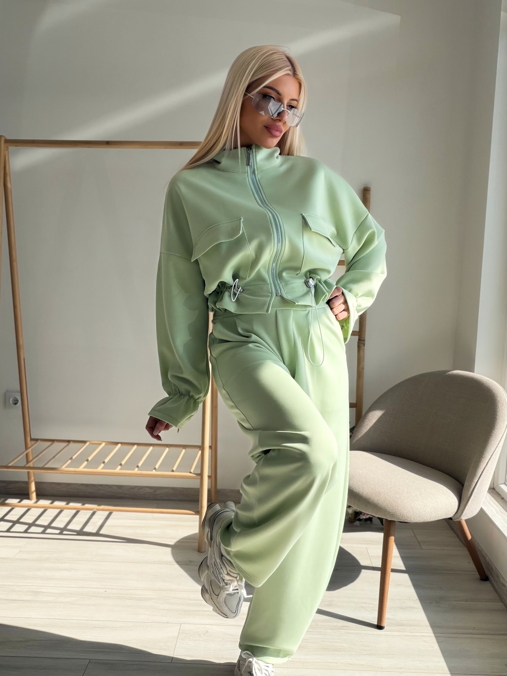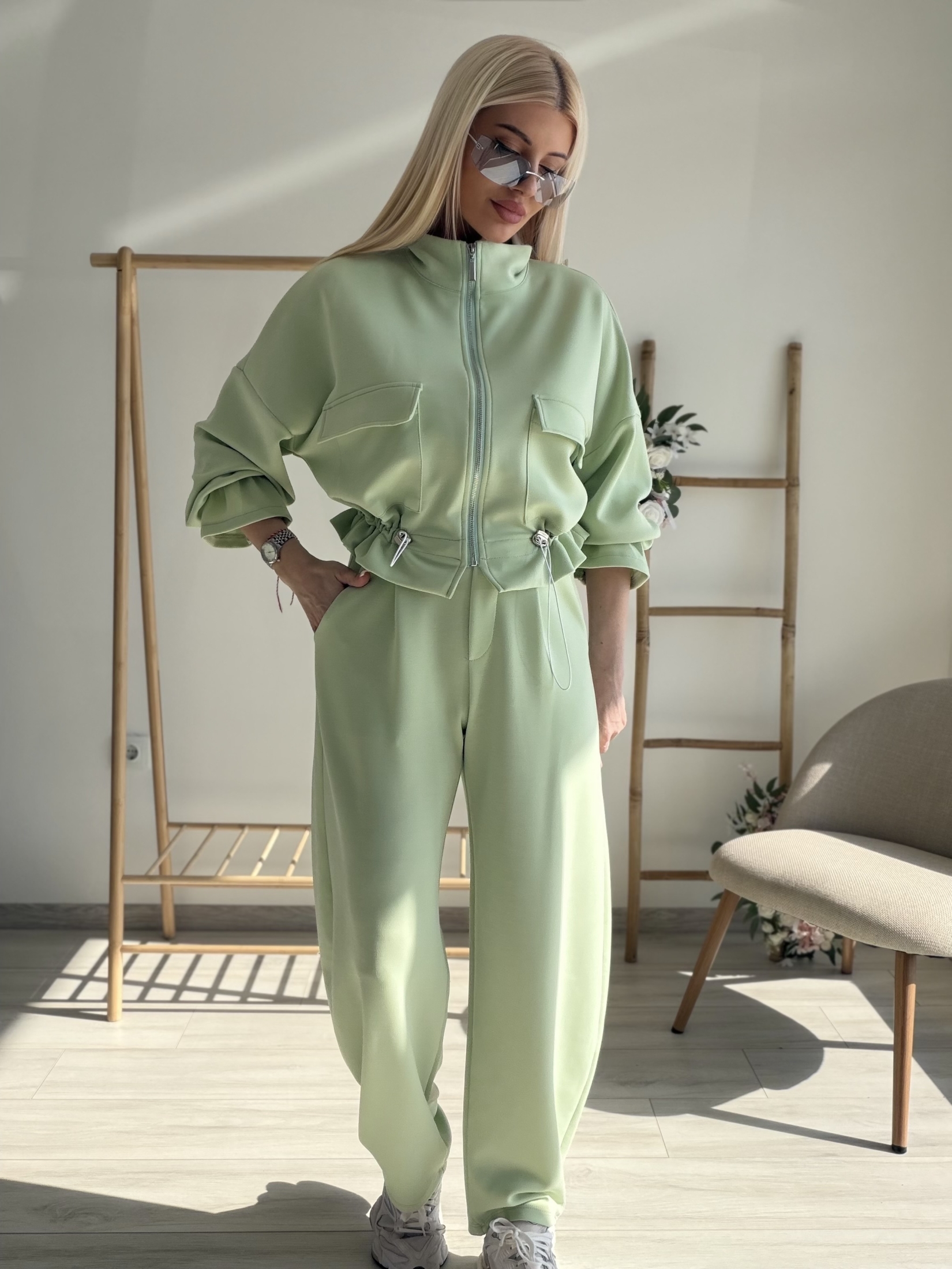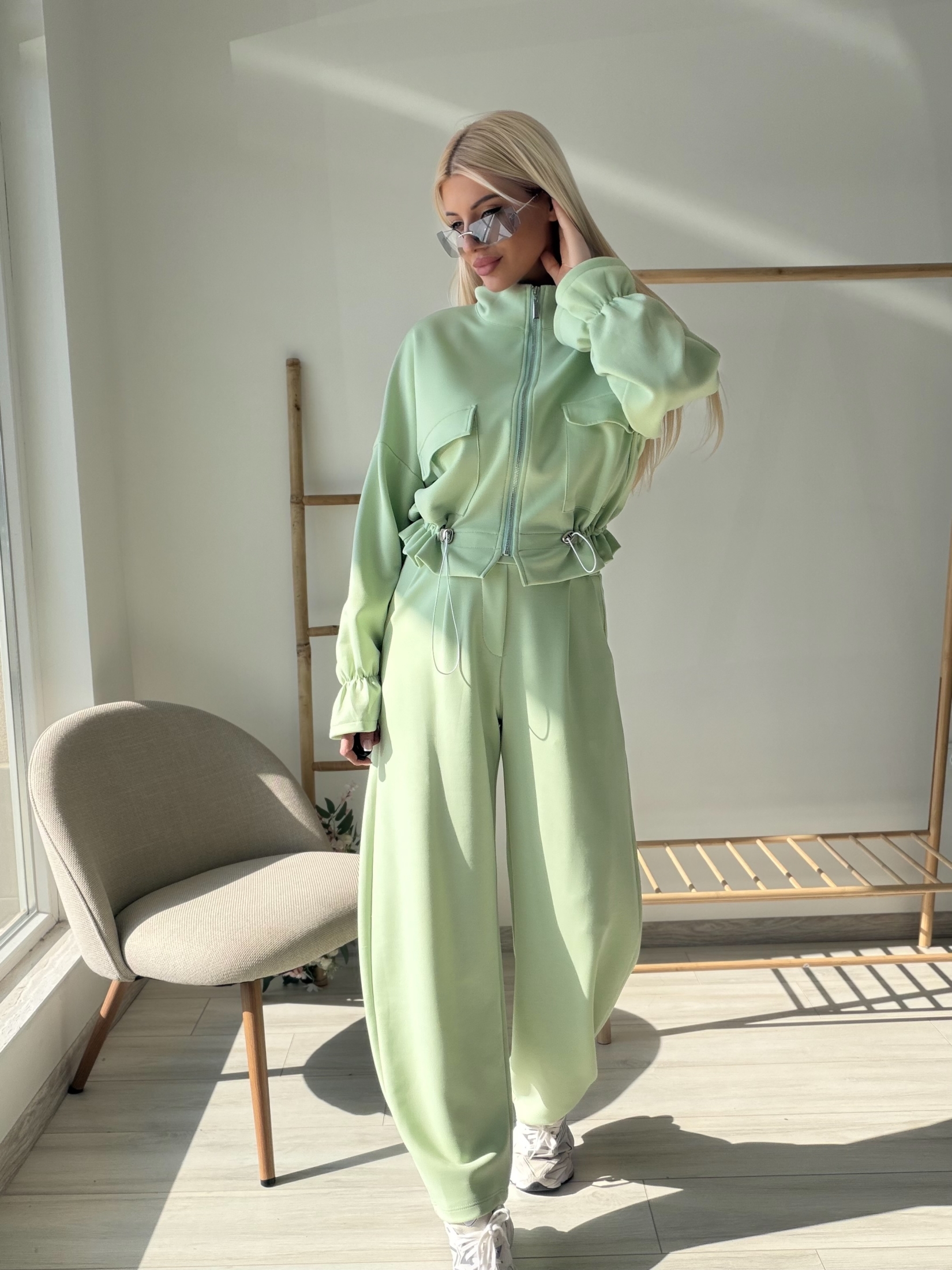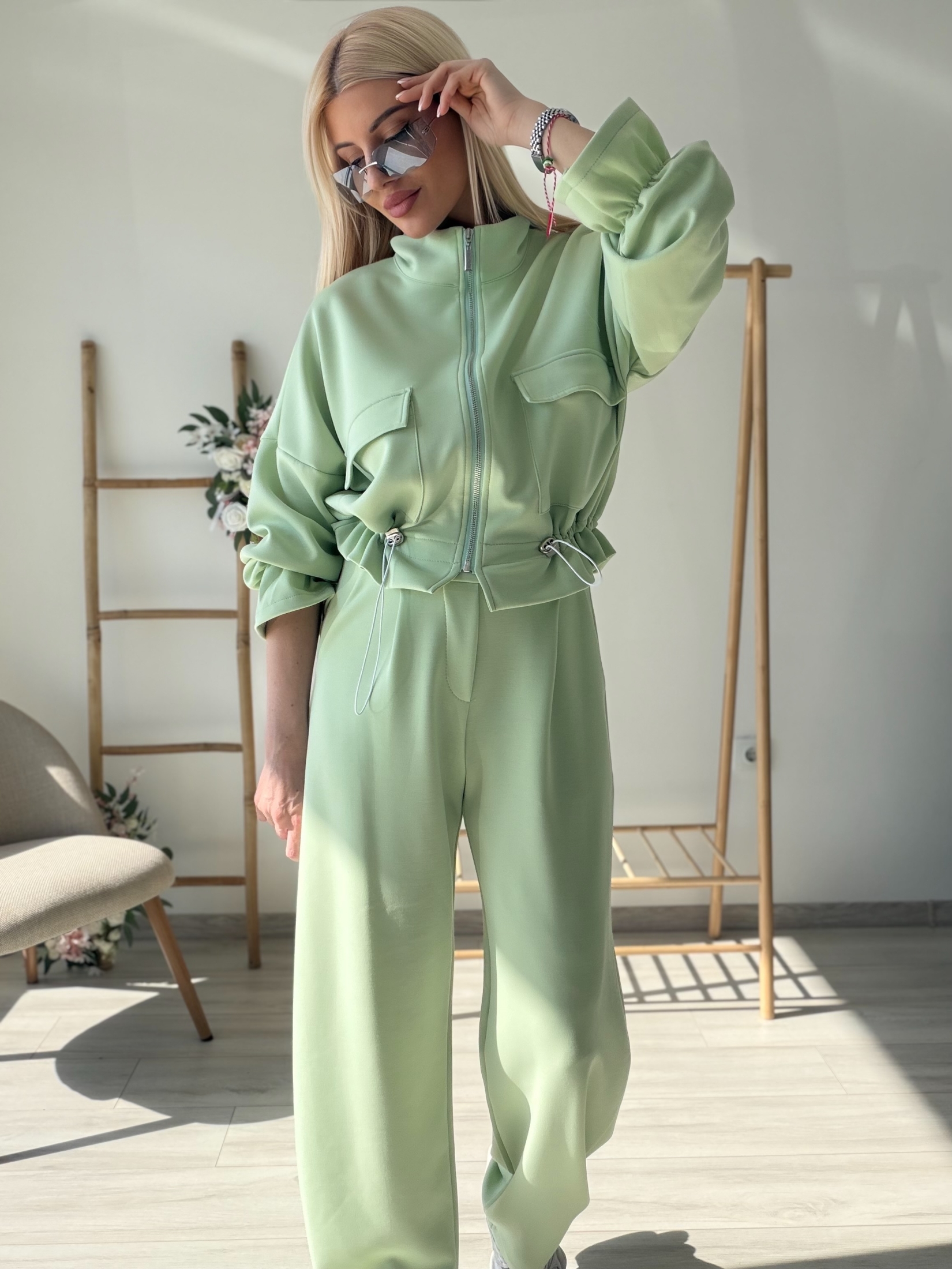Стилен и модерен комплект, съчетаващ комфорт и елегантна визия. Моделът включва горнище с цип и висока яка, декорирано с функционални джобове и регулируема талия с връзки, които красиво подчертават силуета. Панталонът е с висока талия и свободна кройка, осигуряваща удобство и свобода на движение. Изработен от мека и приятна на допир материя, комплектът е идеален както за ежедневието, така и за по-стилна спортна визия. Съчетава се отлично с маратонки и аксесоари за модерна градска визия.