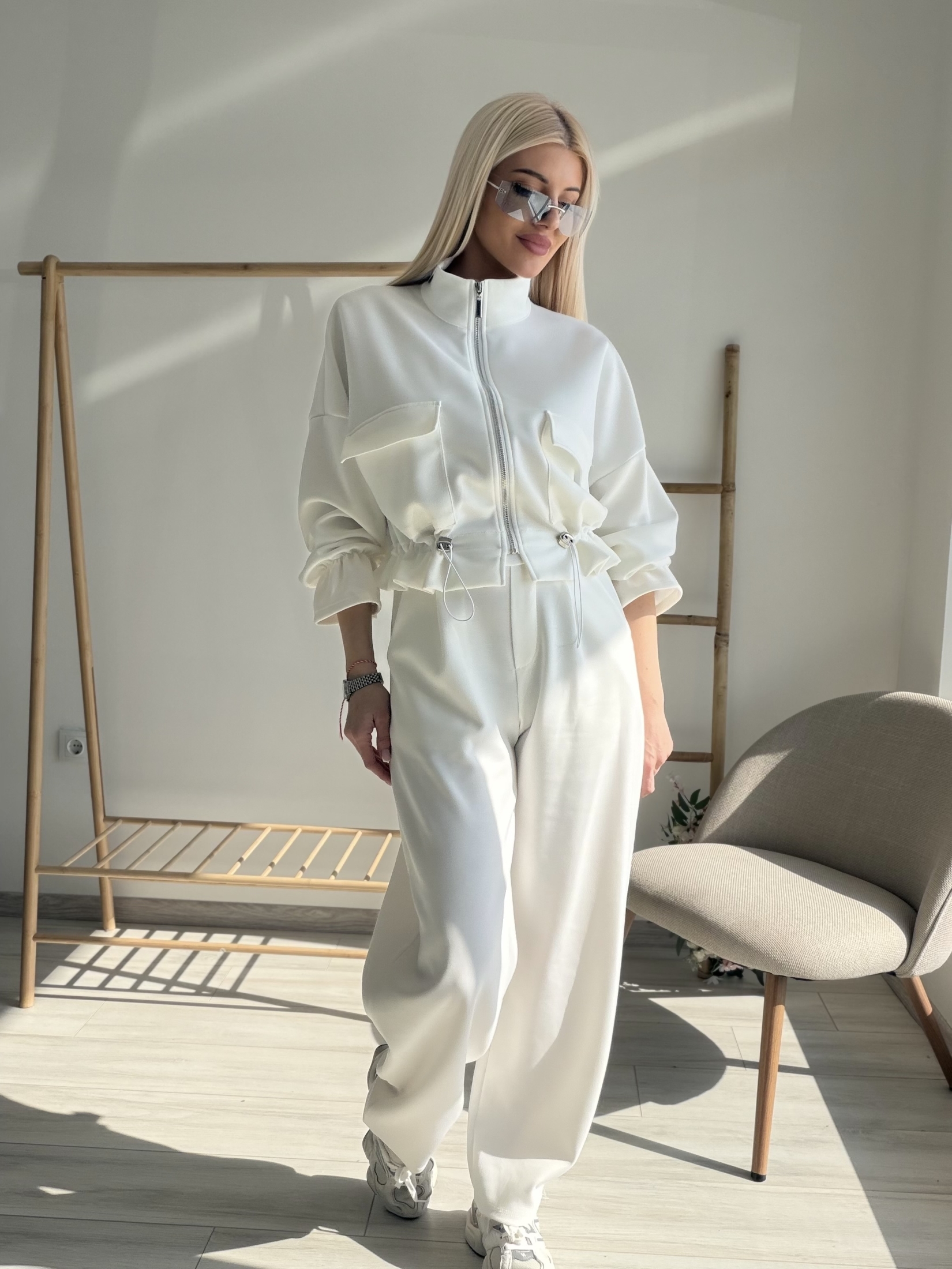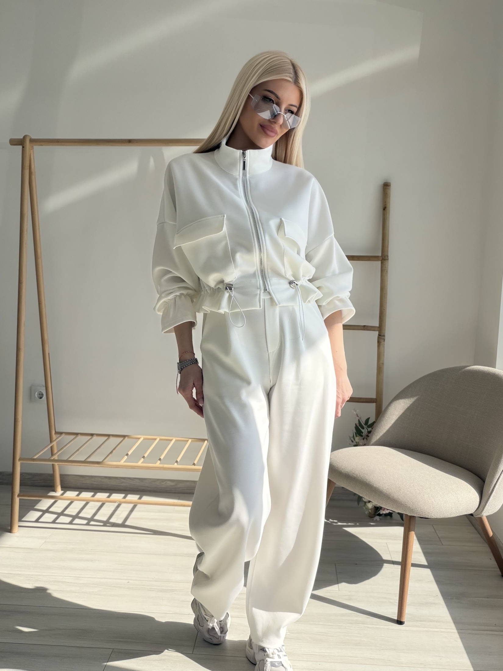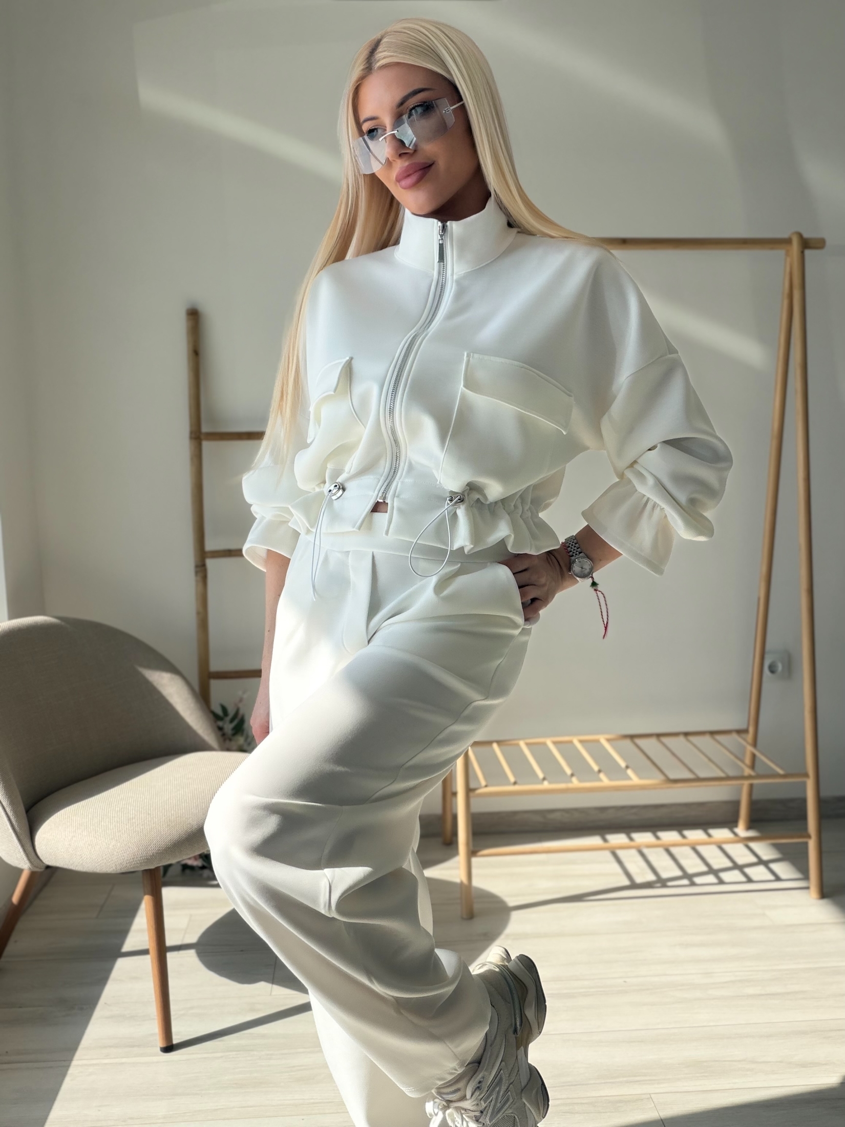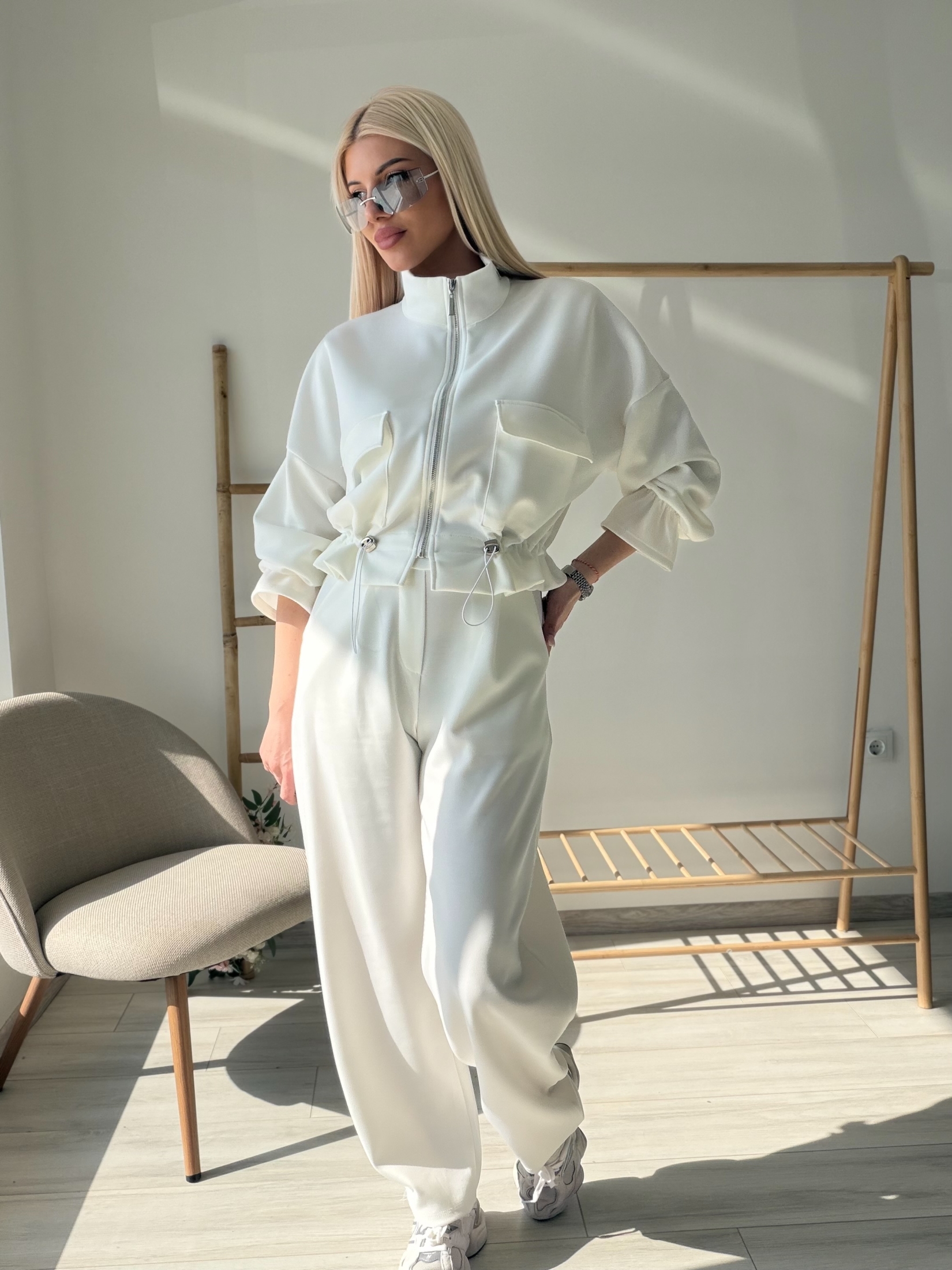 Стилен и модерен комплект, съчетаващ комфорт и елегантна визия. Моделът включва горнище с цип и висока яка, декорирано с функционални джобове и регулируема талия с връзки, които красиво подчертават силуета. Панталонът е с висока талия и свободна кройка, осигуряваща удобство и свобода на движение. Изработен от мека и приятна на допир материя, комплектът е идеален както за ежедневието, така и за по-стилна спортна визия. Съчетава се отлично с маратонки и аксесоари за модерна градска визия.