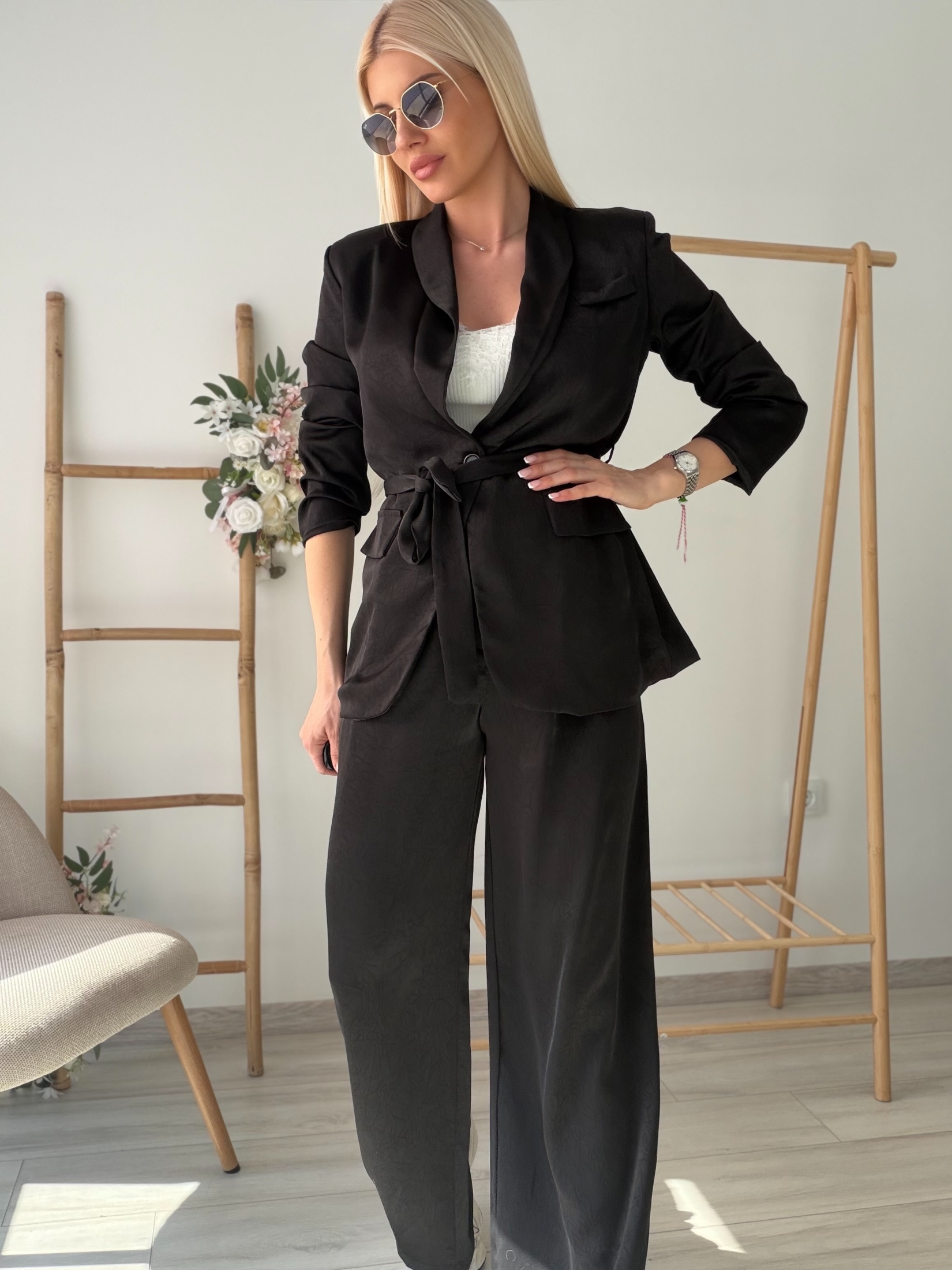Елегантен сатенен комплект от две части, съчетаващ стил, женственост и комфорт. Комплектът включва свободен панталон с права линия и елегантно сако с колан, което красиво подчертава талията и придава изискан силует. Фината сатенена материя пада нежно по тялото и създава усещане за лекота и лукс.