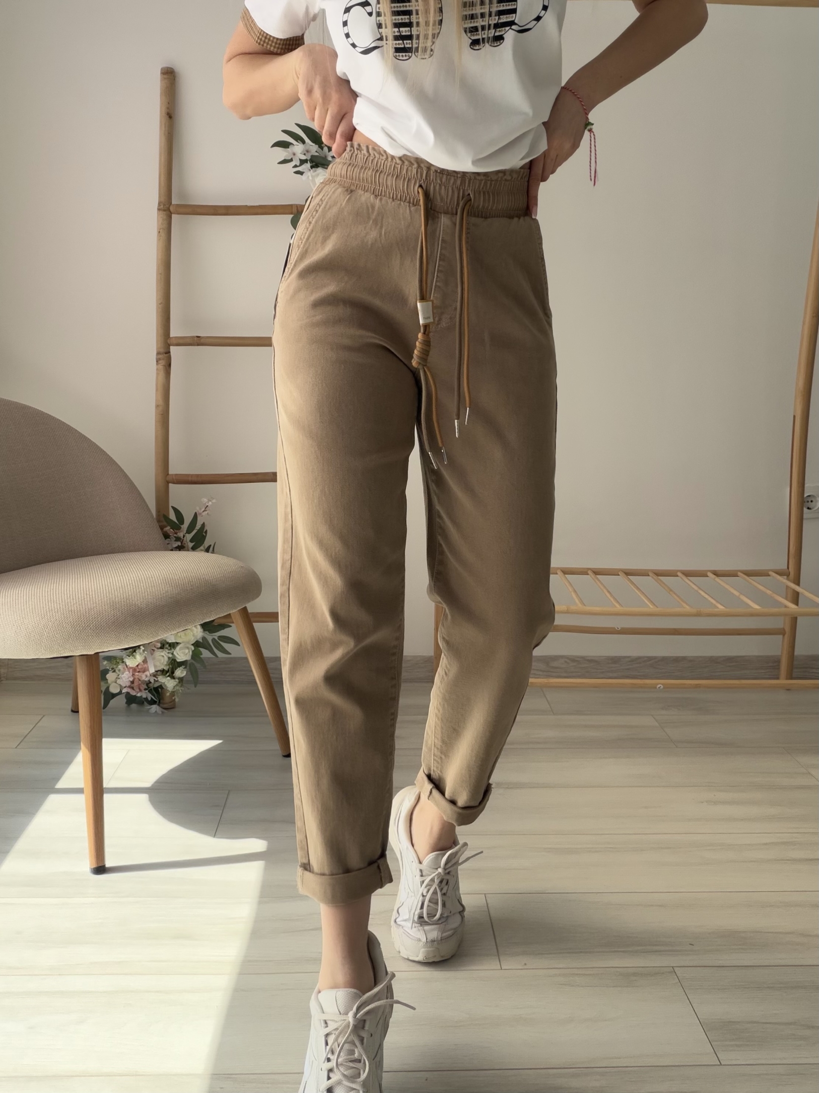 Стилни дамски дънки със спортно-елегантна визия и комфортна кройка. Моделът е с еластична талия и връзки за регулиране, които осигуряват удобно прилягане и свобода на движение през целия ден. Дънките са изработени от мека и приятна на допир деним материя, която придава модерен и непринуден вид. Разполагат с практични странични джобове и изчистен силует, който лесно се комбинира както със спортни обувки, така и с по-елегантни обувки.