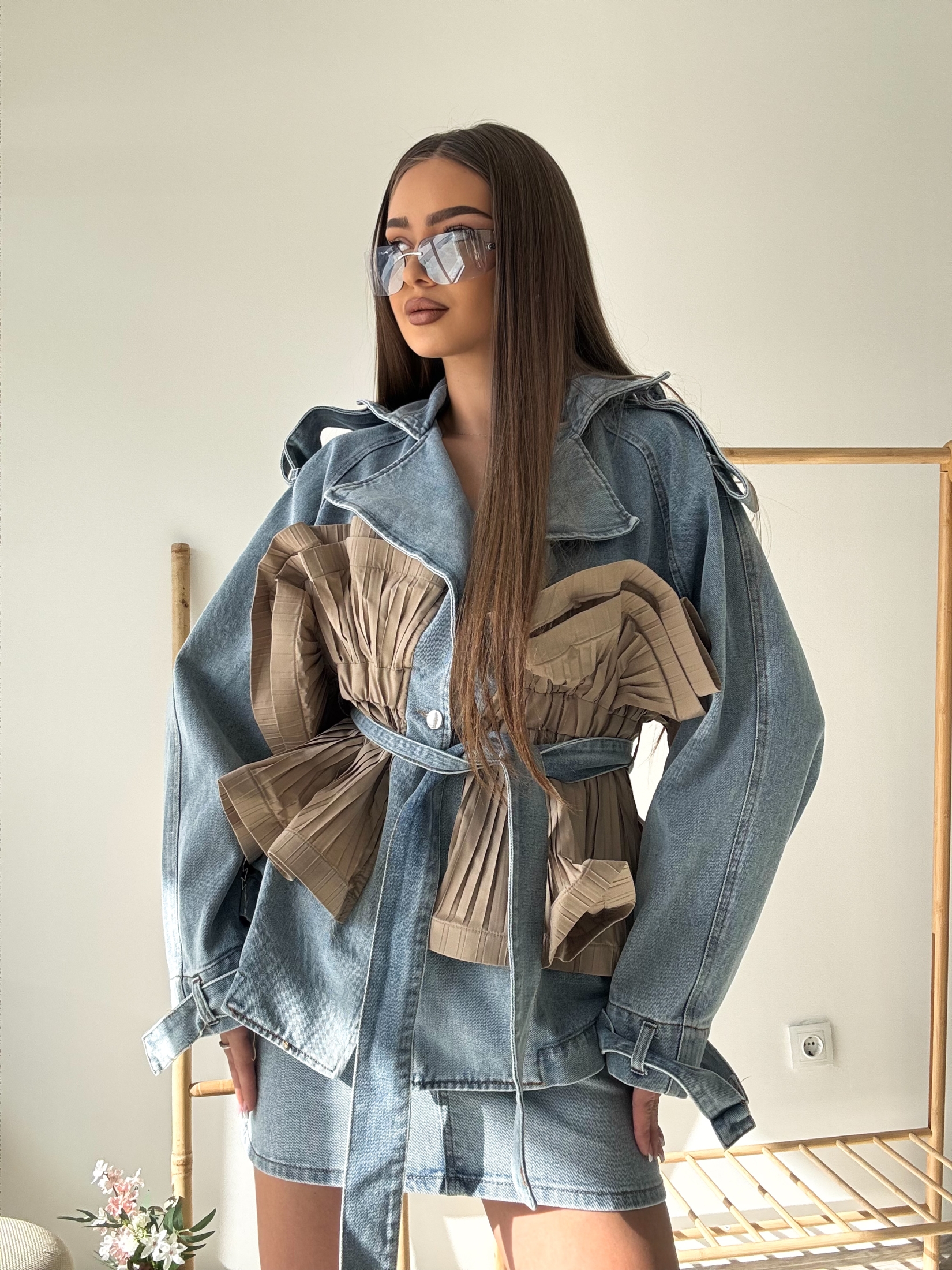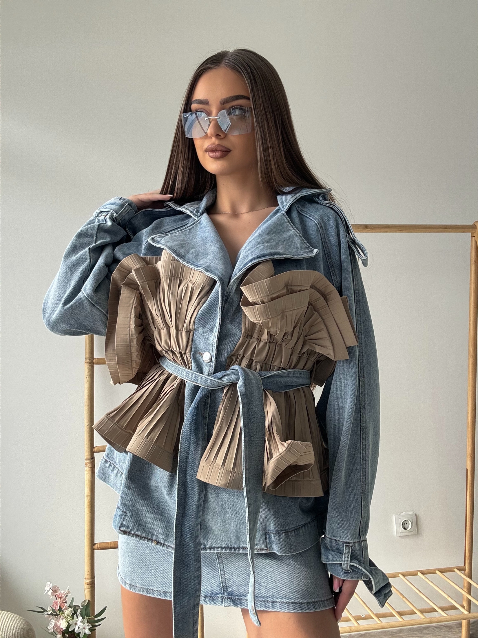 Ефектно дамско яке, съчетаващо модерна визия и артистичен дизайн. Моделът впечатлява с оригинални плисирани детайли в предната част, които създават обем и придават уникален характер на силуета. Якето е изработено от плътна деним материя, която осигурява комфорт и стил през преходните сезони. Моделът е с колан в талията, който подчертава фигурата и позволява регулиране на силуета. Широката яка и свободната кройка придават модерна и леко авангардна визия, подходяща както за ежедневни, така и за по-елегантни комбинации. Съчетава се отлично с поли, дънки или рокли и е перфектен избор за стилна и уверена визия.