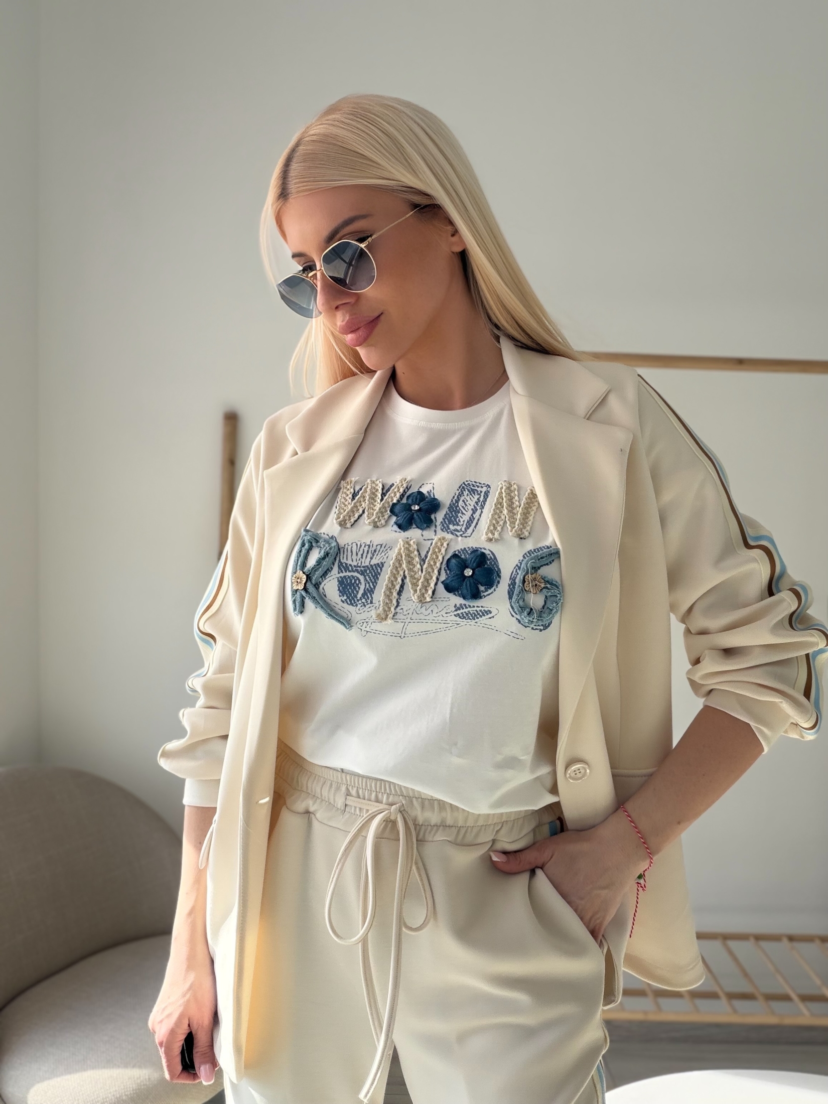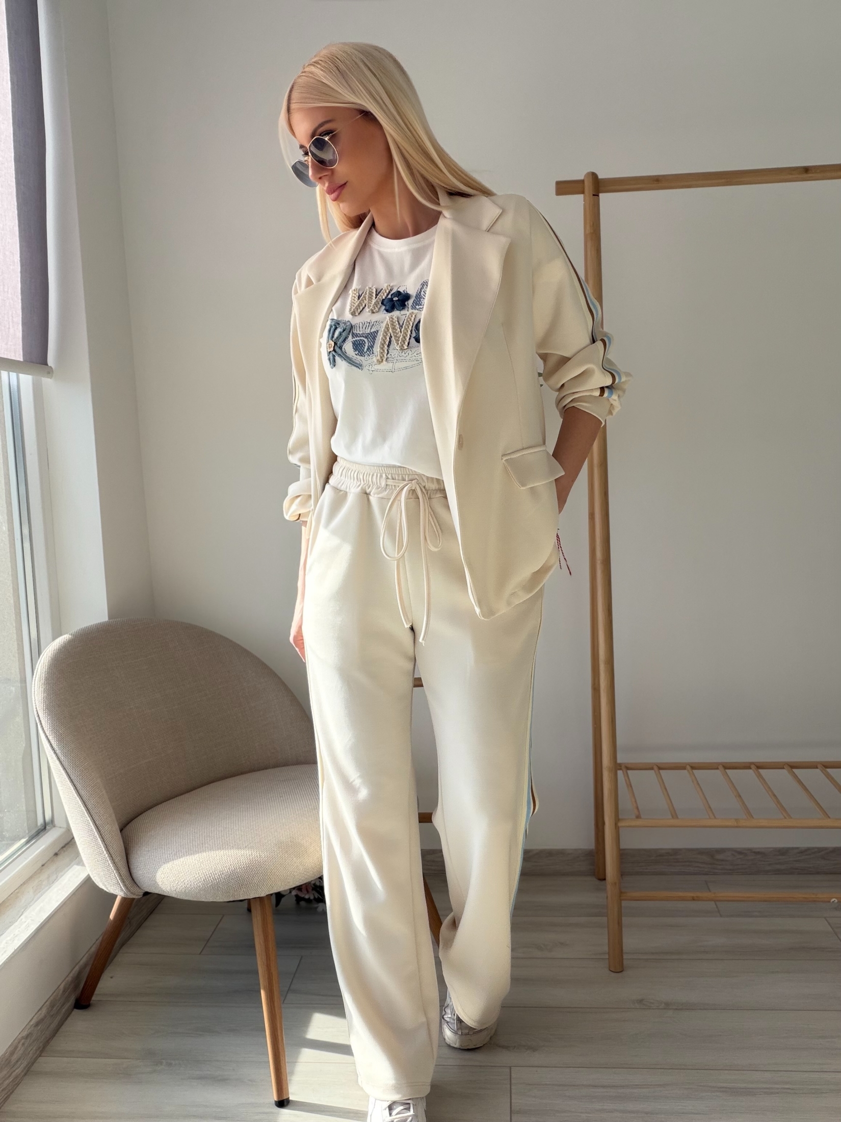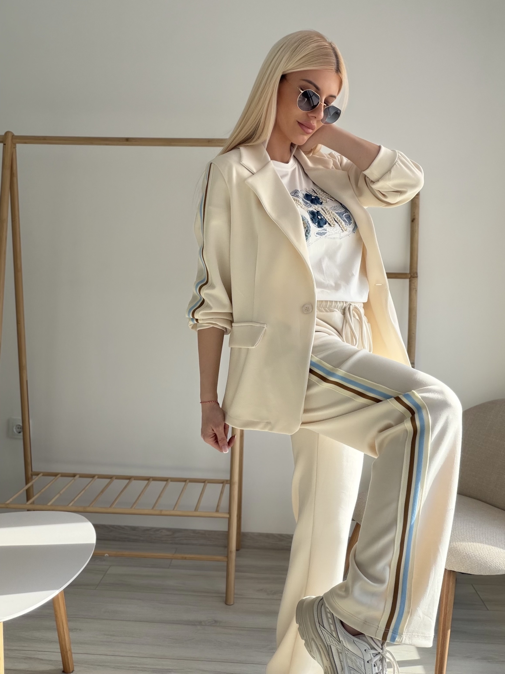 Декоративните ленти по страничната част на панталона създават издължен силует и придават модерен акцент на визията. Комплектът е перфектен избор както за ежедневни градски визии, така и за по-елегантни спортно-шик комбинации.