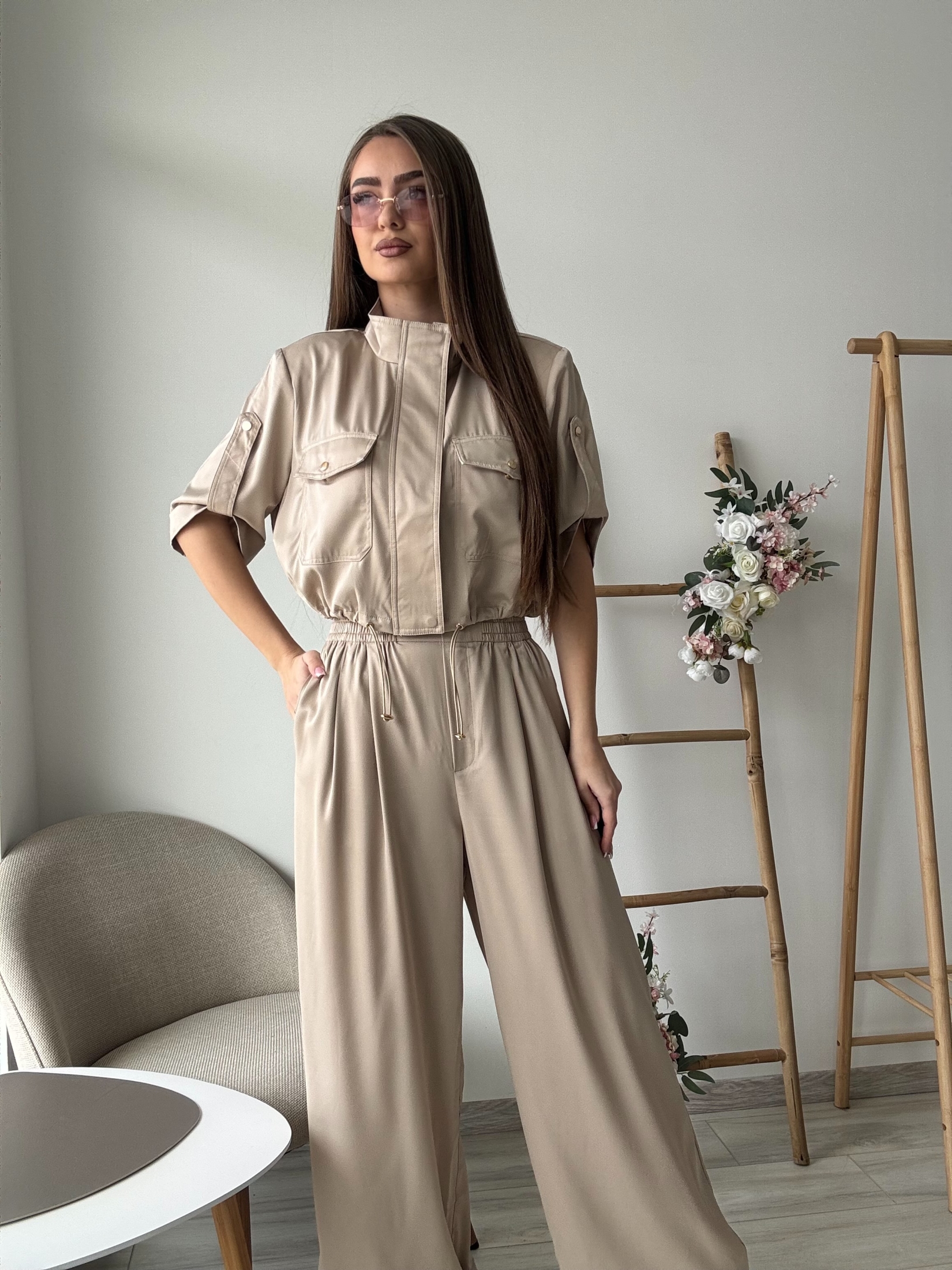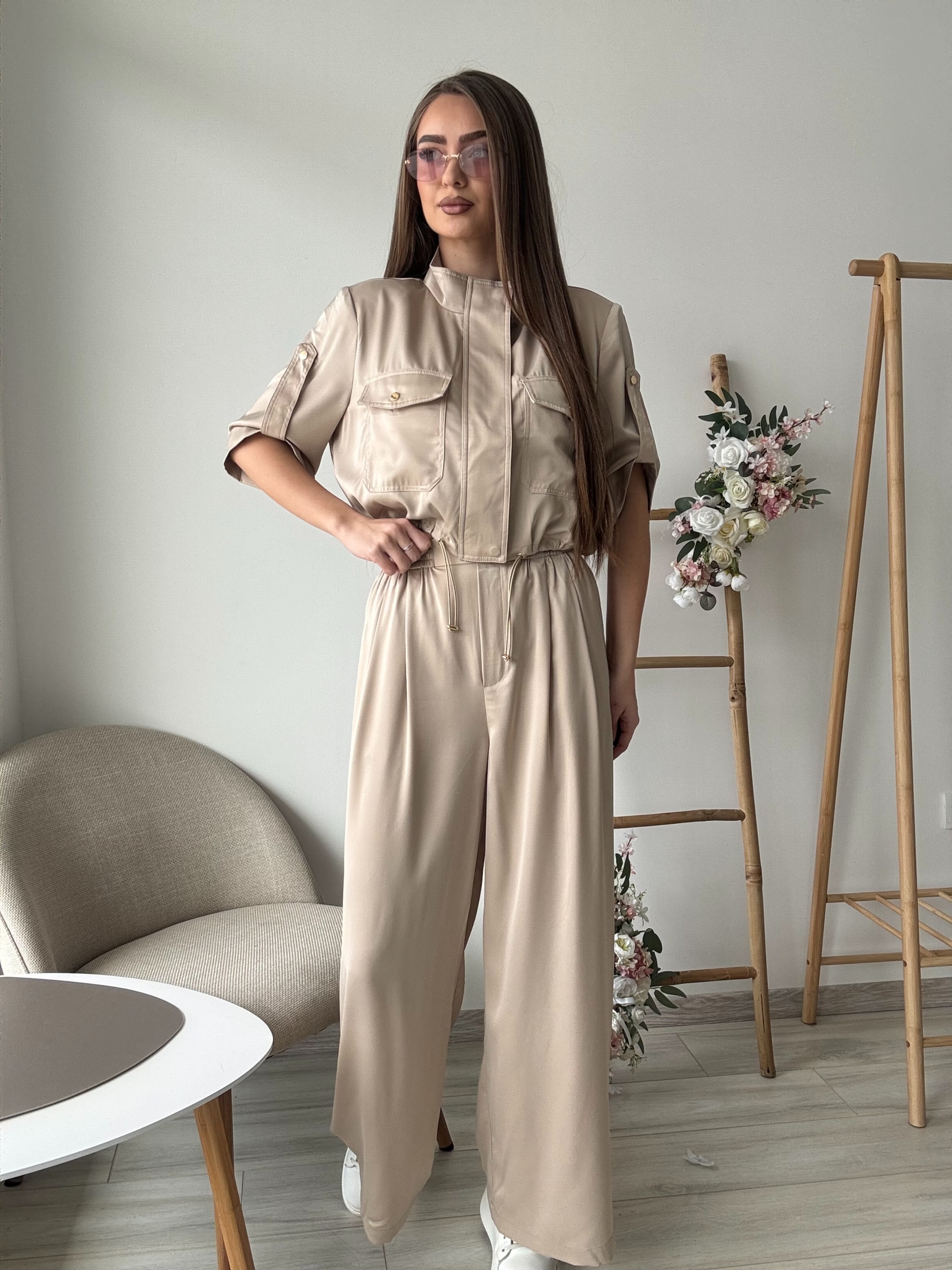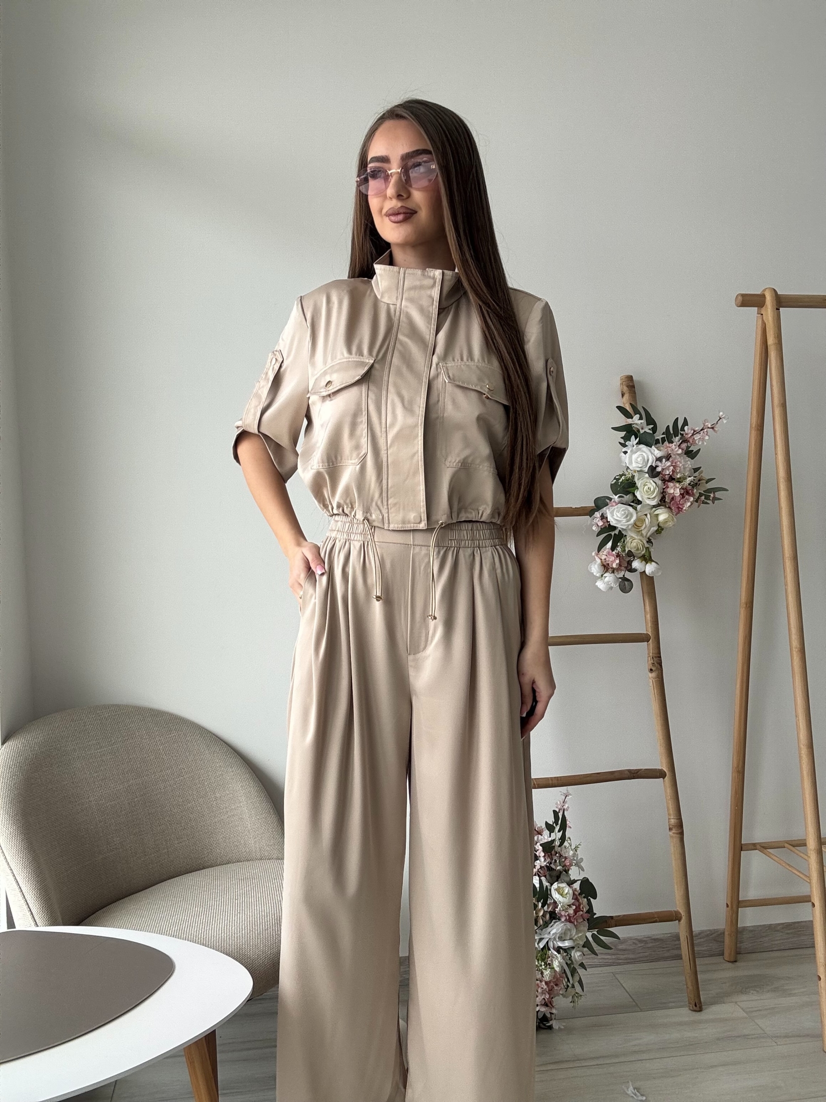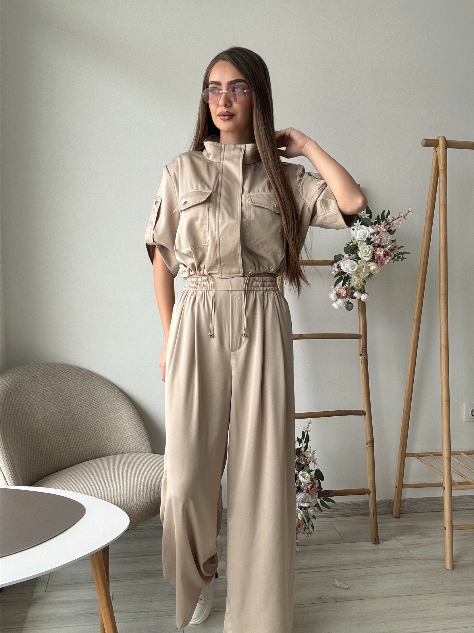 Стилен дамски комплект от две части, съчетаващ модерна визия и комфорт. Комплектът включва късо яке със свободна кройка, къс ръкав и ефектни декоративни джобове с капаци, които придават модерен и леко спортно-елегантен стил. Моделът е със столче яка и връзки в долната част, които позволяват леко регулиране и оформят силуета. Панталонът е с висока талия, ластик и връзки за допълнителен комфорт, както и с практични странични джобове. Широката крачолна линия създава елегантна и издължена визия, като същевременно осигурява свобода на движение.