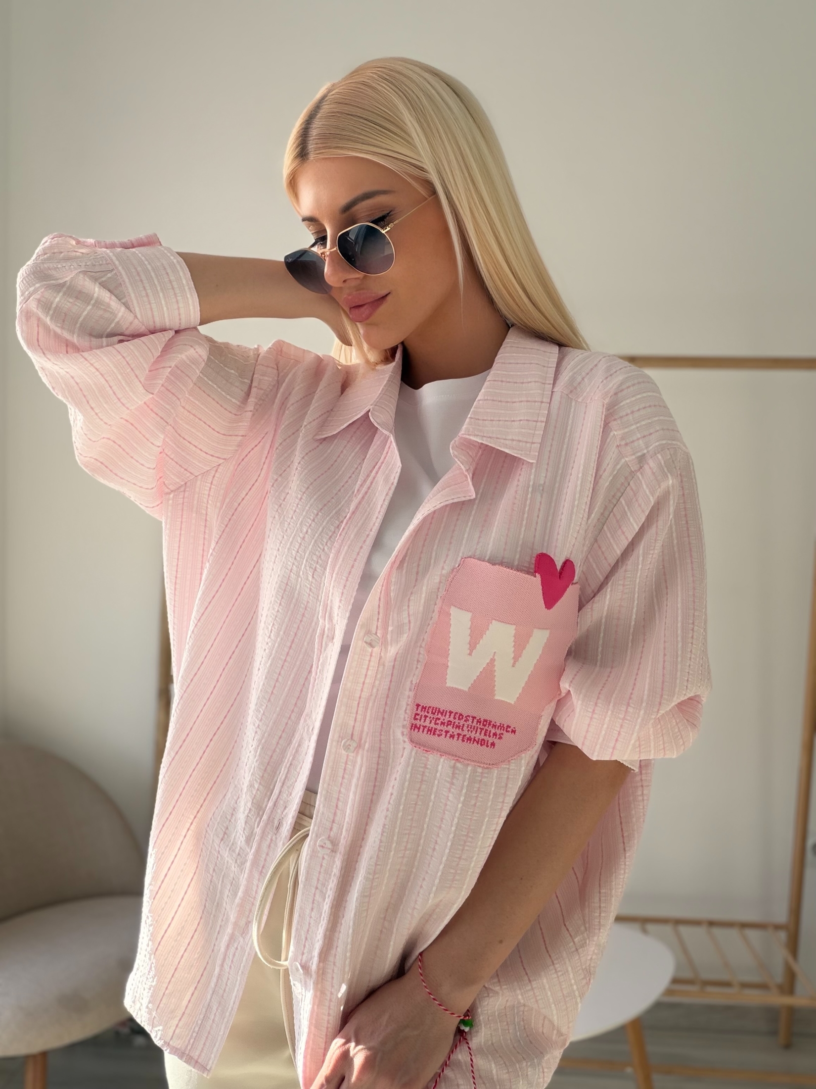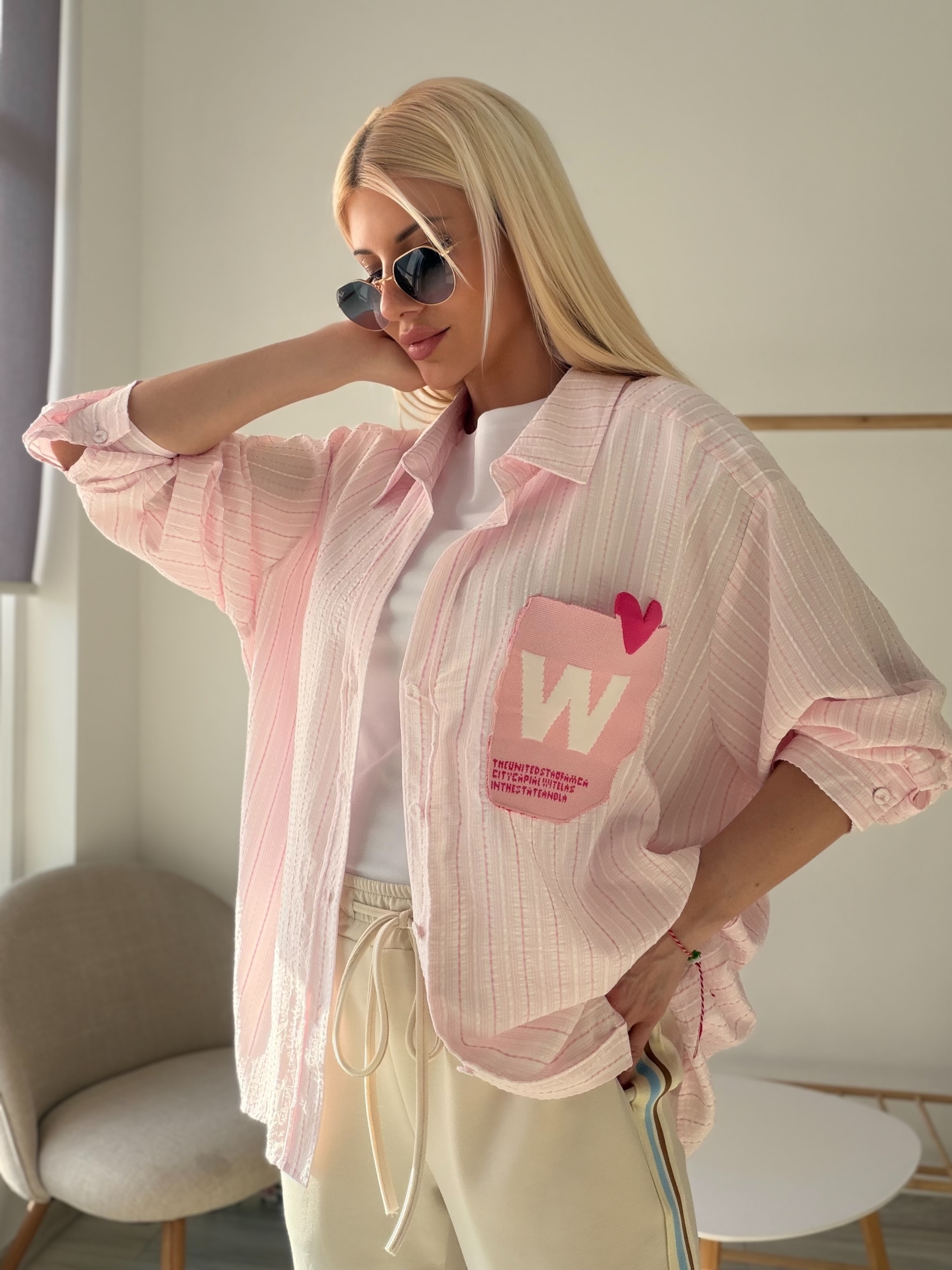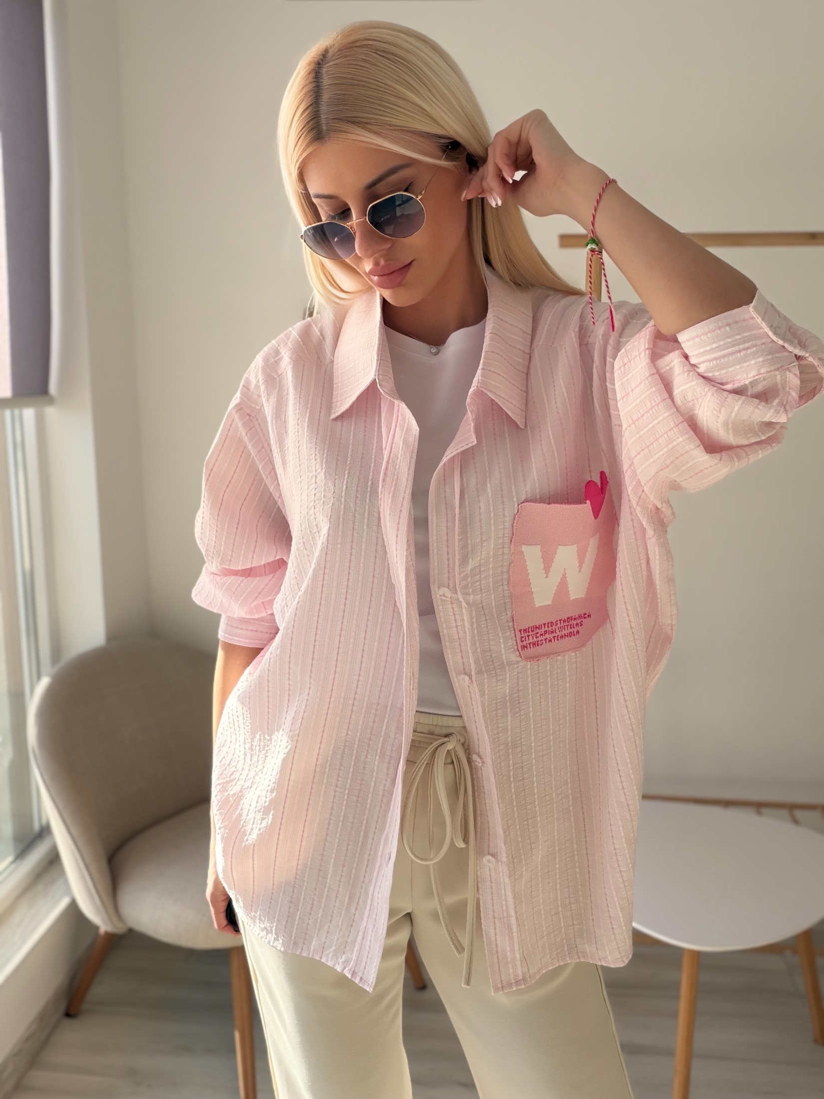 Стилна дамска риза със свободна кройка, която съчетава комфорт и модерна визия. Моделът е с класическа яка, закопчаване с копчета по цялата дължина и дълъг ръкав с възможност за подгъване. Акцент в дизайна е големият преден джоб с декоративна буква и сърце, които придават свеж и закачлив характер на визията. Ризата е изработена от лека и приятна на допир материя, подходяща за ежедневни и спортно-елегантни комбинации. Лесно се съчетава както с дънки, така и с панталони или къси панталонки.