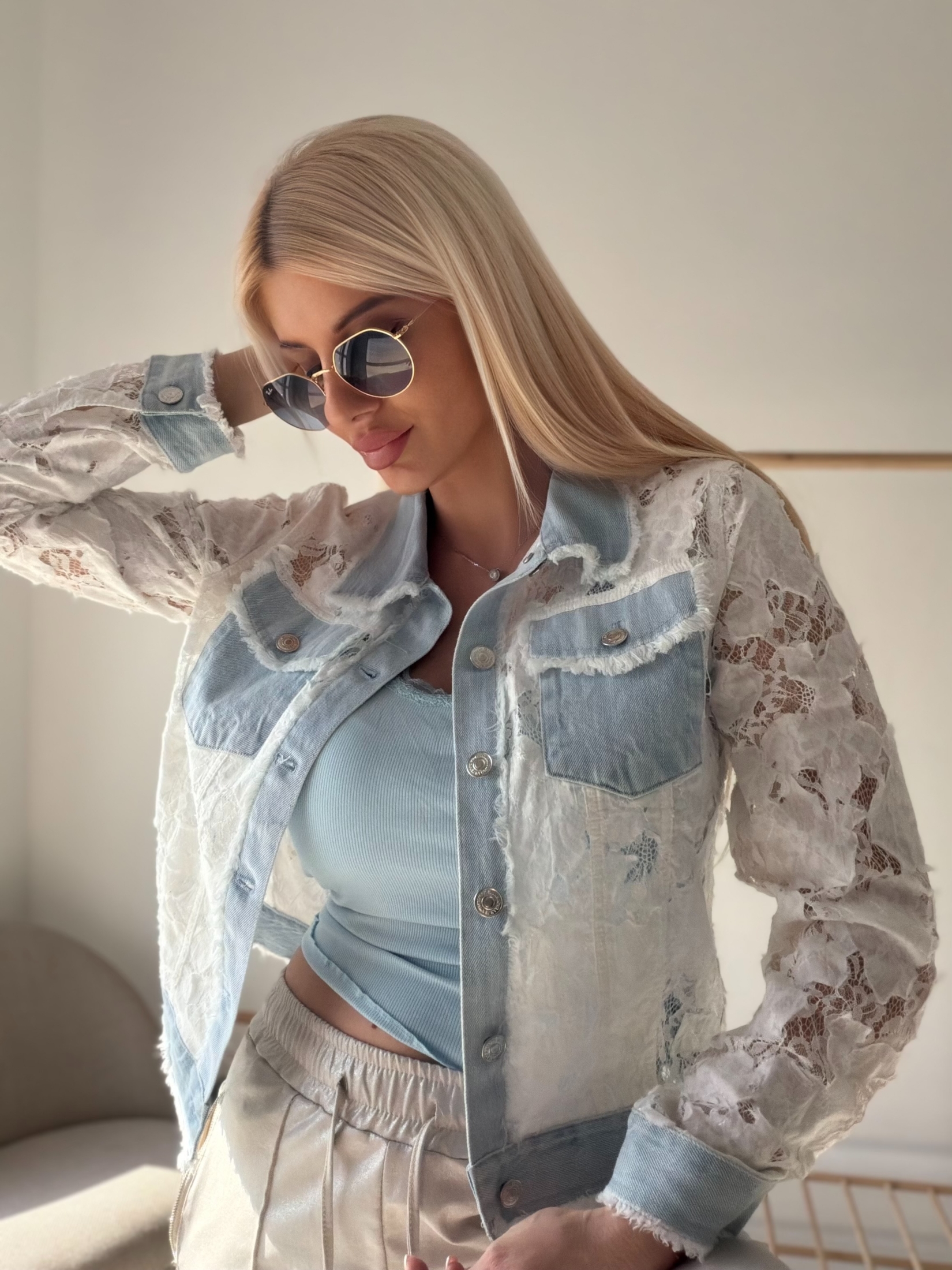 Стилно и различно яке, което комбинира класически деним с нежна дантела за модерен и женствен вид. Моделът е с декоративни джобове и копчета, придаващи леко небрежен, но елегантен характер. Дантелените елементи създават усещане за лекота и романтика, а деним акцентите добавят структура и стил.