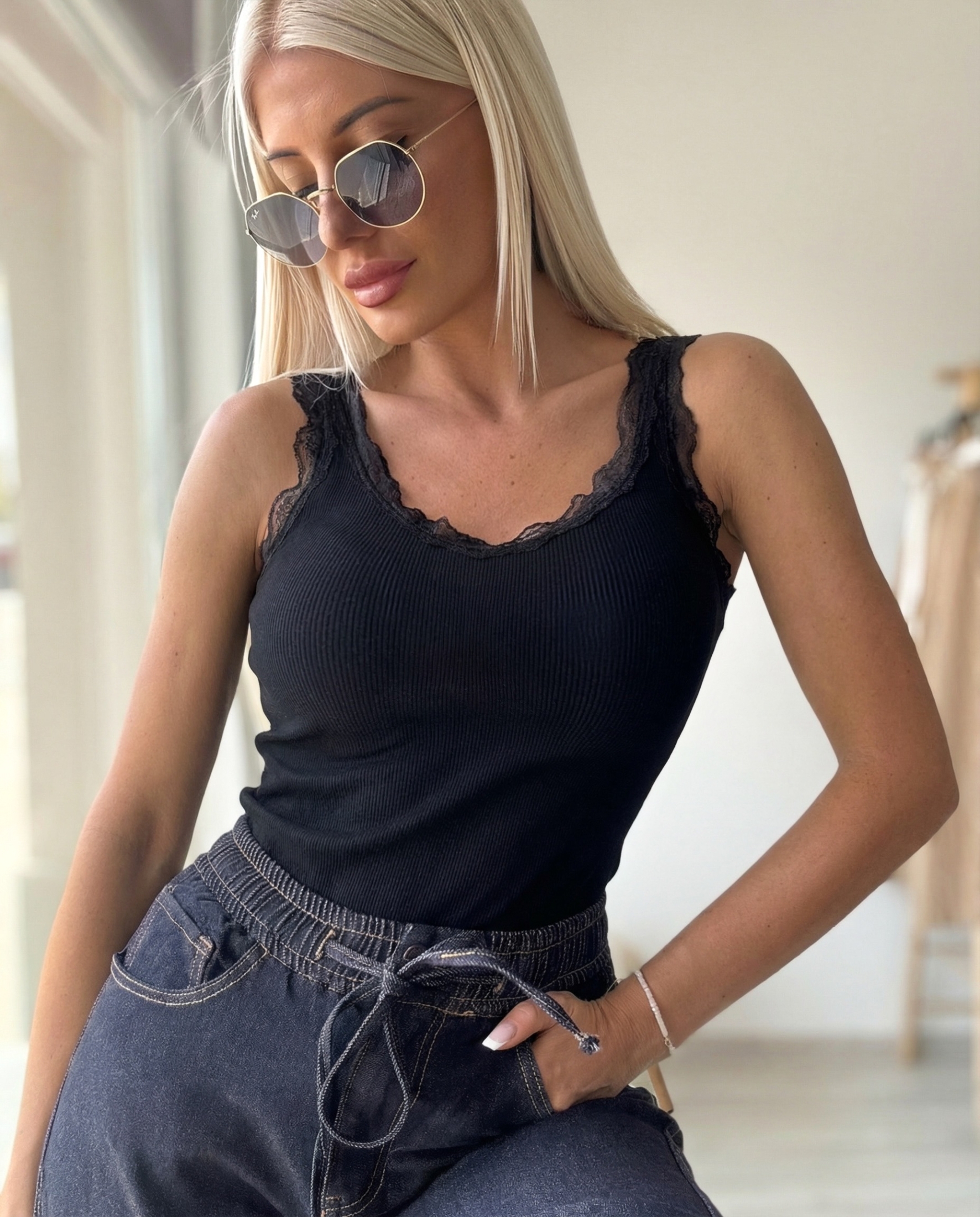Дамски потник със скъсена кройка, съчетаващ комфорт и женственост. Моделът е изработен от силно еластична материя, която прилепва идеално по тялото и подчертава силуета. Разполага с вградени чашки за допълнителна опора и удобство, без необходимост от сутиен. Деликатната дантела по деколтето придава нежен и елегантен завършек. Перфектен избор както за ежедневието, така и за по-стилен аутфит.