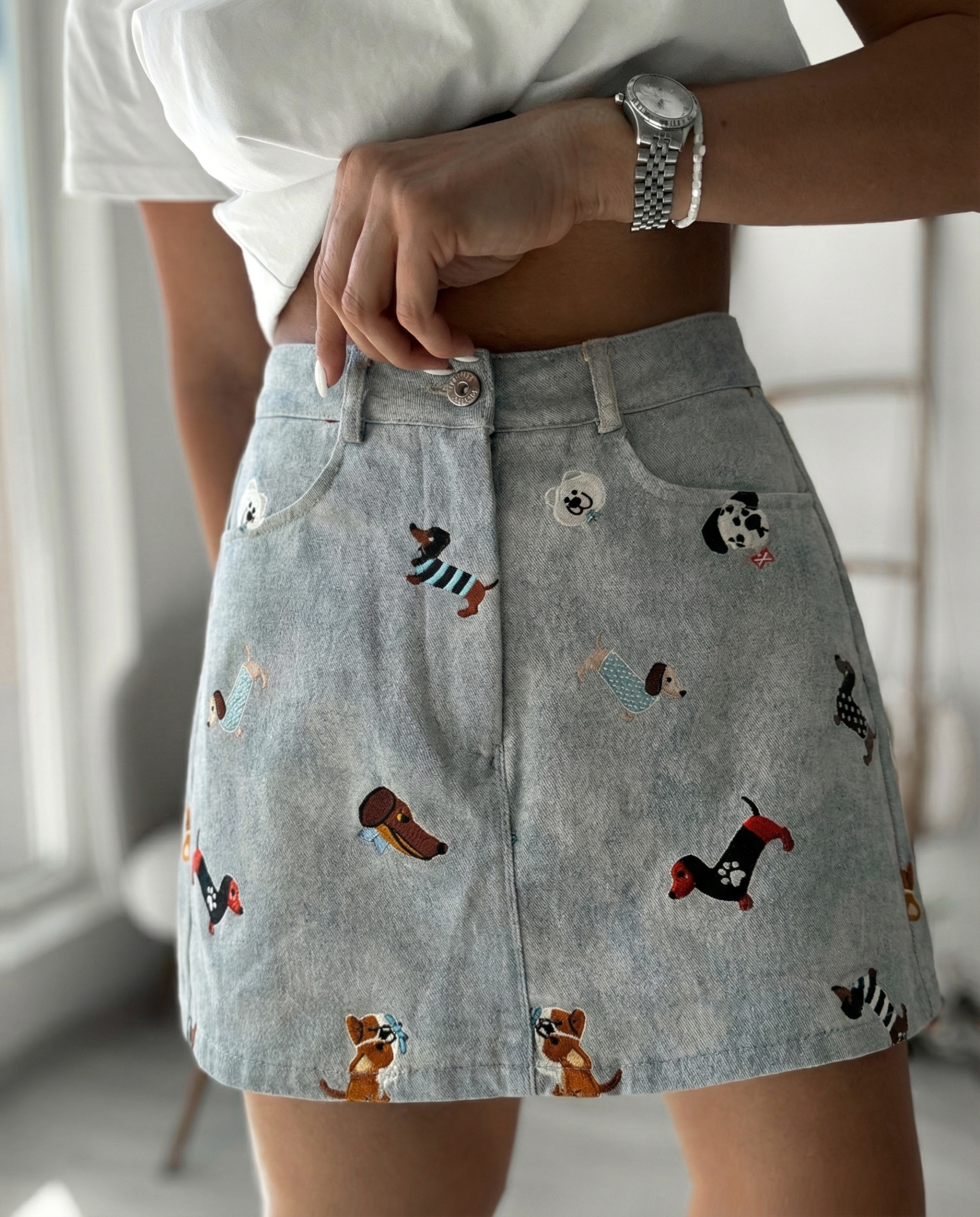 Изработена от качествен деним с лека еластичност, материята приляга добре по тялото и запазва формата си. Декоративните кученца добавят закачлив акцент и правят модела отличителен и запомнящ се.
