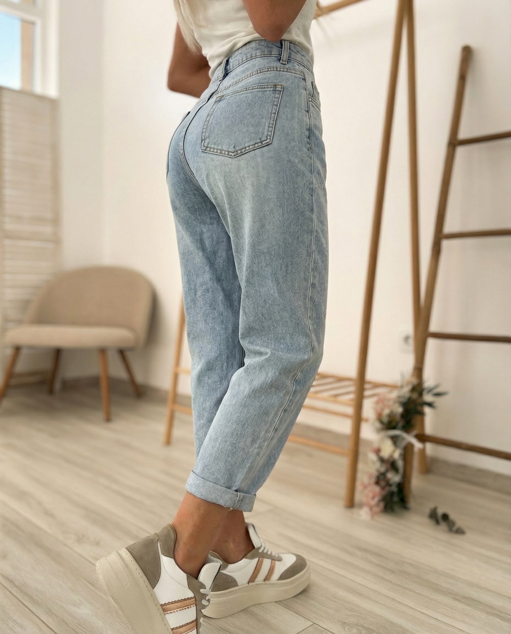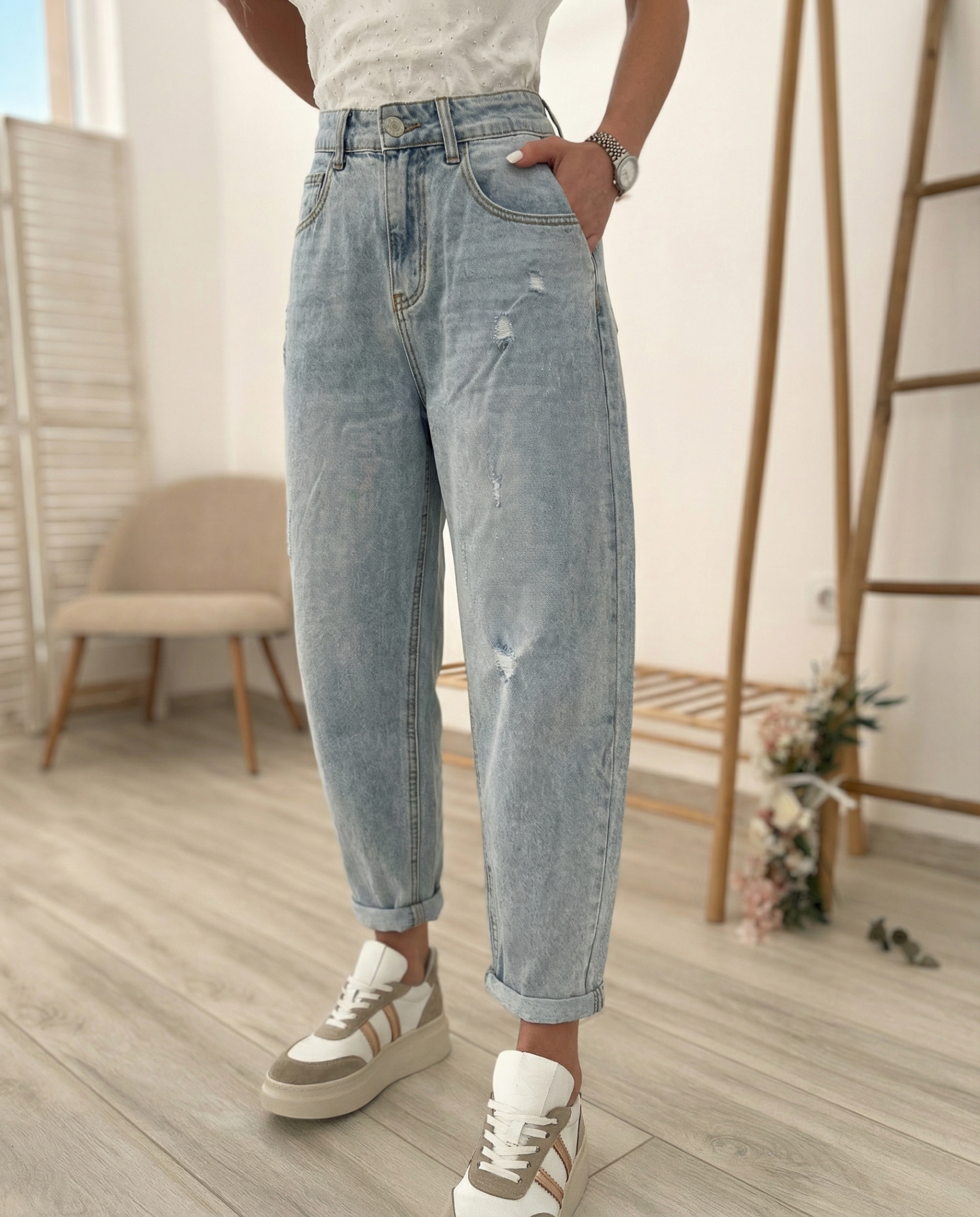 Модерни дънки с висока талия и свободна кройка, които съчетават комфорт и стил в едно. Моделът е с леко скъсени крачоли и навит подгъв, придаващи небрежна и актуална визия. Фините протривания добавят характер и модерно излъчване.