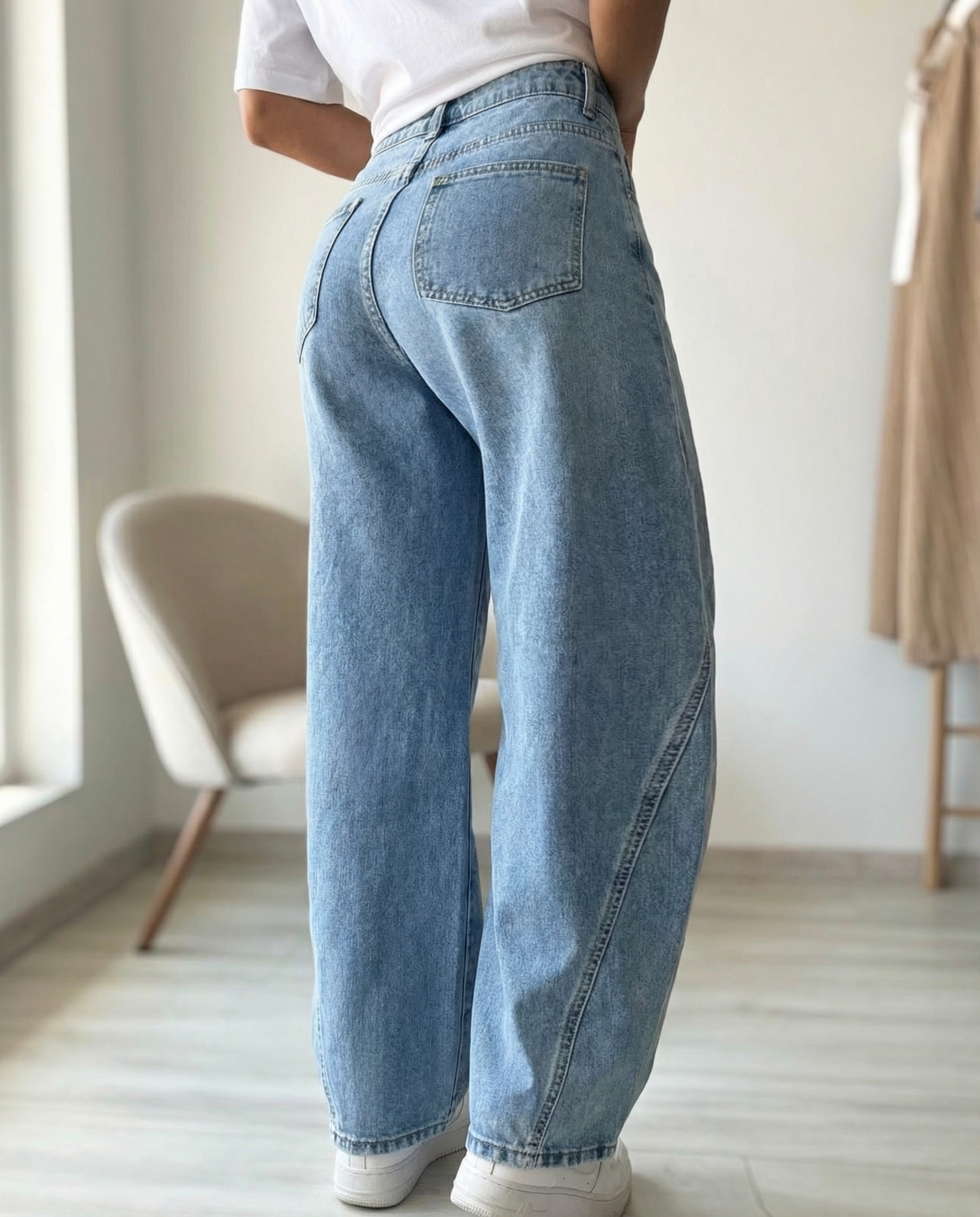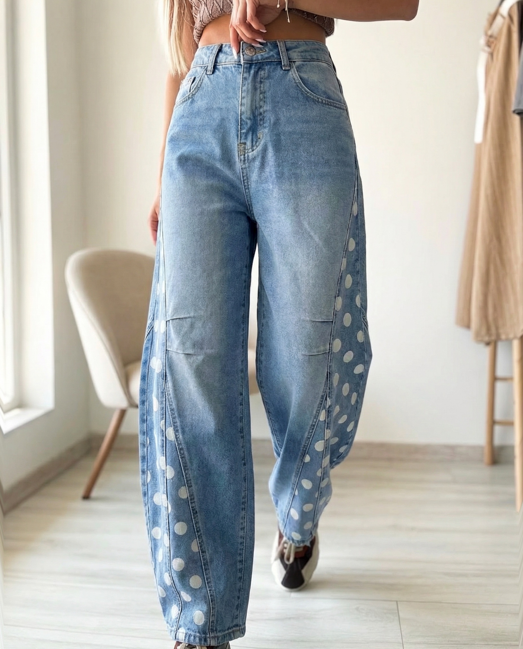 Модерни дамски дънки тип балон (balloon fit) с висока талия и свободна, обемна кройка, която се стеснява леко към глезена. Моделът придава тренди силует и осигурява максимален комфорт при носене. Акцентът пада върху страничните панели с точки, които добавят закачлив и отличителен стил към класическия деним.