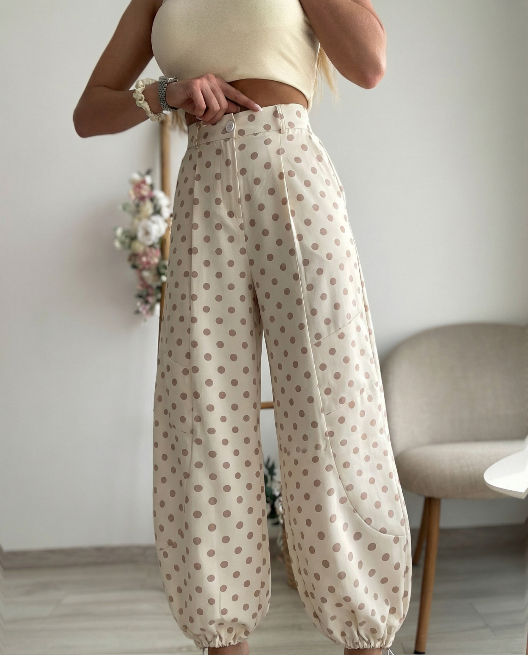Стилен дамски панталон тип „балон“ с висока талия и модерна, свободна кройка, която придава обем и уникален силует. Моделът е с ефектен десен на точки и колан с копче, който красиво подчертава талията.