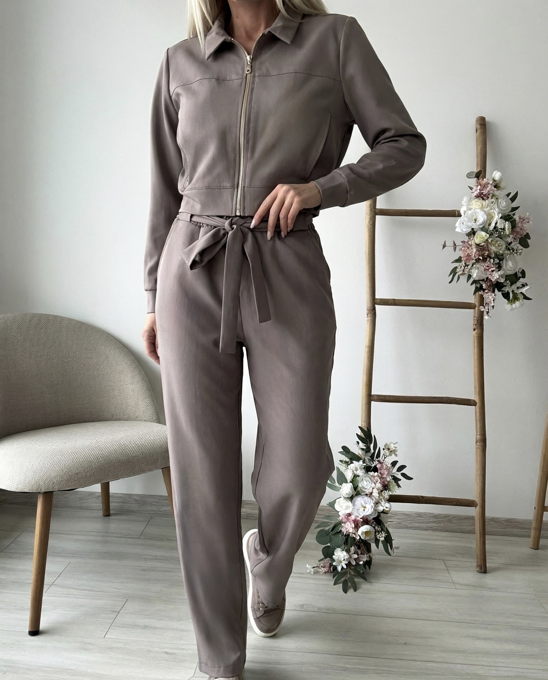 Стилен сатениран комплект от две части, съчетаващ комфорт и елегантност в едно. Горната част е с изчистен дизайн, класическа яка и цип отпред, което придава модерно и практично излъчване. Дългите ръкави и леко вталената кройка подчертават силуета по фин начин. Панталонът е с висока талия и колан за връзване, който оформя красиво фигурата и добавя женствен акцент. Материята е гладка, с лек сатениран блясък, пада нежно по тялото и осигурява усещане за лекота и комфорт през целия ден. Подходящ както за ежедневието, така и за по-елегантни поводи – лесно се комбинира с маратонки за небрежна визия или с обувки на ток за по-изискан стил.