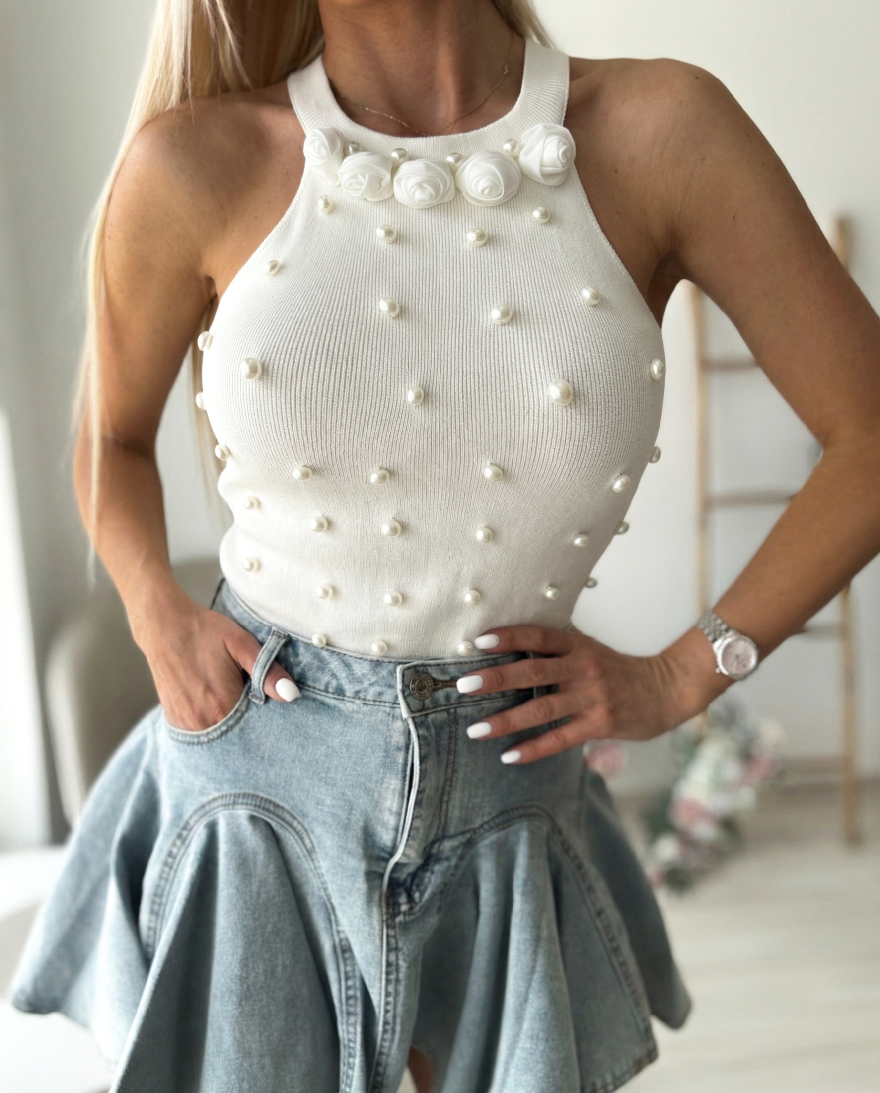 Начало Блузи Бял потник плетиво с перли