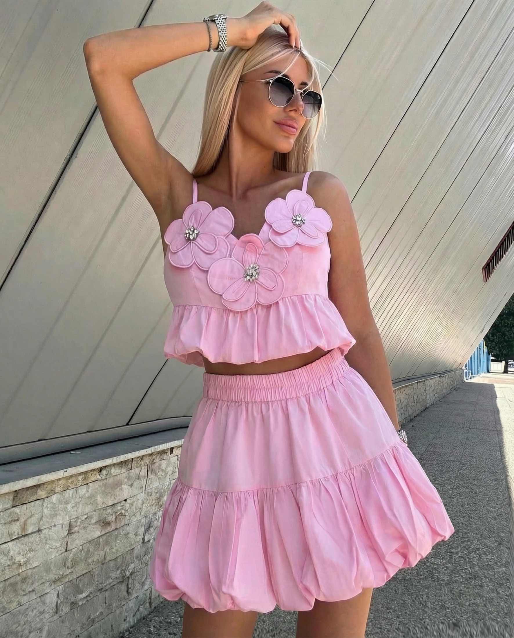 Стилен дамски комплект от две части, съчетаващ женственост и модерно излъчване. Късият топ е с тънки презрамки и впечатляващи 3D флорални апликации с деликатни камъчета в центъра, които придават ефектен и романтичен акцент. Долната част е с висока талия и еластичен колан за комфорт, а разкроеният силует с обем в долната част оформя красива и игрива линия.