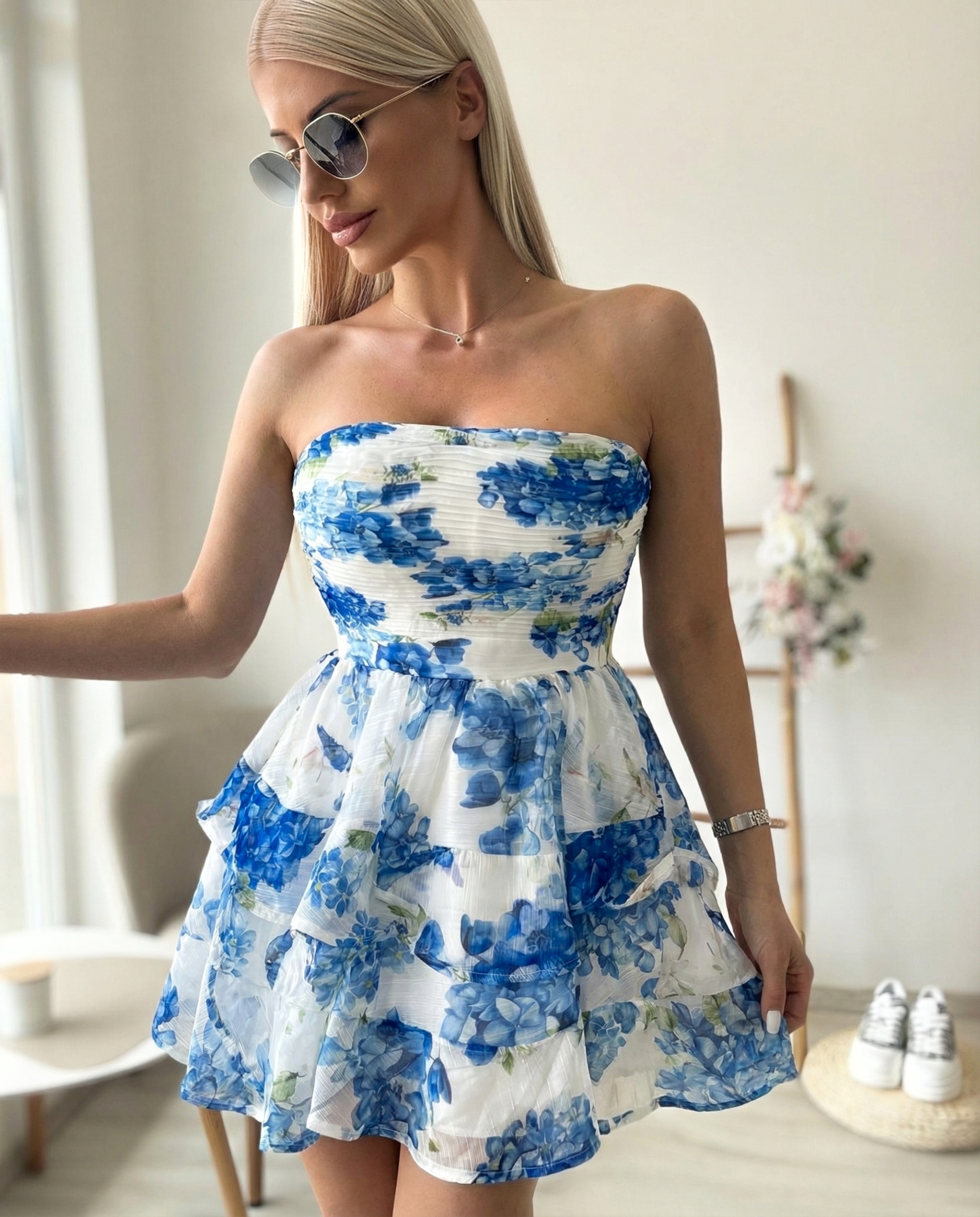 Ефирна дамска рокля с романтично и свежо излъчване, създадена да подчертае женствеността по изключително нежен начин. Моделът е с бюстие тип бюстие без презрамки, което оформя красиво горната част, а подчертаната талия създава елегантен силует. Долната част е изградена от многопластови волани, които придават обем, лекота и движение при всяка крачка. Финият флорален десен добавя свежест и лятно настроение, превръщайки роклята в перфектен избор за топлите дни. Подходяща както за разходки, почивки и ежедневни визии, така и за специални поводи, когато искаш да изглеждаш нежно, стилно и впечатляващо.