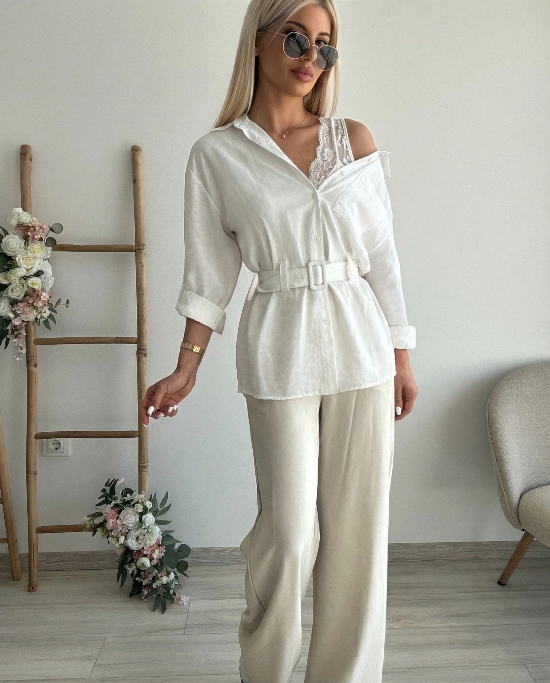 Дантеленият потник отдолу допълва визията с нежност и финес. Изящната дантела придава романтично излъчване и леко провокативен акцент, който се подава деликатно под ризата.