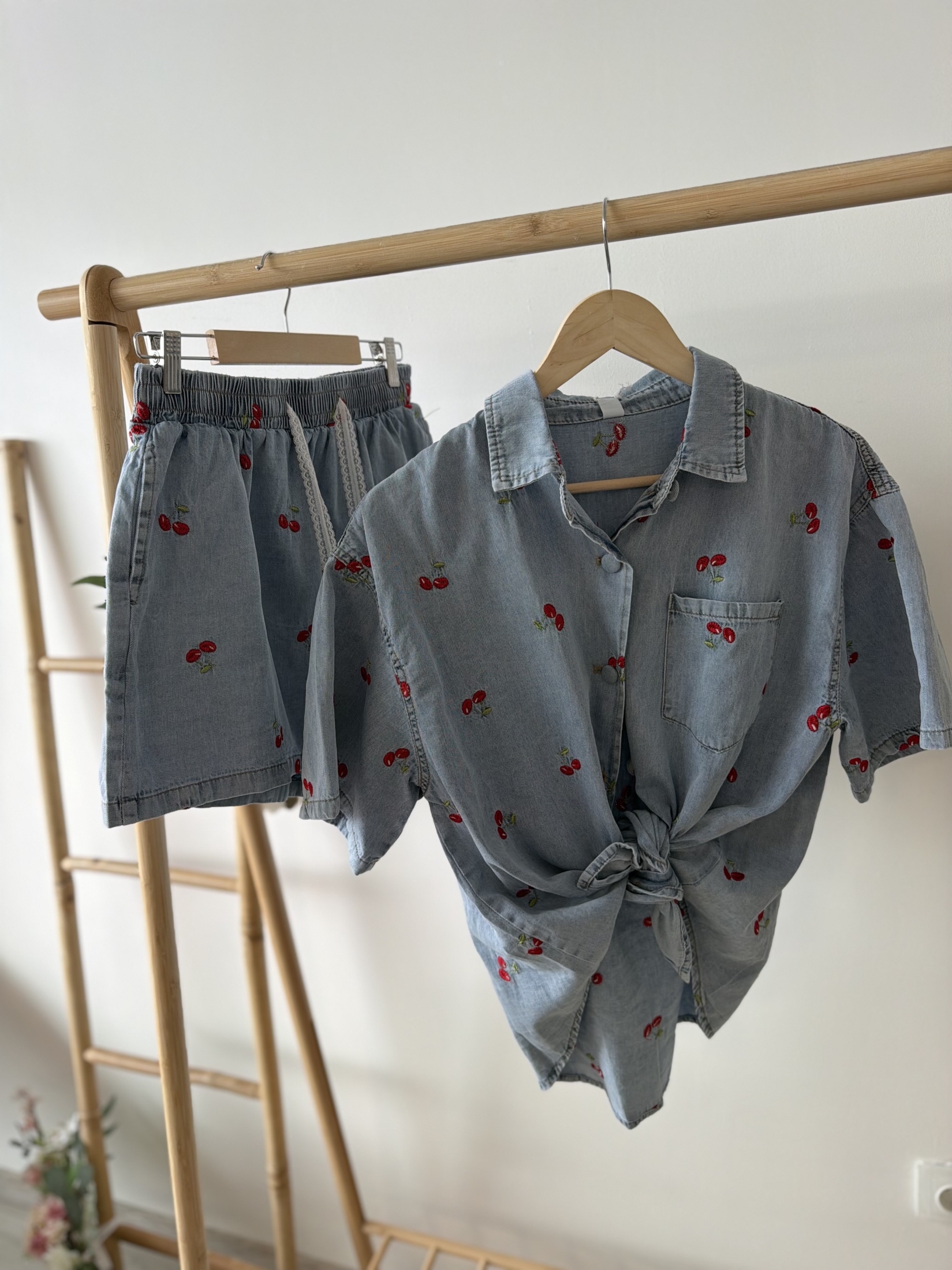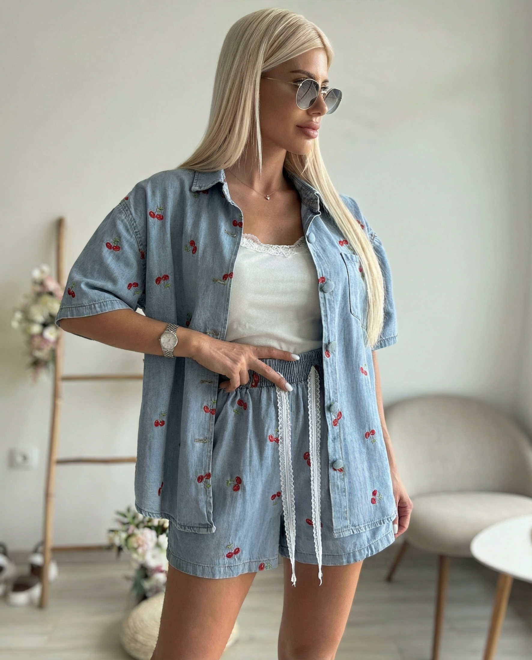 Стилен дамски дънков комплект от риза и къси панталонки, съчетаващ удобство и модерна визия. Ризата е с класическа яка, закопчаване с копчета и свободна кройка, която придава небрежен, но изискан силует. Панталонките са с висока талия и ластик, осигуряващ комфорт и отлично прилягане. Дънковата материя е мека и лека, подходяща за ежедневието през топлите дни. Деликатният десен добавя свеж акцент и прави комплекта отличим и женствен. ✔ Дънкова материя ✔ Свободна и удобна кройка ✔ Ластична талия ✔ Подходящ за ежедневие и почивка