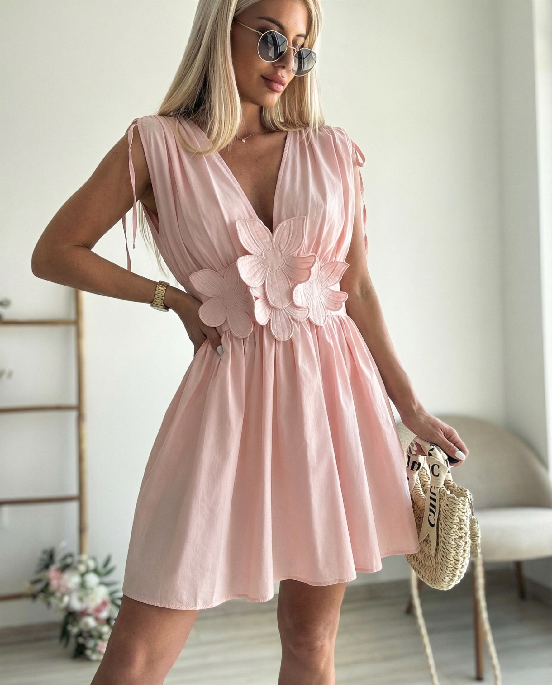 Ефирна и женствена рокля с нежен силует, създадена да подчертае фигурата с лекота и стил. Моделът е с дълбоко V-образно деколте и свободно падаща долна част, която придава усещане за лекота и движение. Акцентът е в талията – декорирана с обемни 3D флорални апликации, които придават романтичен и запомнящ се завършек. Фините връзки на раменете добавят деликатен детайл и възможност за леко регулиране.