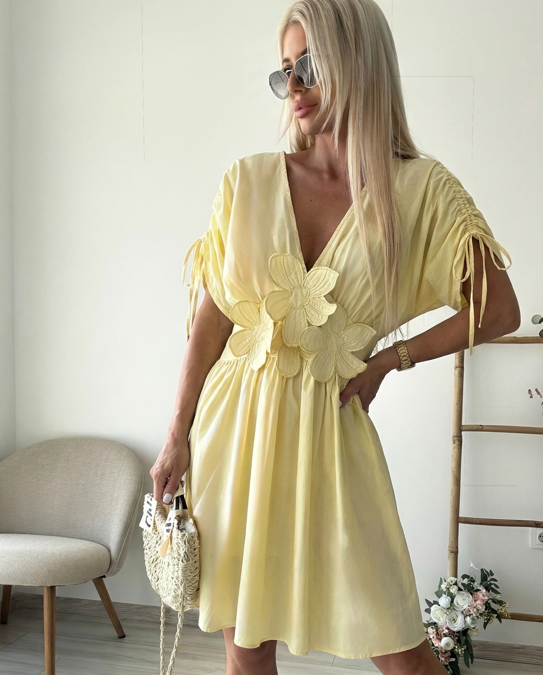 Ефирна и женствена рокля с нежен силует, създадена да подчертае фигурата с лекота и стил. Моделът е с дълбоко V-образно деколте и свободно падаща долна част, която придава усещане за лекота и движение. Акцентът е в талията – декорирана с обемни 3D флорални апликации, които придават романтичен и запомнящ се завършек. Фините връзки на раменете добавят деликатен детайл и възможност за леко регулиране.