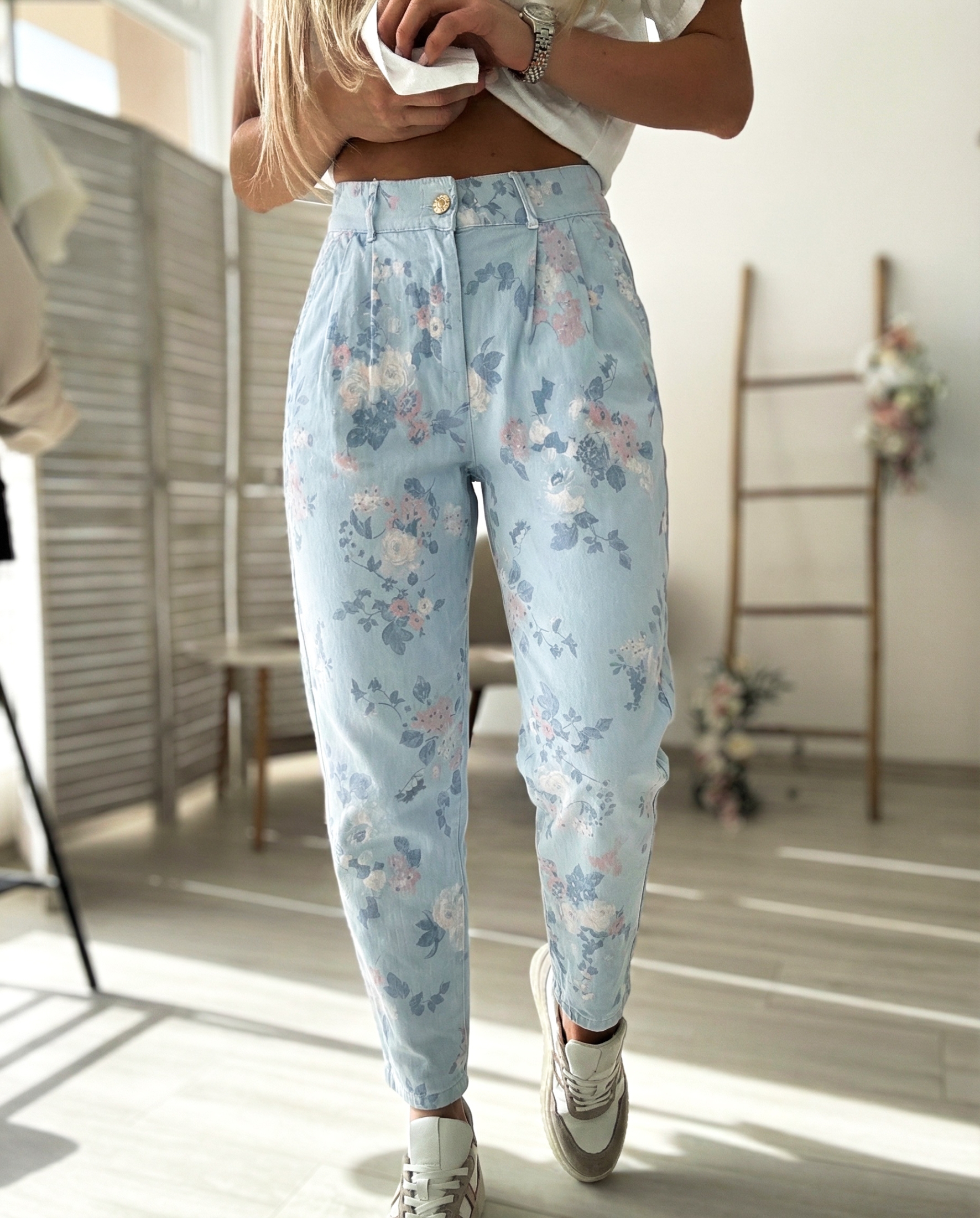 Стилен дамски панталон с нежен флорален принт, съчетаващ комфорт и елегантност в едно. Моделът е с висока талия и свободна права кройка, която издължава силуета и придава изискано излъчване. Фината материя осигурява лекота и удобство през целия ден, а деликатните цветни мотиви добавят романтична нотка към визията.