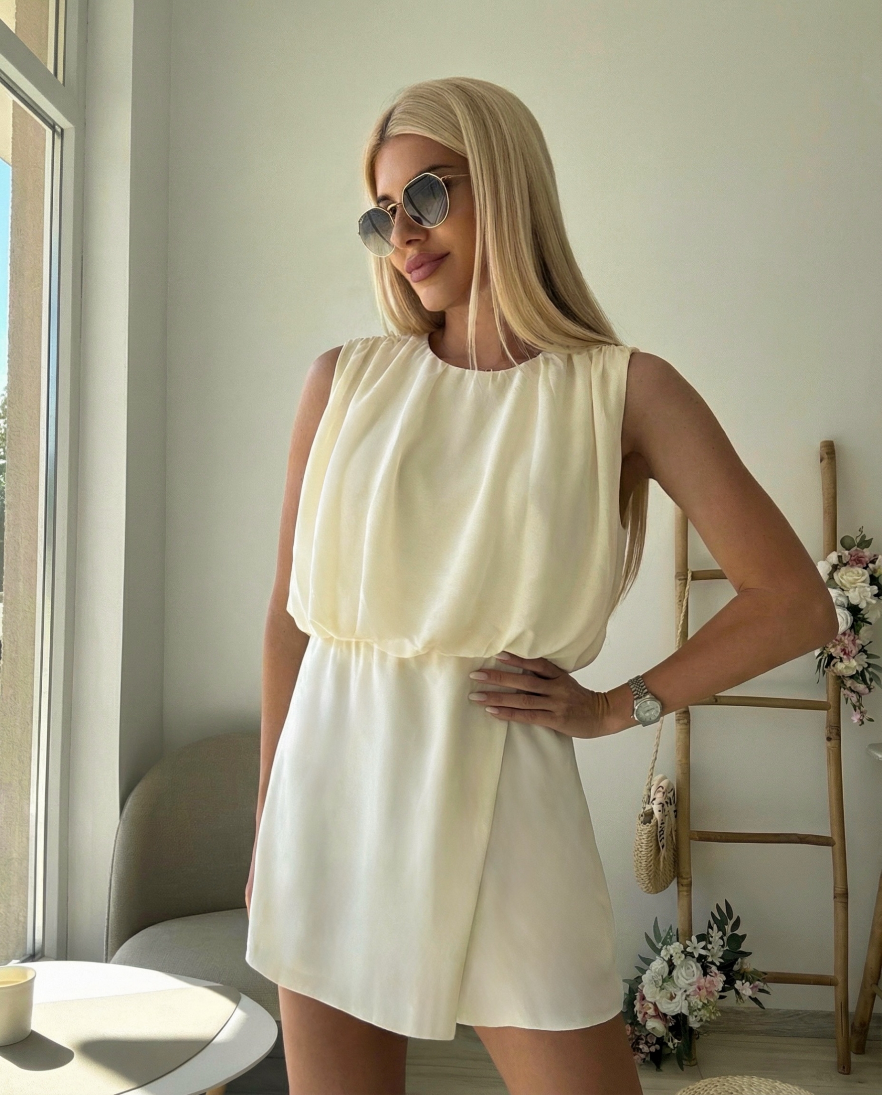Ефирна и стилна рокля с модерен силует, съчетаваща удобството на пола-панталон и елегантната визия на класическа рокля. Горната част е с леко свободна кройка и нежно набрана линия, която придава мекота и женственост, докато долната част тип пола-панталон осигурява комфорт и свобода на движение през целия ден.
